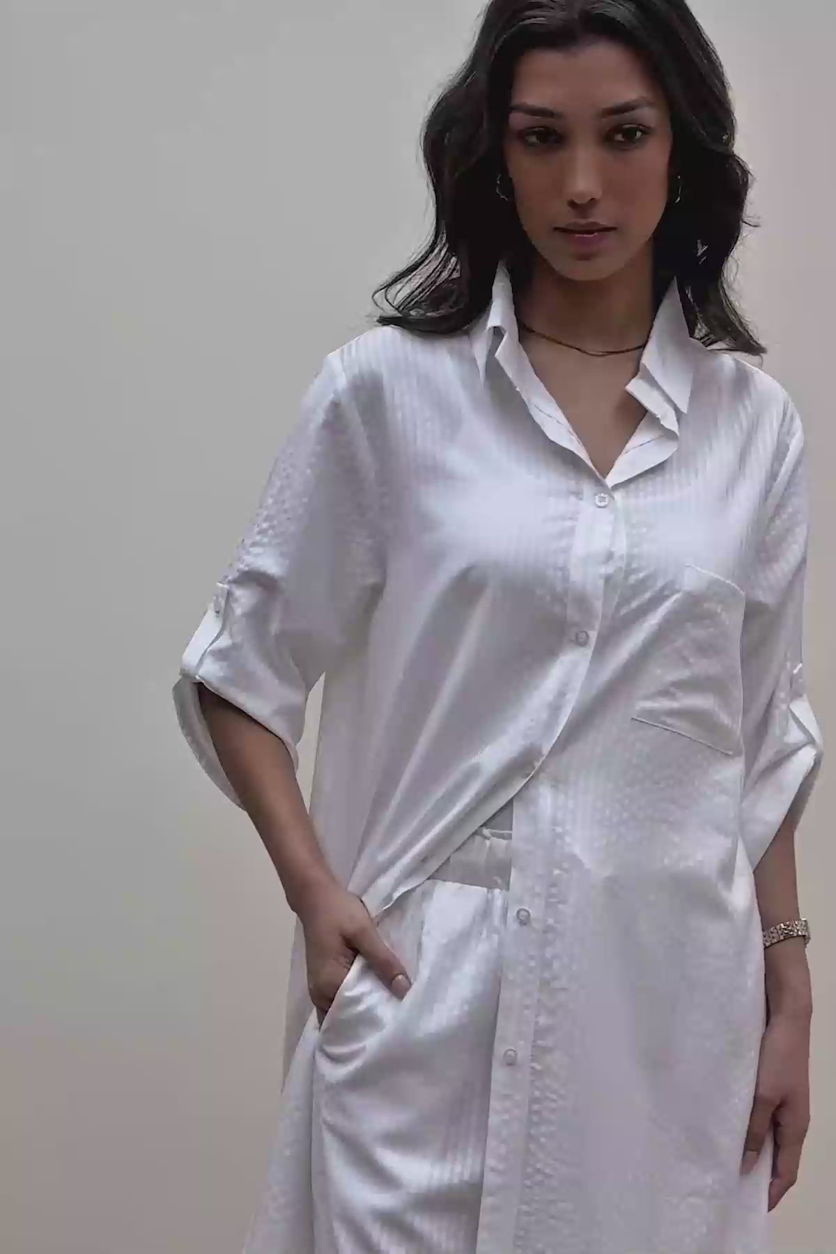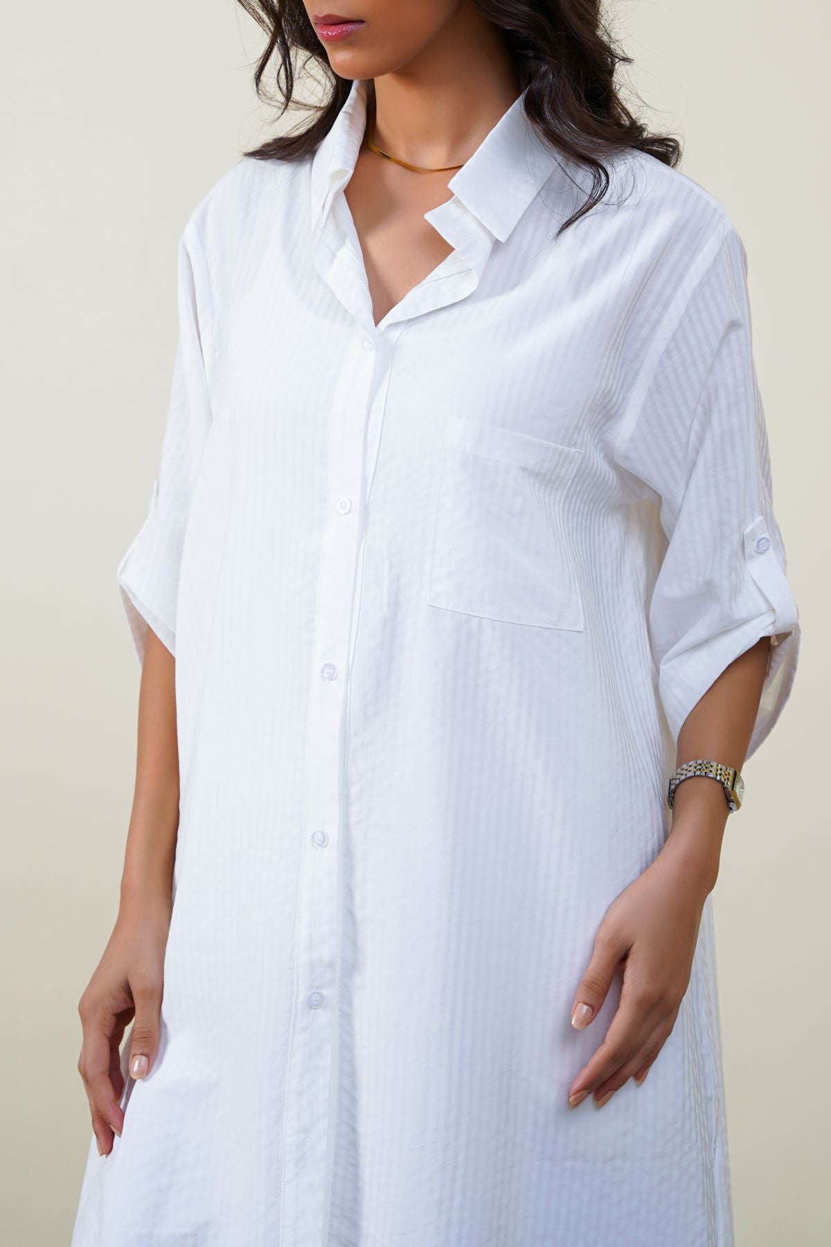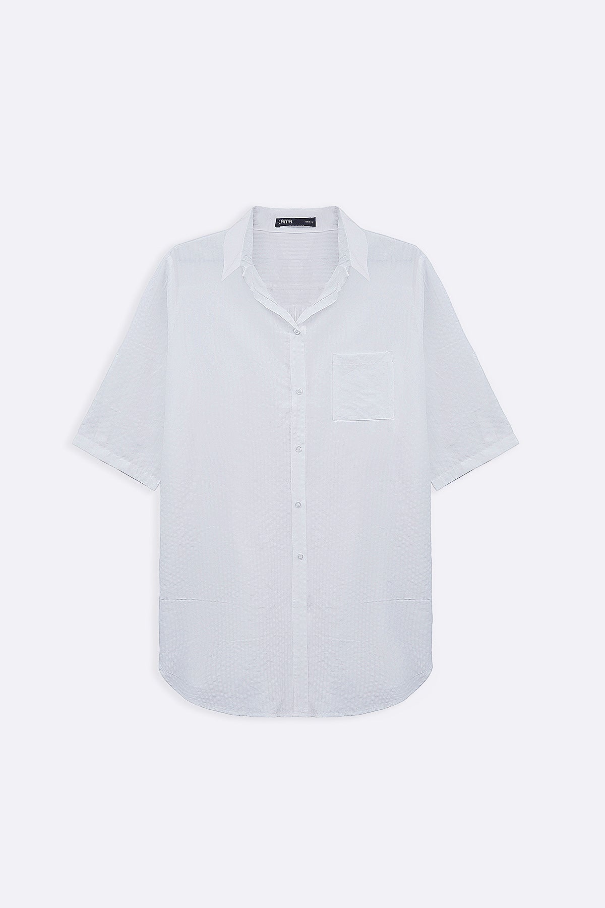 Design details: Button down tunic with three quarter sleeves, high low rounded hem and back pleat detail.