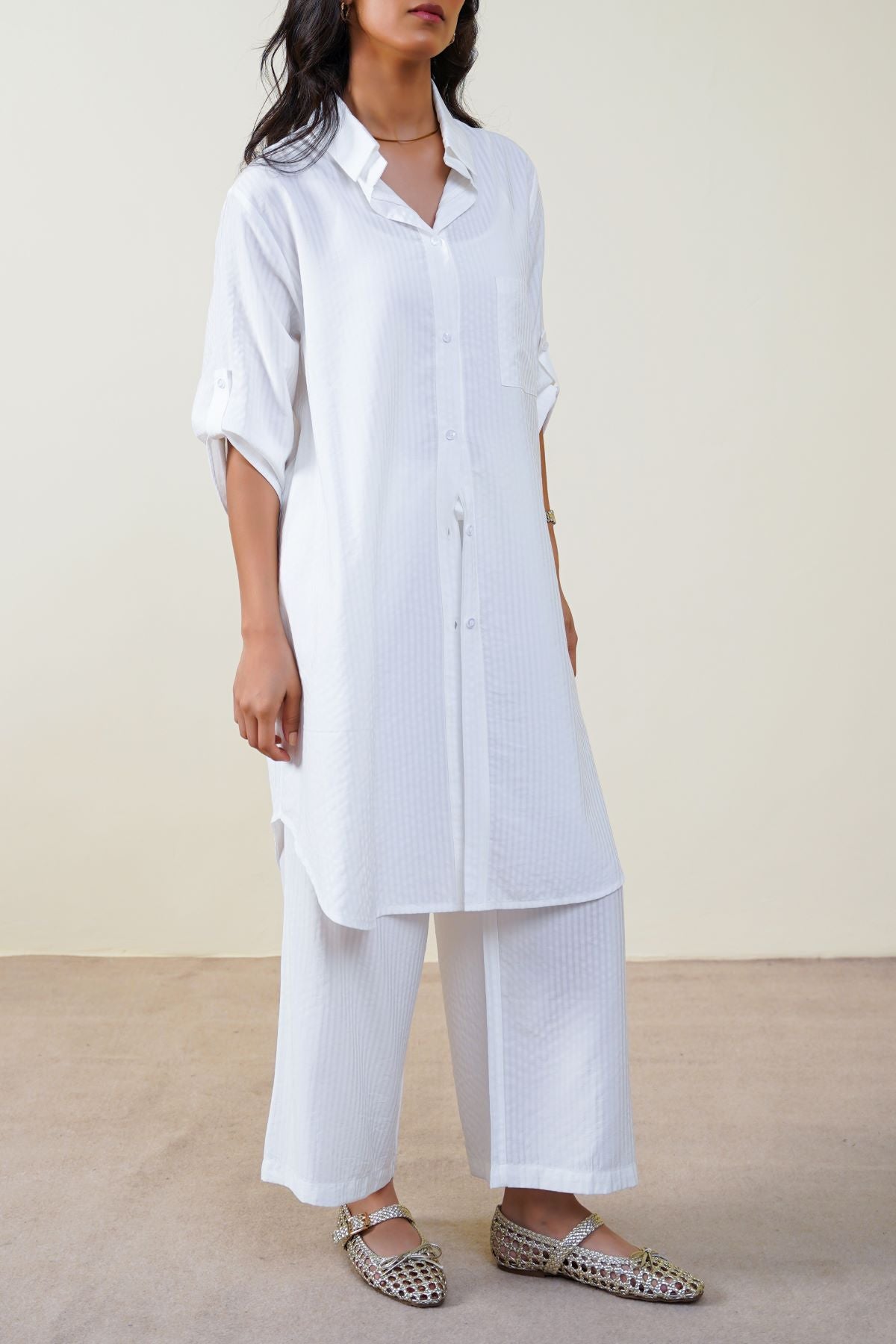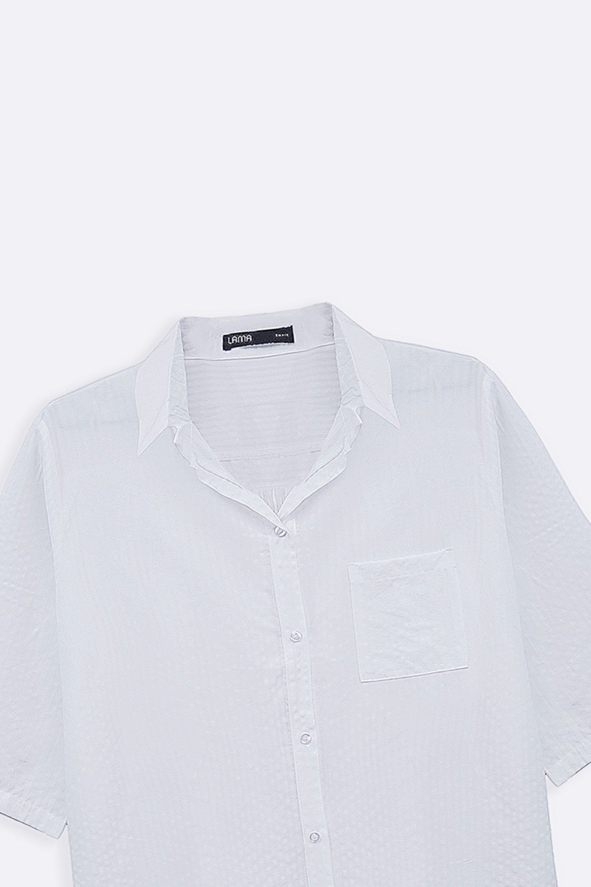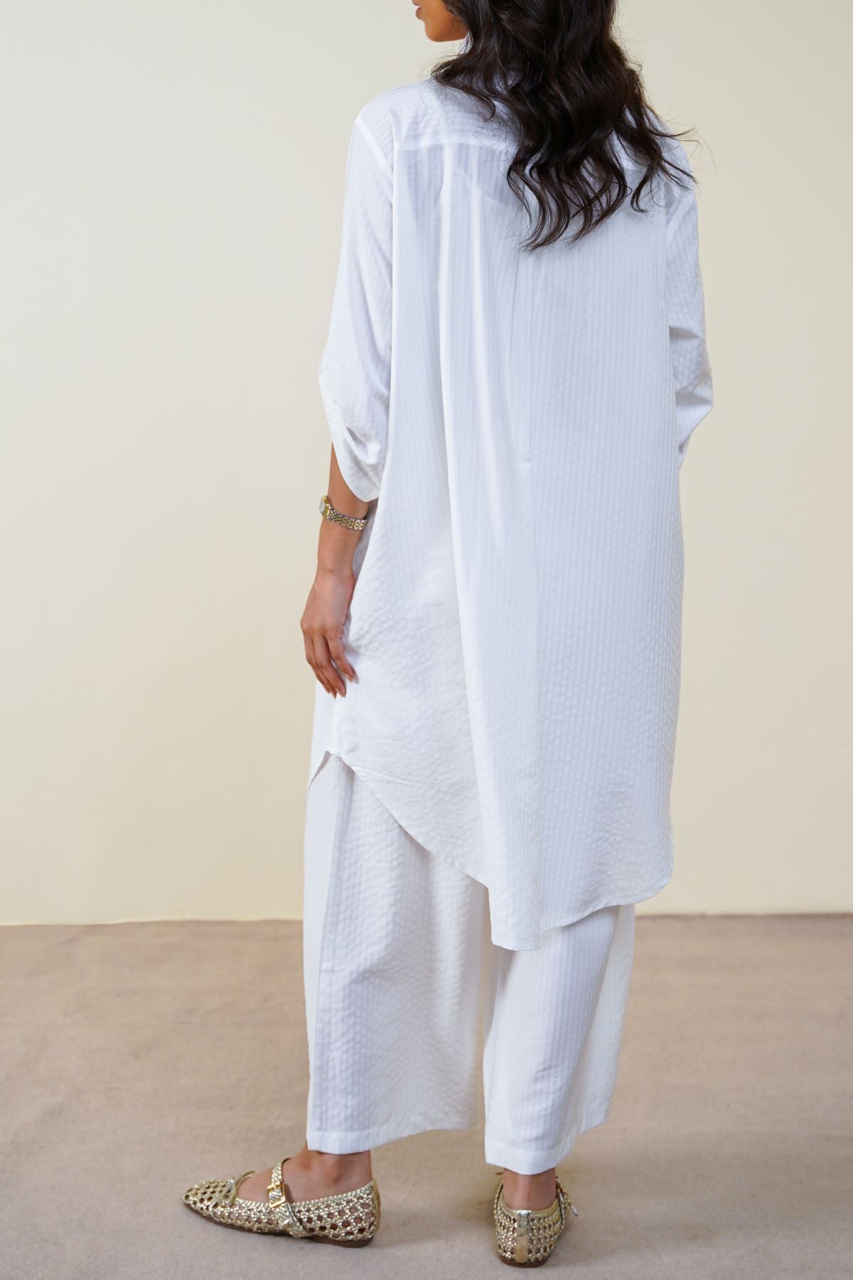 Design details: Button down tunic with three quarter sleeves, high low rounded hem and back pleat detail.