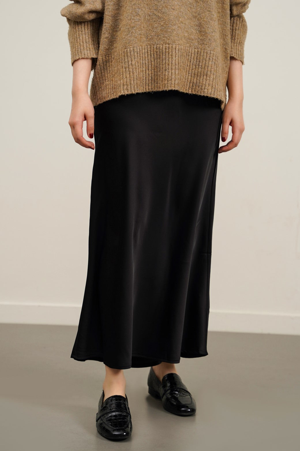 Design details: High-waist midi skirt with hidden elastic waist band and flared hem.
