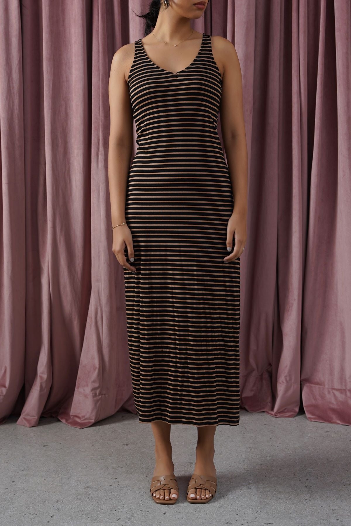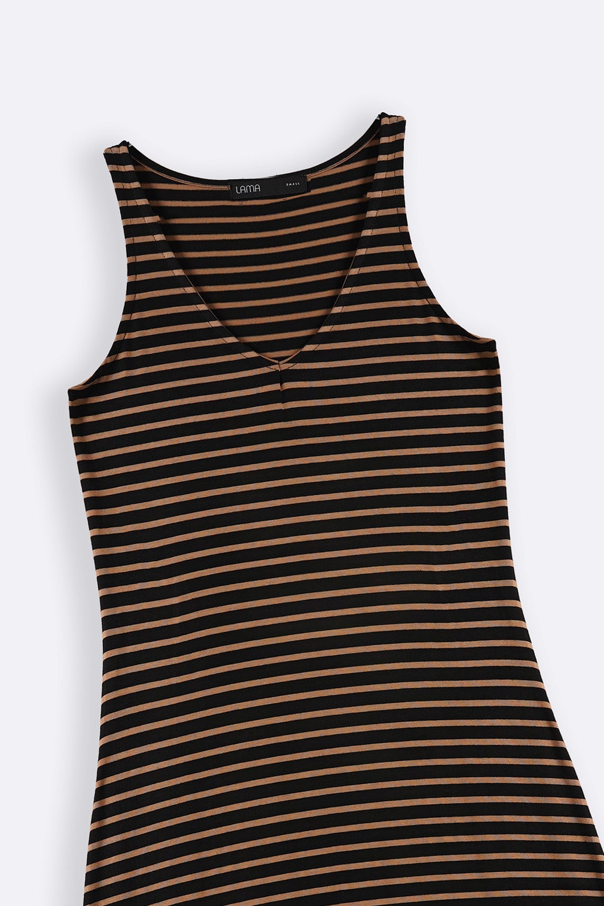 Design details: A chic A-line dress, designed sleeveless, featuring stylish striped accents for a modern and elegant look.