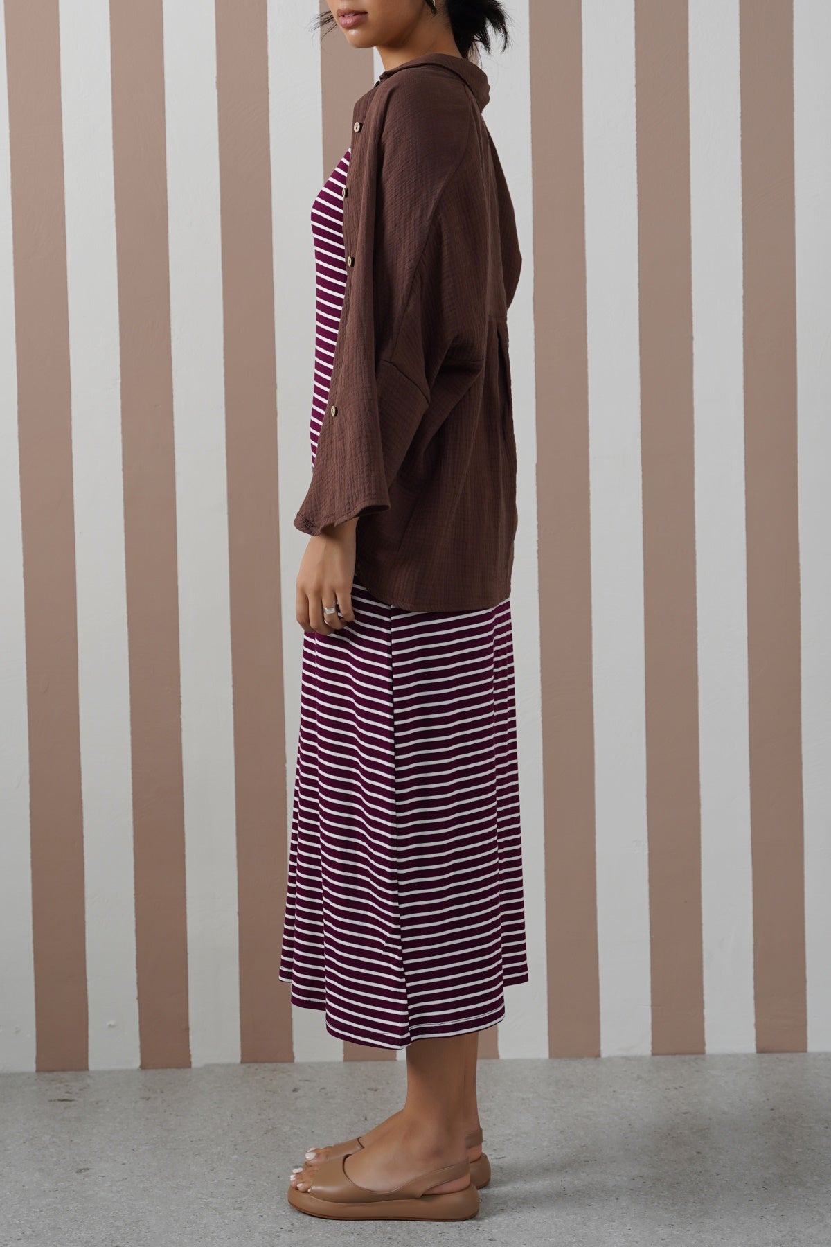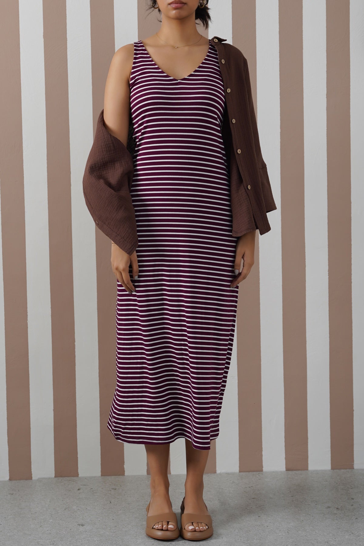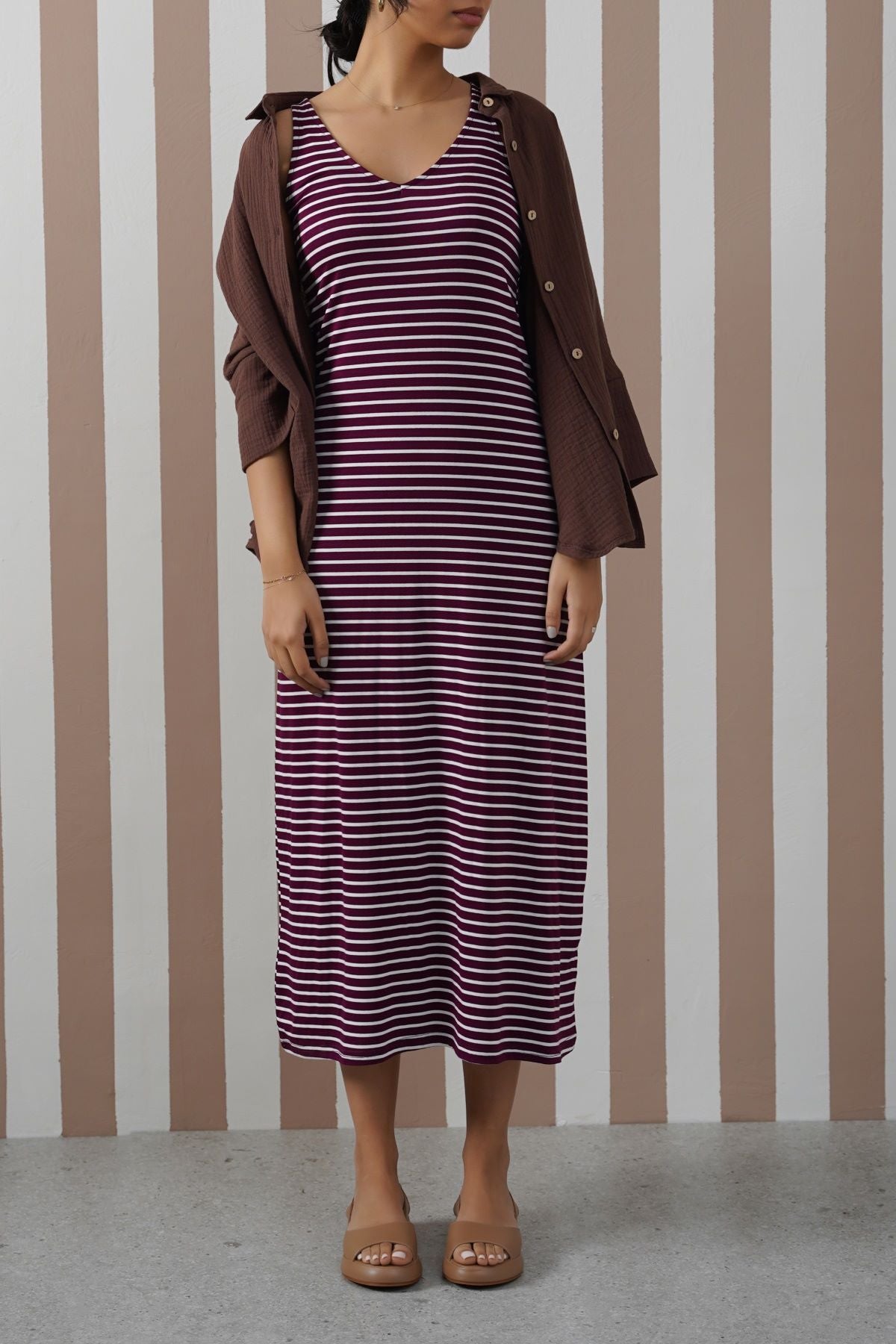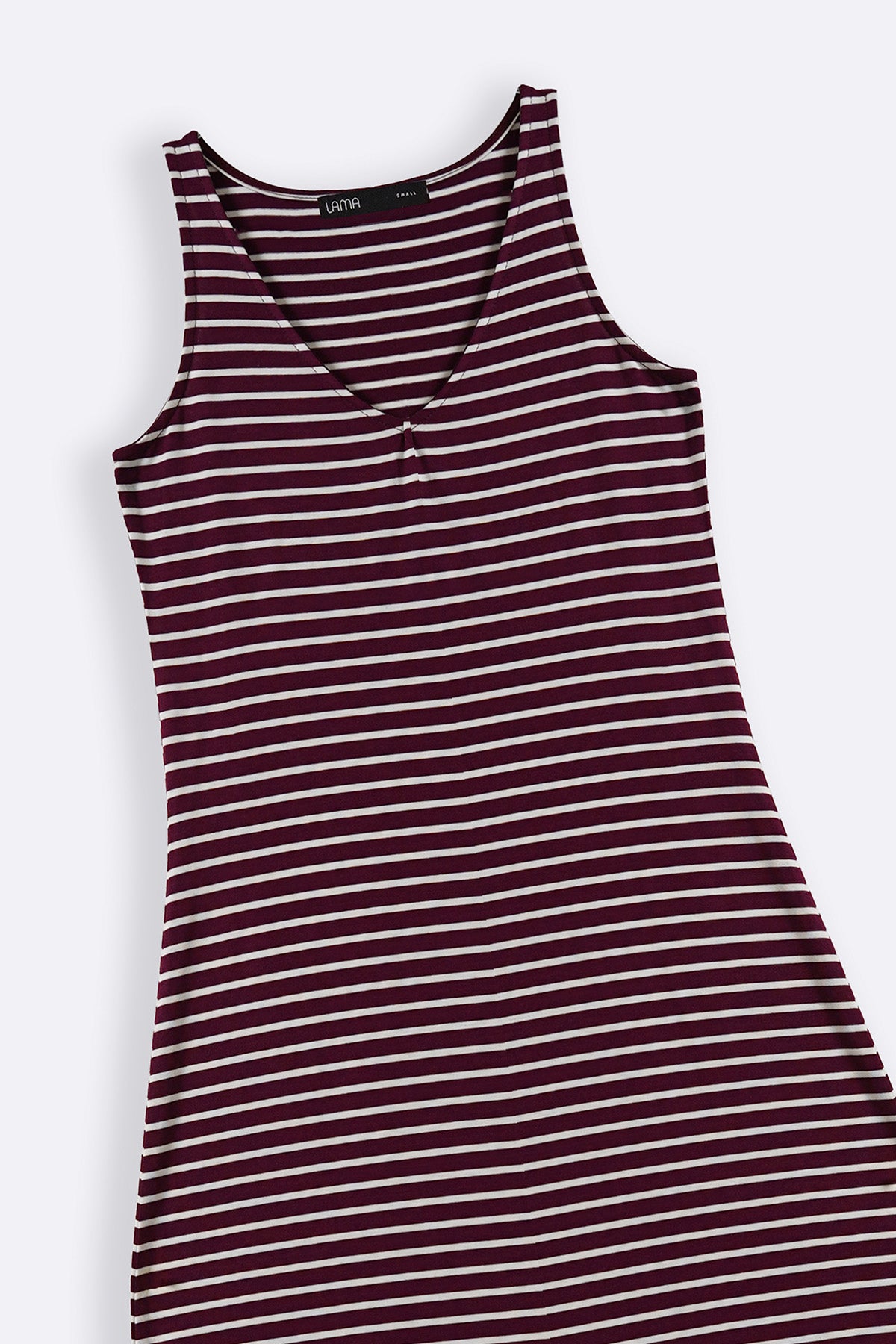 Design details: A chic A-line dress, designed sleeveless, featuring stylish striped accents for a modern and elegant look.