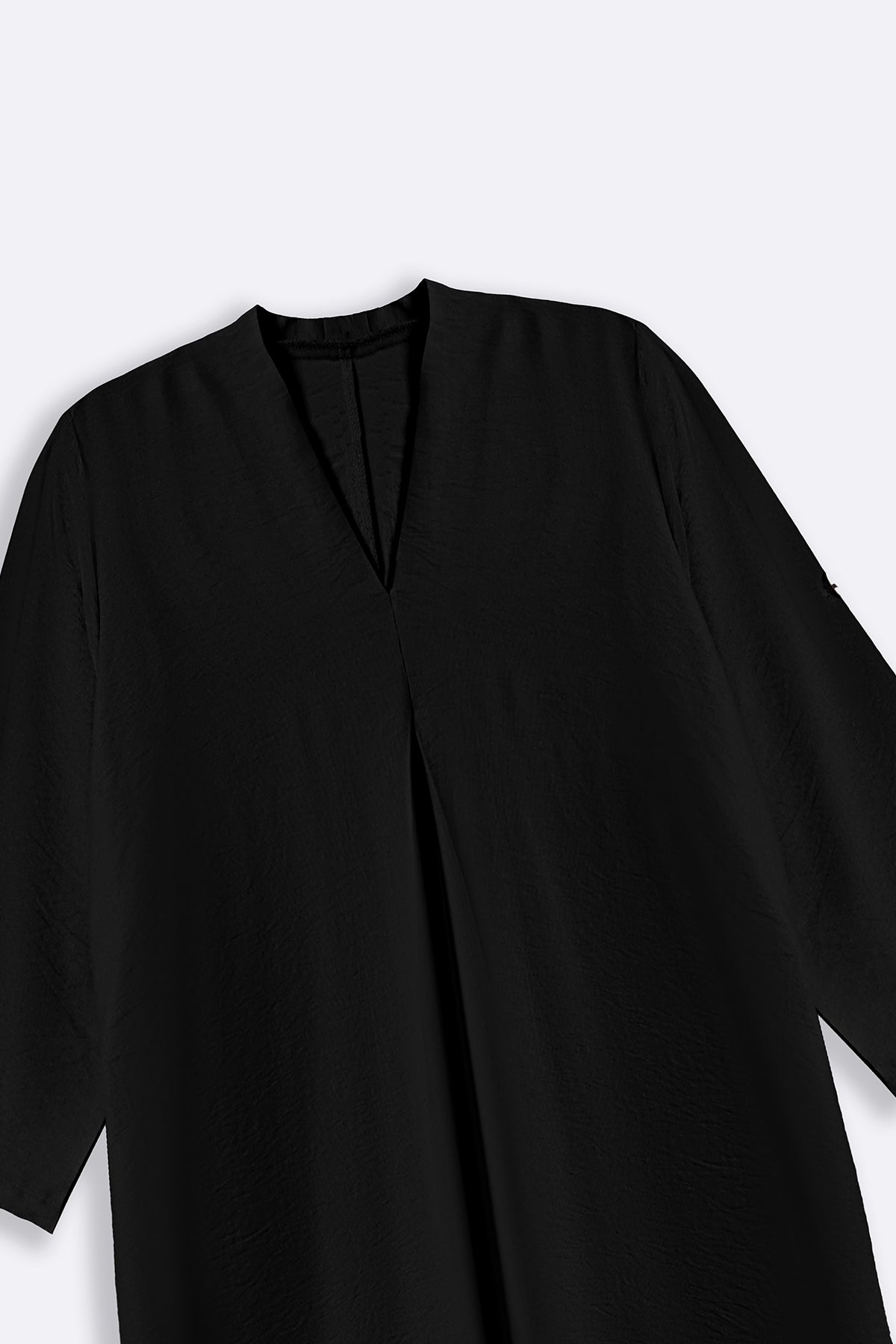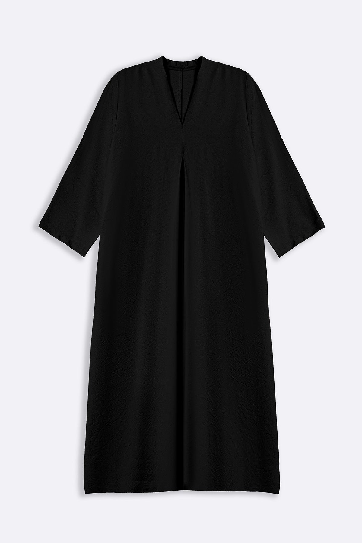 Design details: Long V-neck dress with a front box pleat, roll up sleeves with pearl buttons and side pockets.