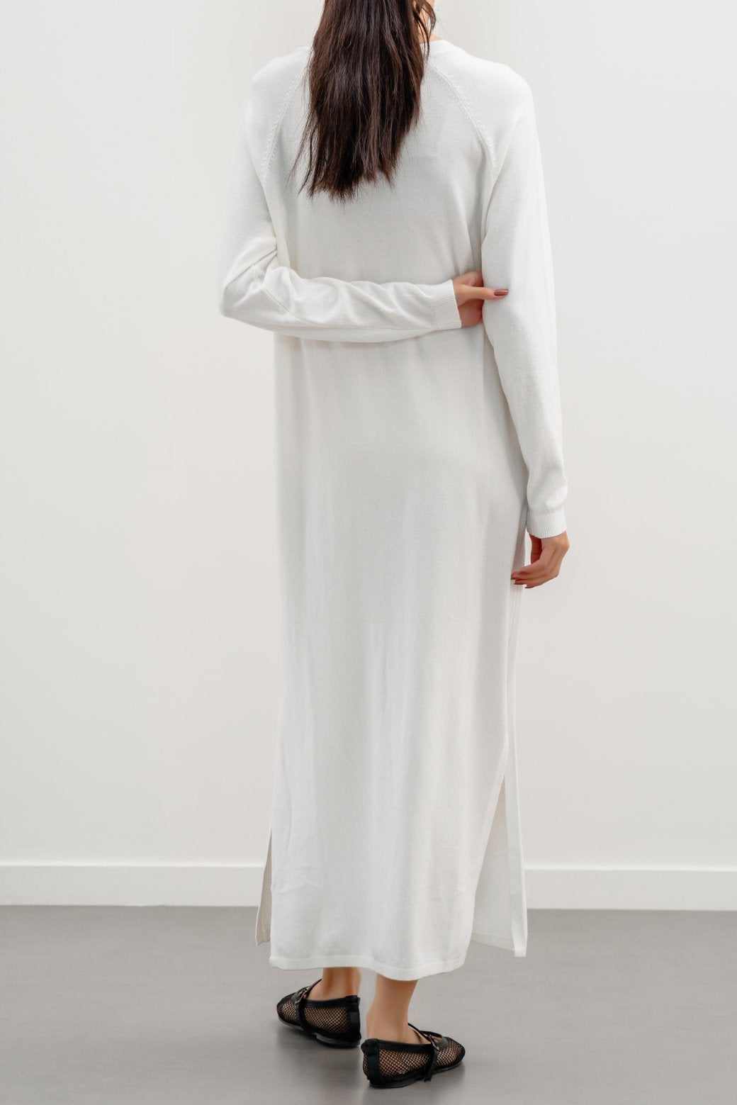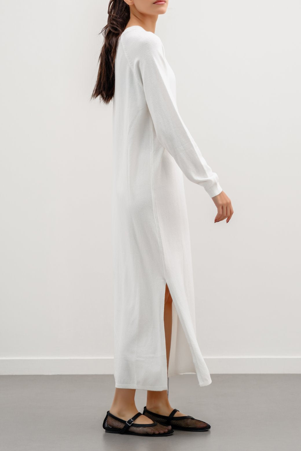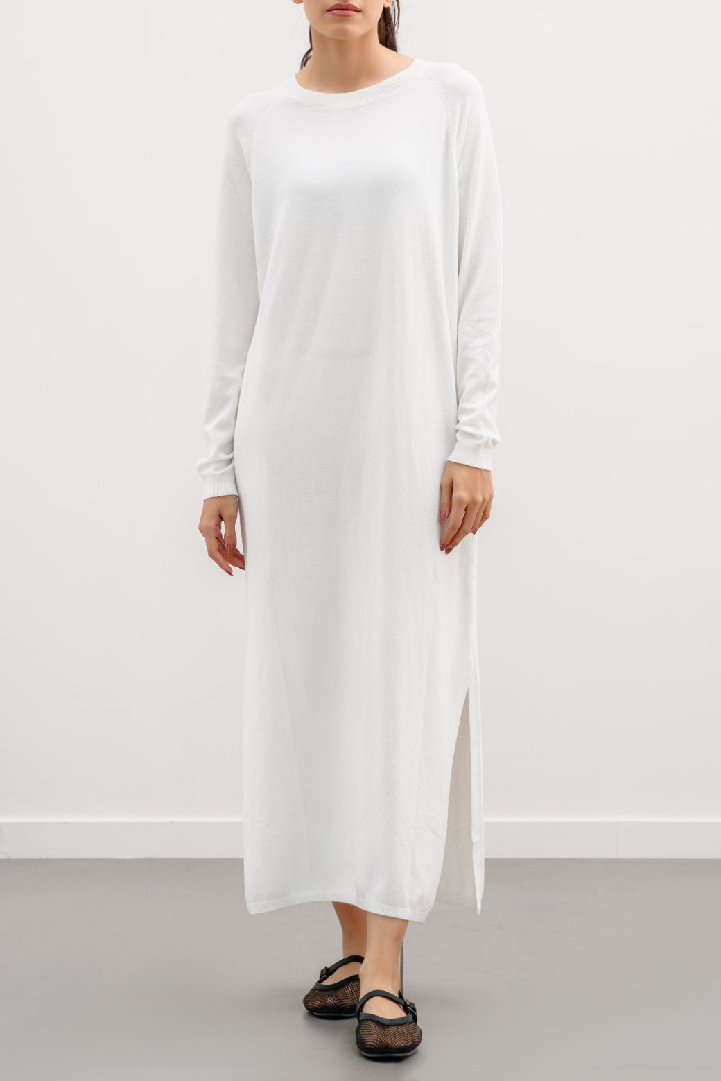 Design details: Crew neck long dress with long sleeves featuring side slits