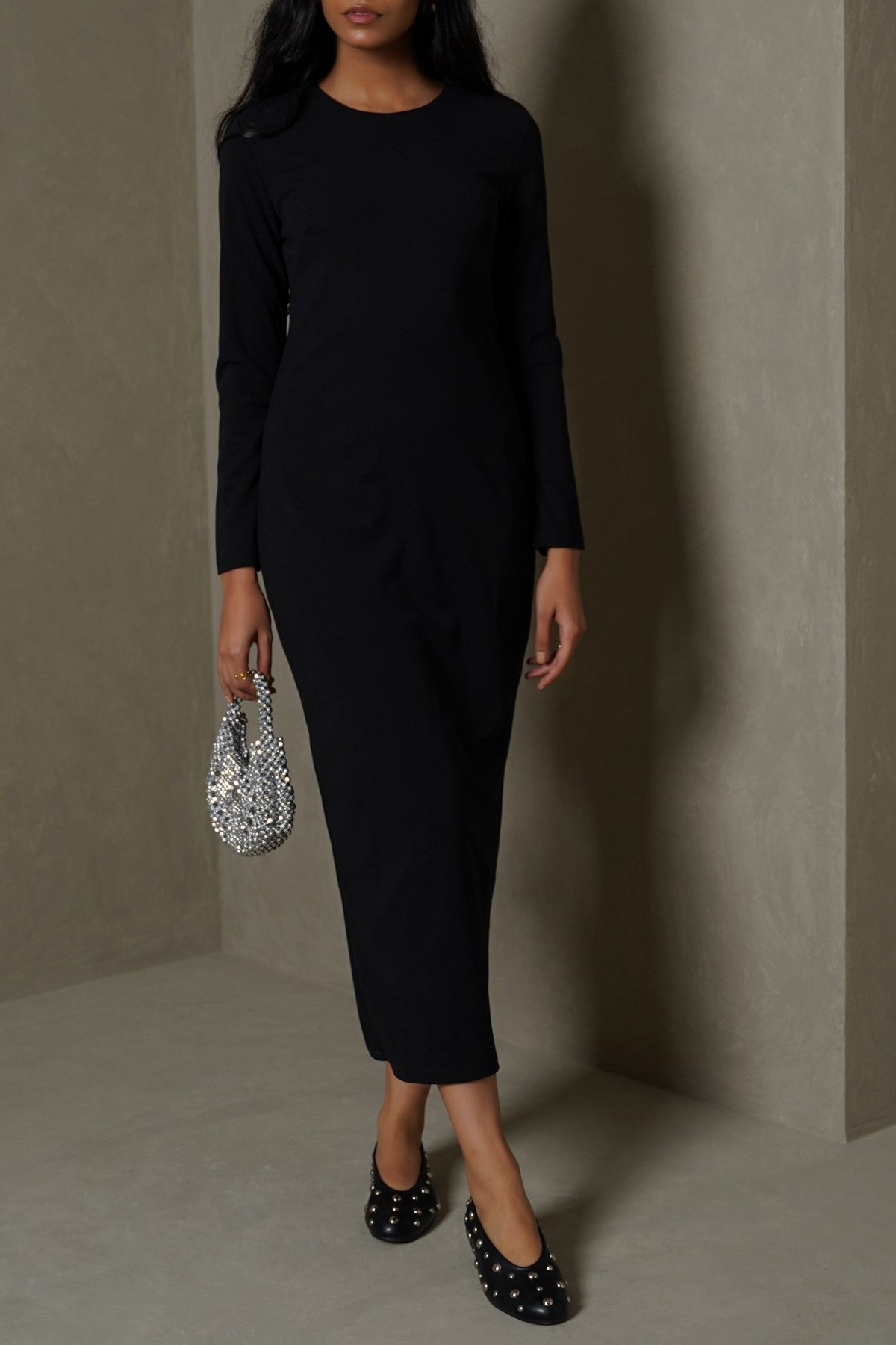 Fit type: Slim fit Design details: Midi-tailored dress with long sleeves, long length Stretch: Medium Transparency: None Hand feel: Medium Lining: None Material: 96% Polyester, 4% Spandex Size: The model is 175 cm/5'9" and wears a size SMALL Occasion: Evening