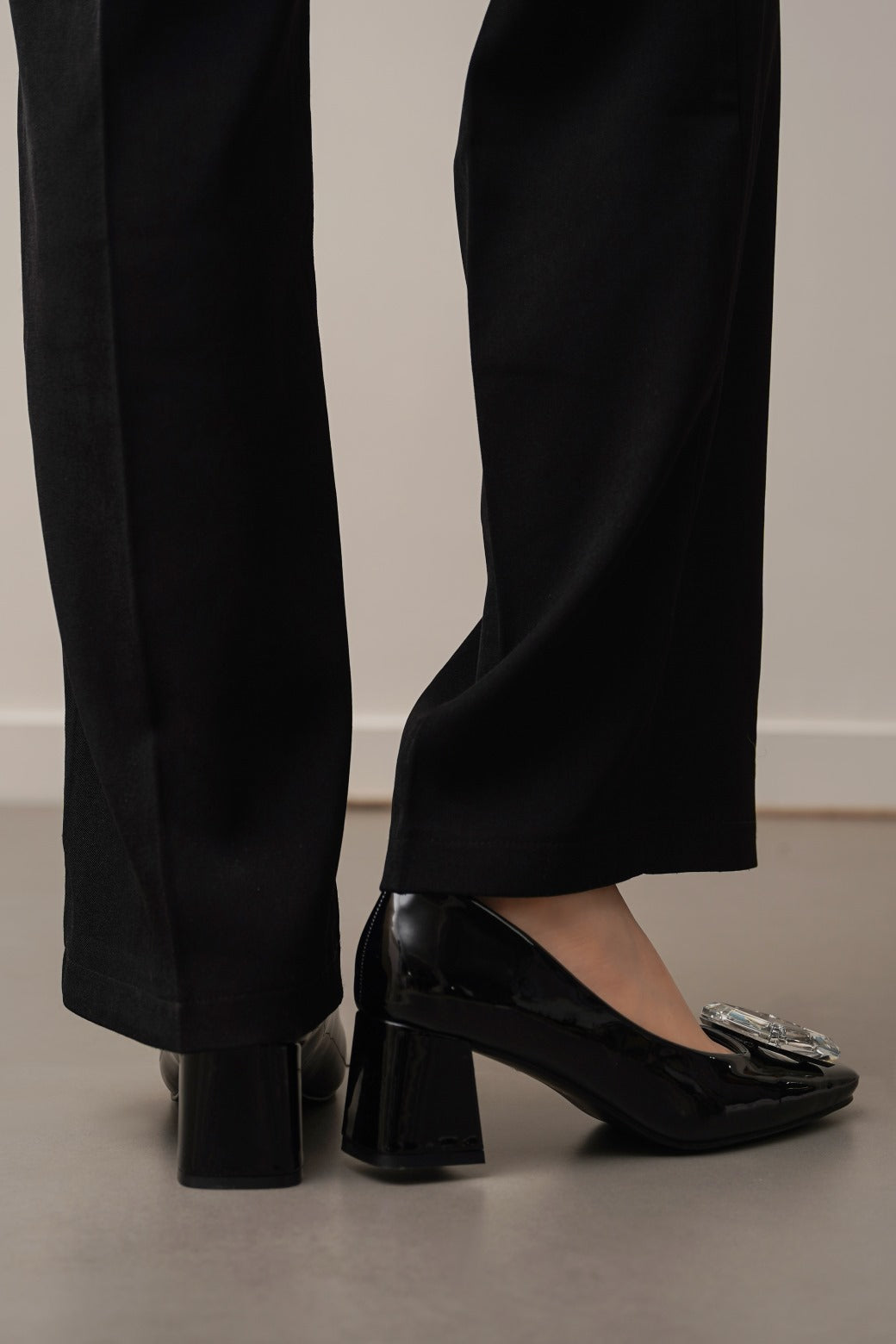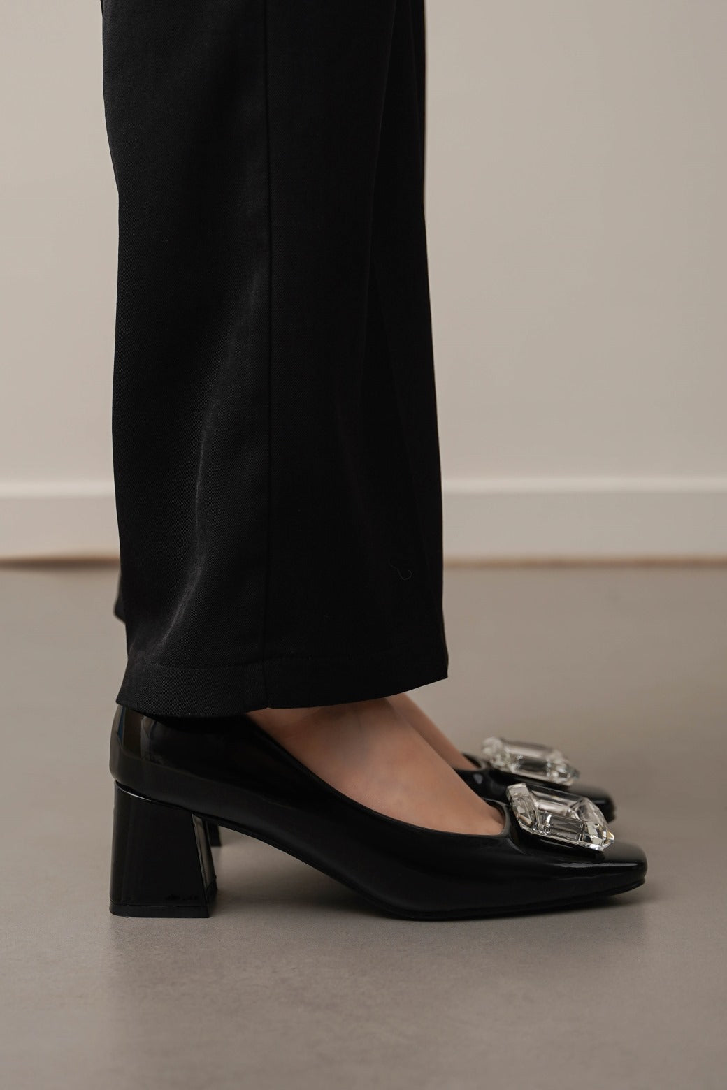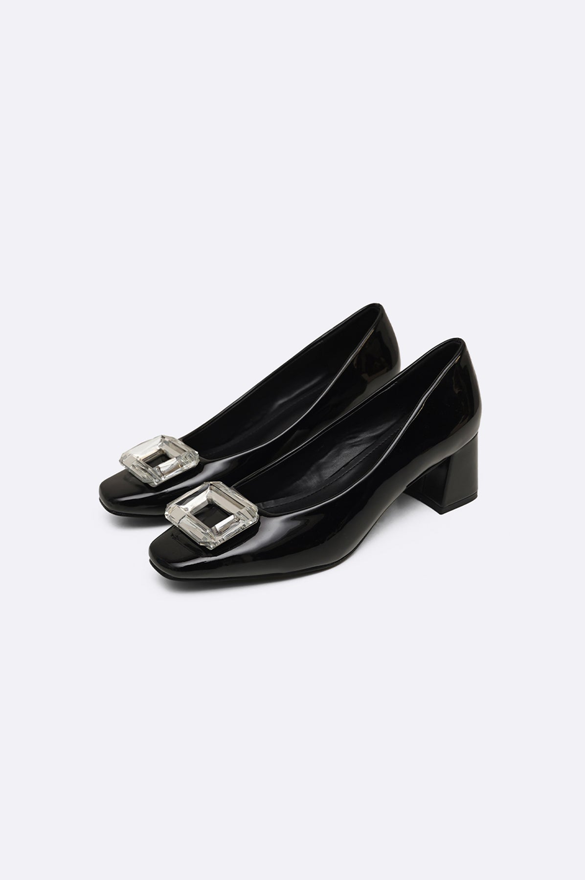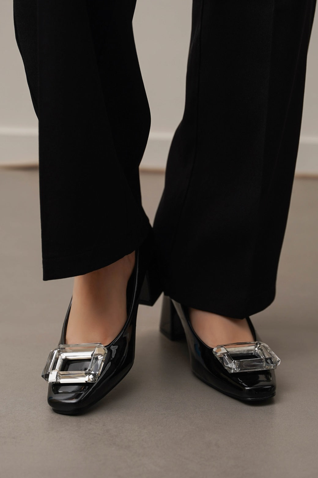 Square toe block heels with an oversized rectangular high quality crystal brooch.