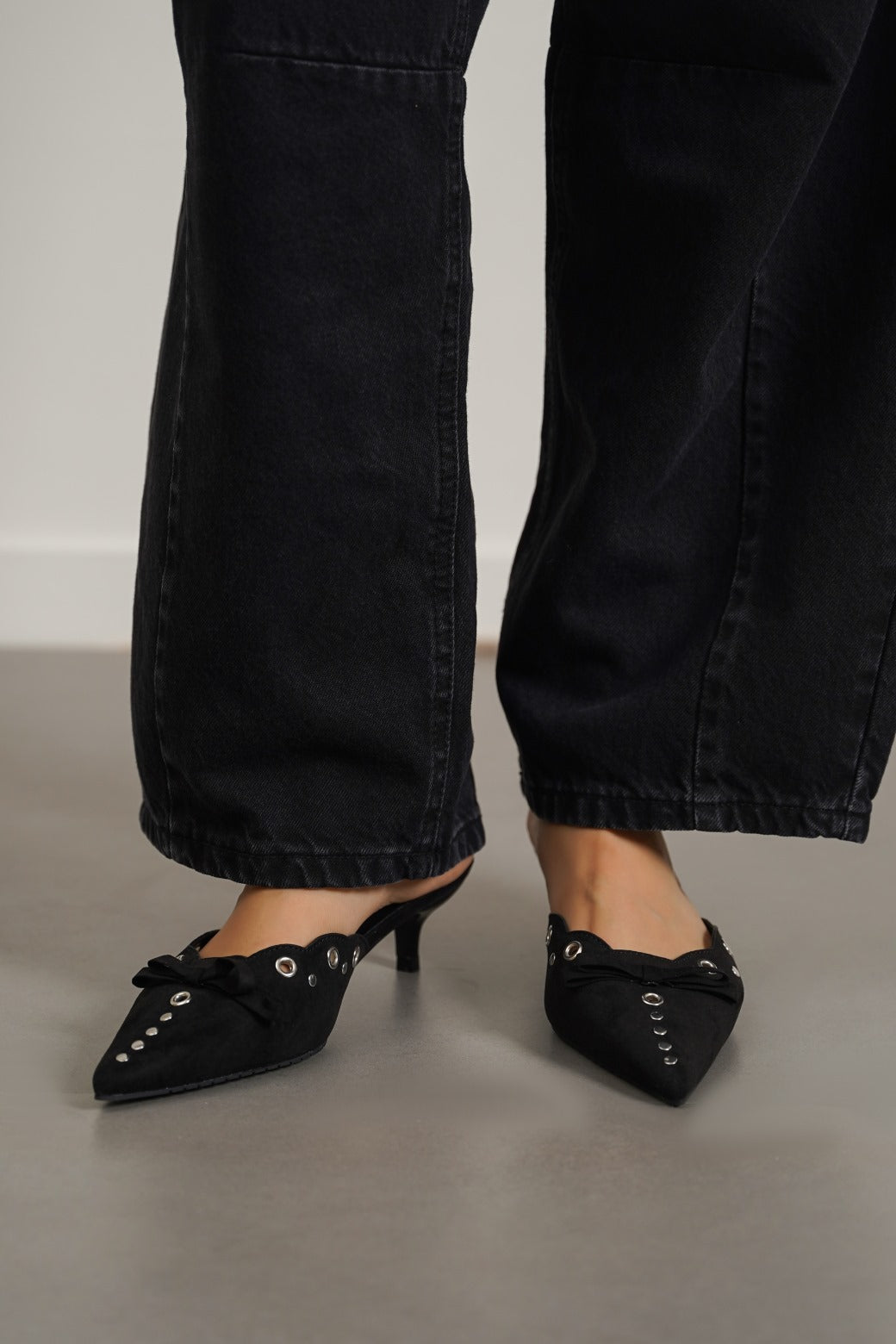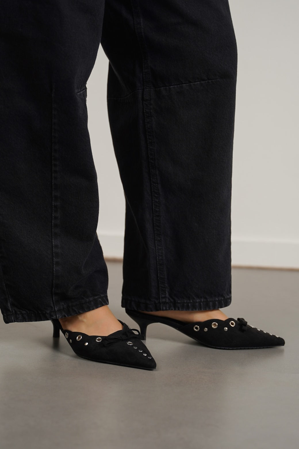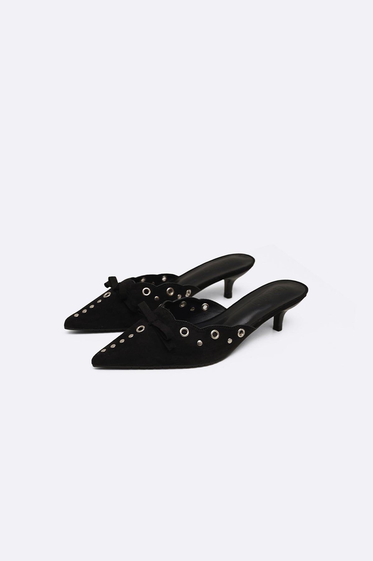 Pointy kitty heels with silver studs and rivets and a matching bow.
