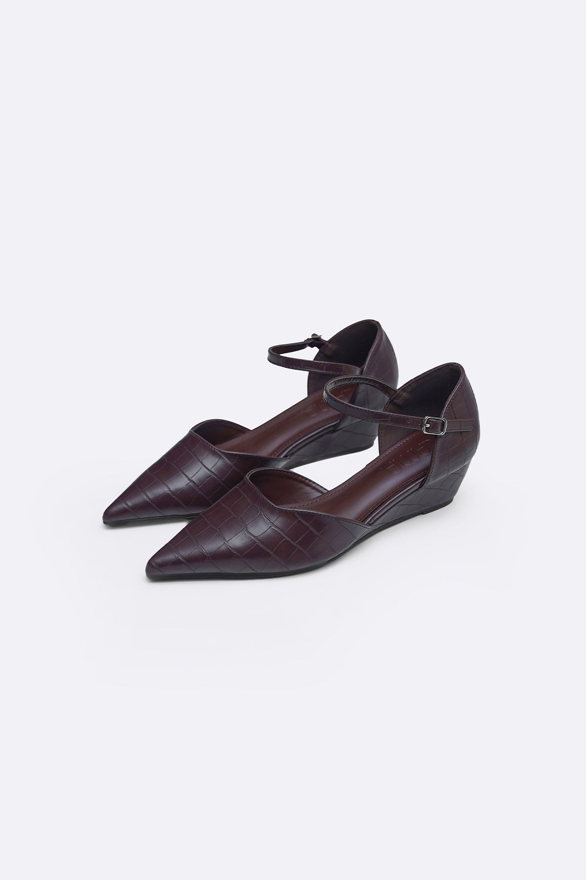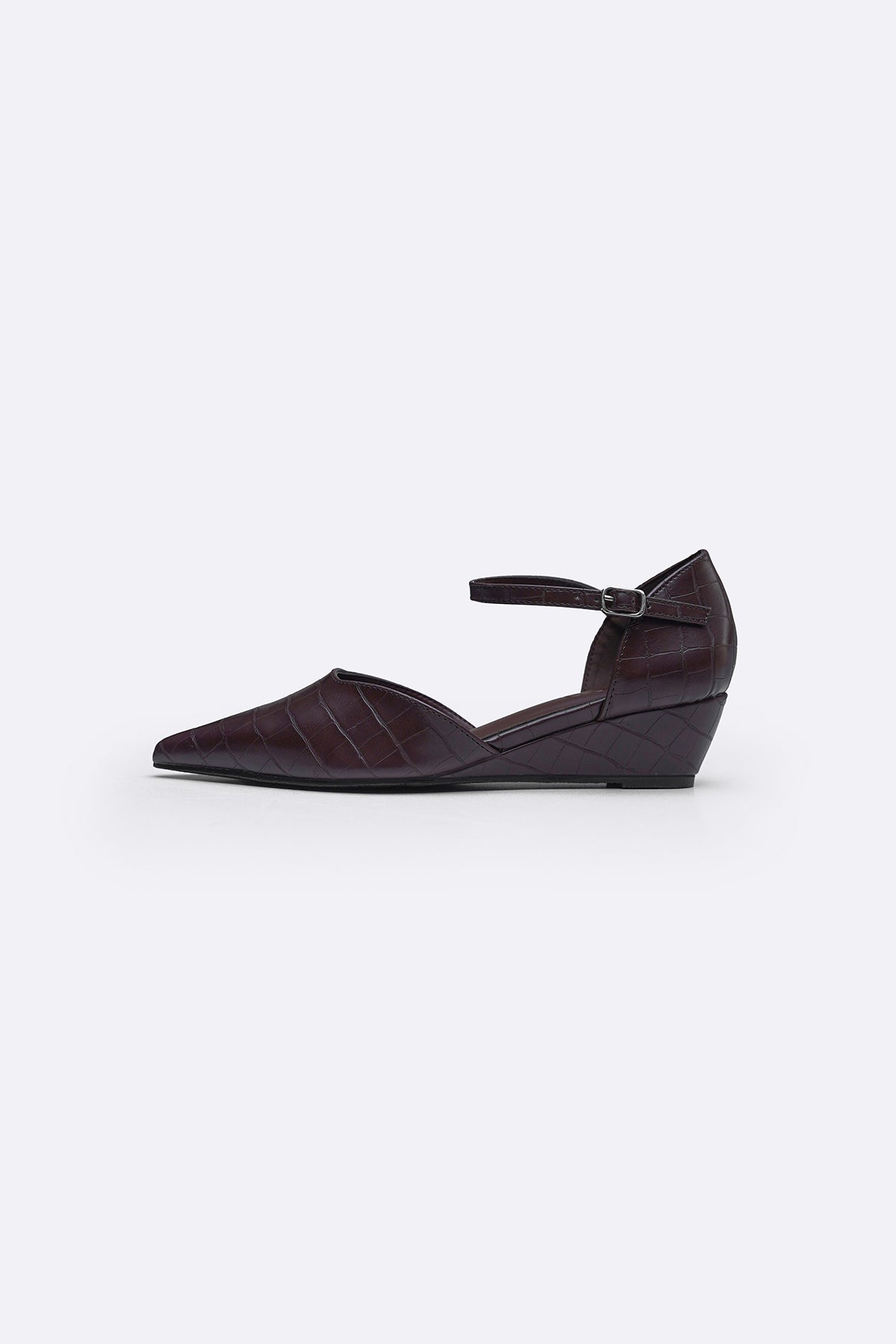 Crocodile textured pointed wedge with buckle on ankle strap for size adjustment, comfortable insole and anti-slip outsole.