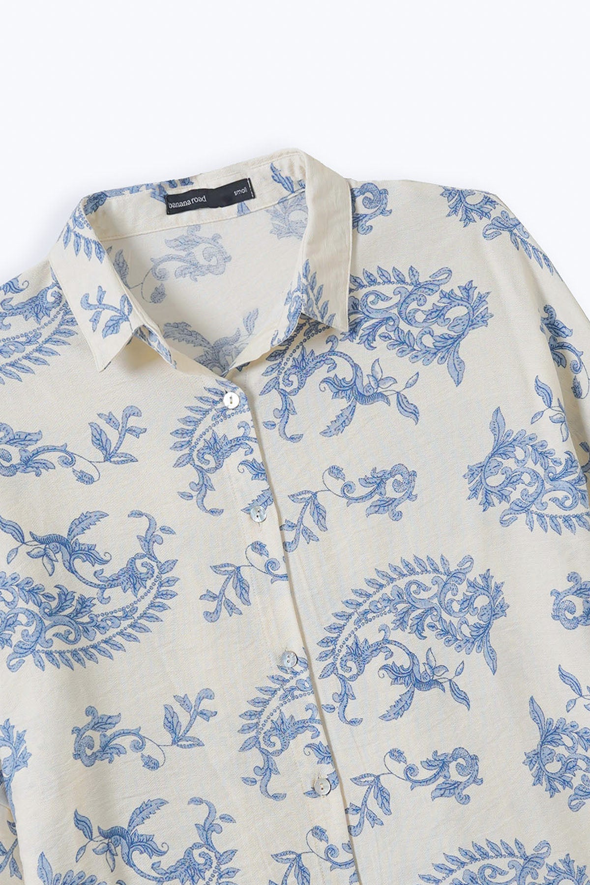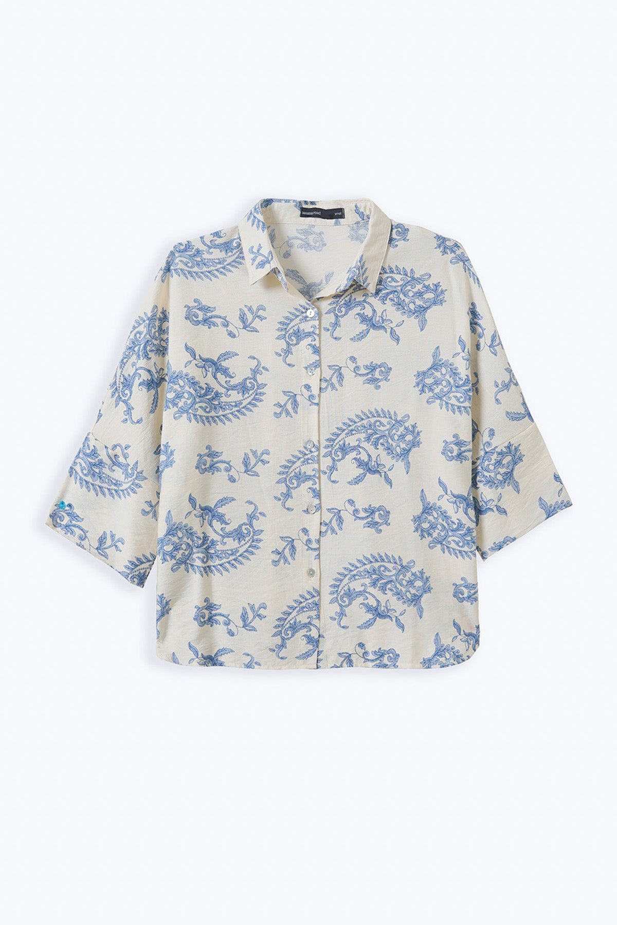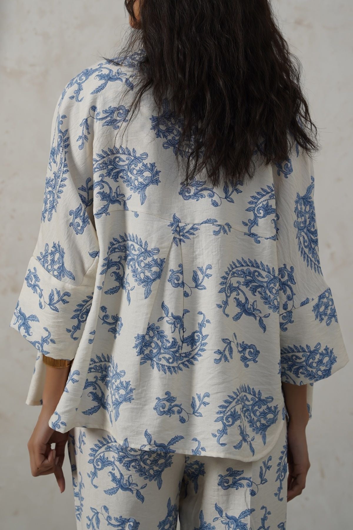 Design details: Collared printed mother-of-pearl button-down shirt featuring a high-low hem and a back box pleat. It’s a one-piece batwing design without armholes.