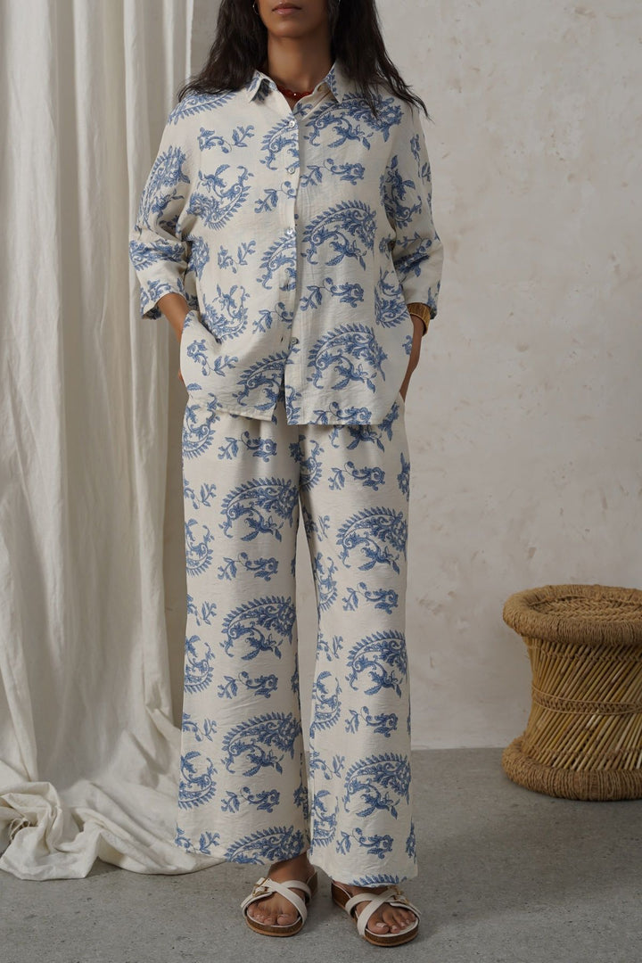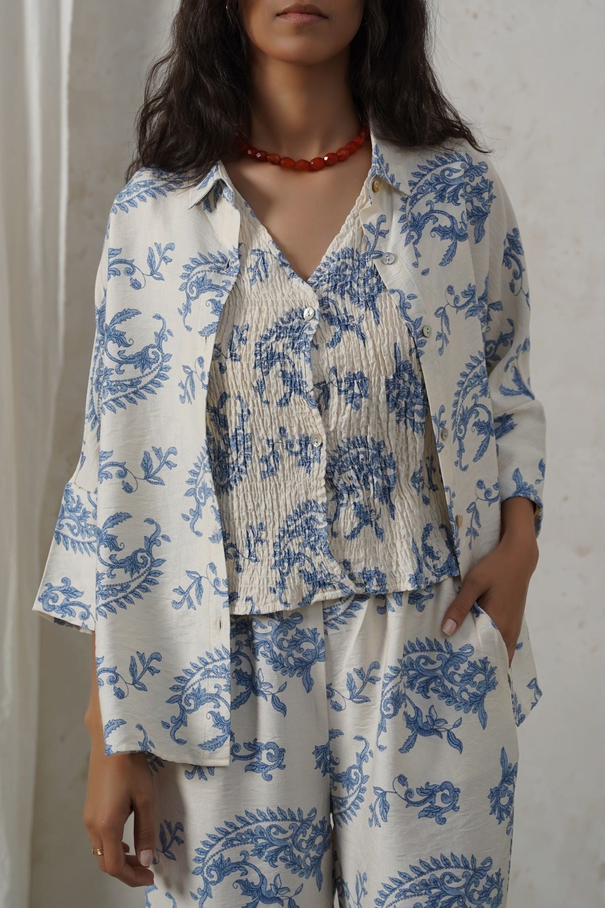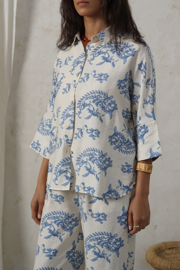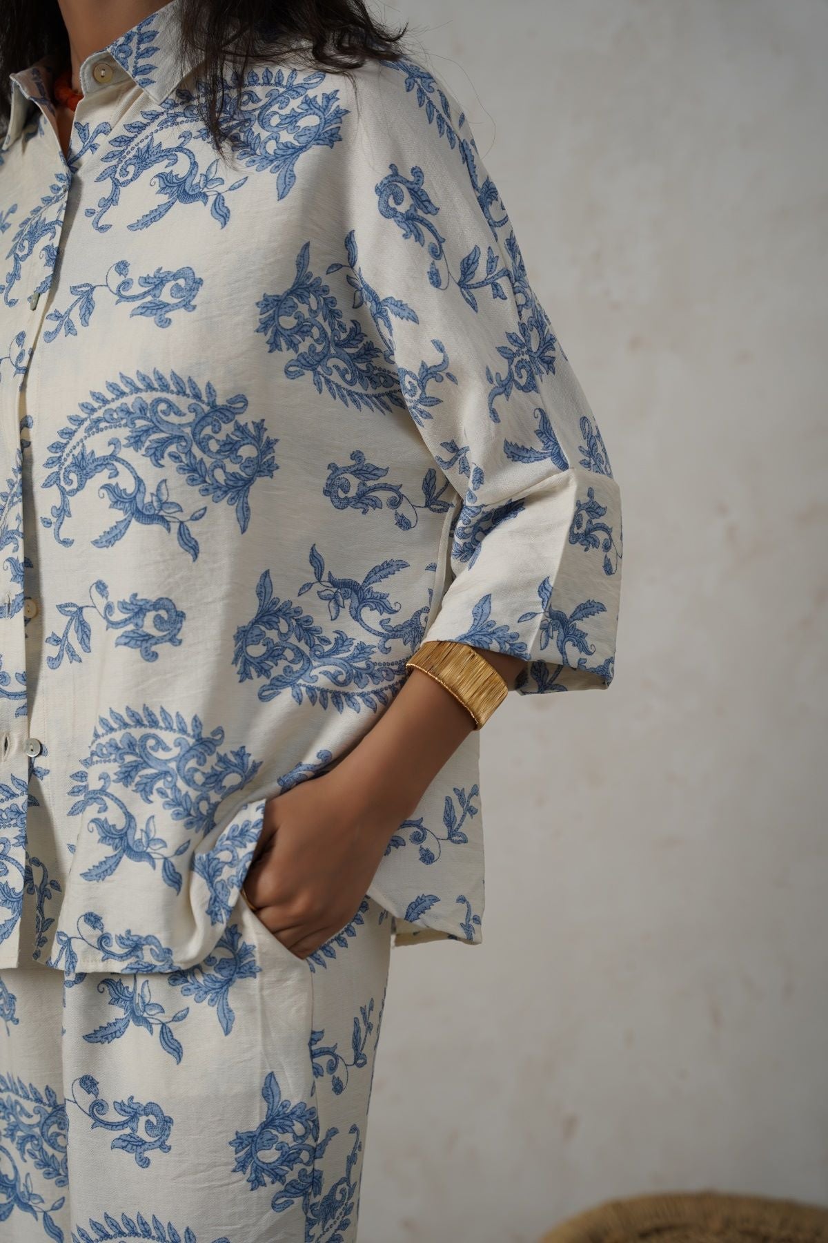 Design details: Collared printed mother-of-pearl button-down shirt featuring a high-low hem and a back box pleat. It’s a one-piece batwing design without armholes.