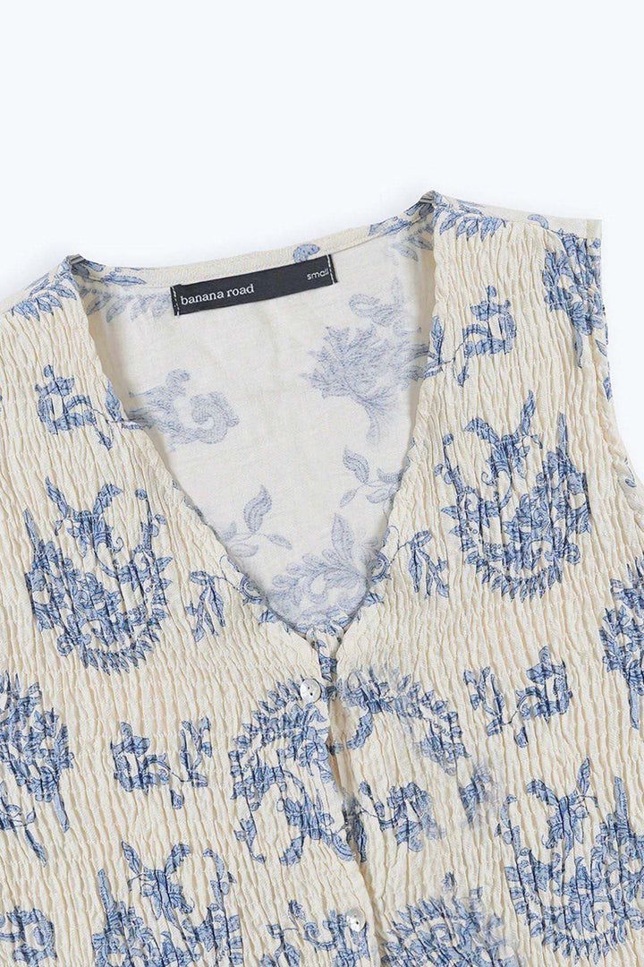 Design details: Printed V-neck vest featuring a smocked front and pearl button closure