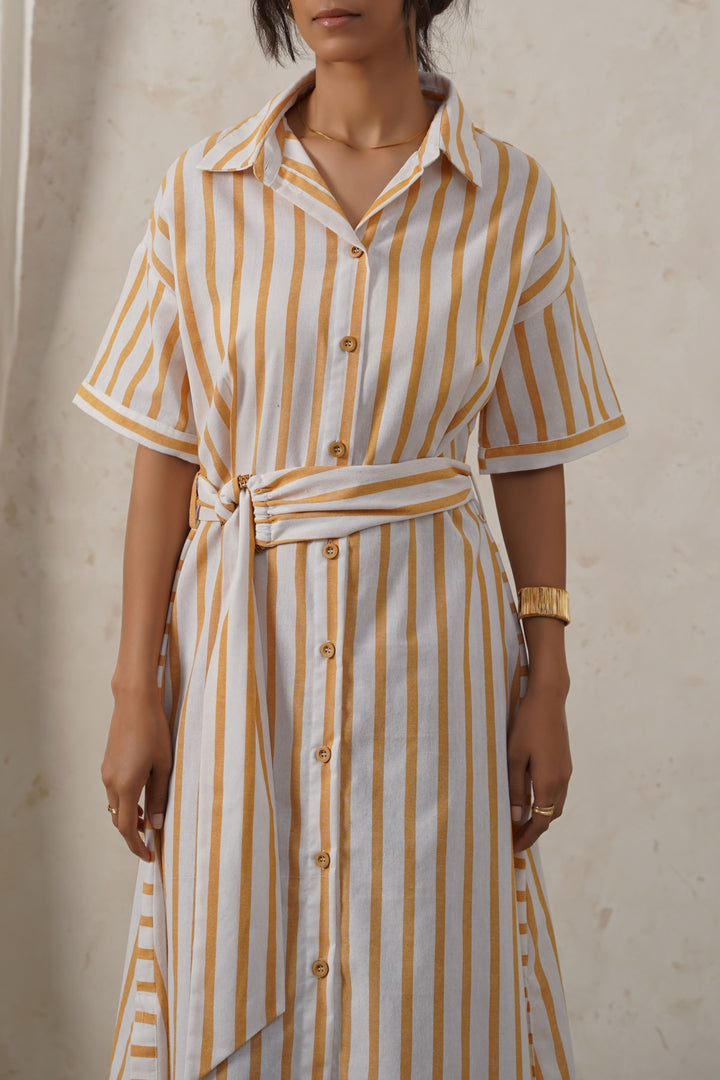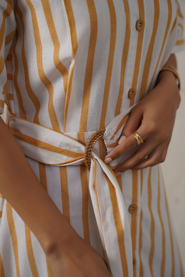 Design details: A full-length striped dress featuring short sleeves, a collar, and a front closure with wooden buttons. It includes side slits and comes with a coordinating belt with a buckle