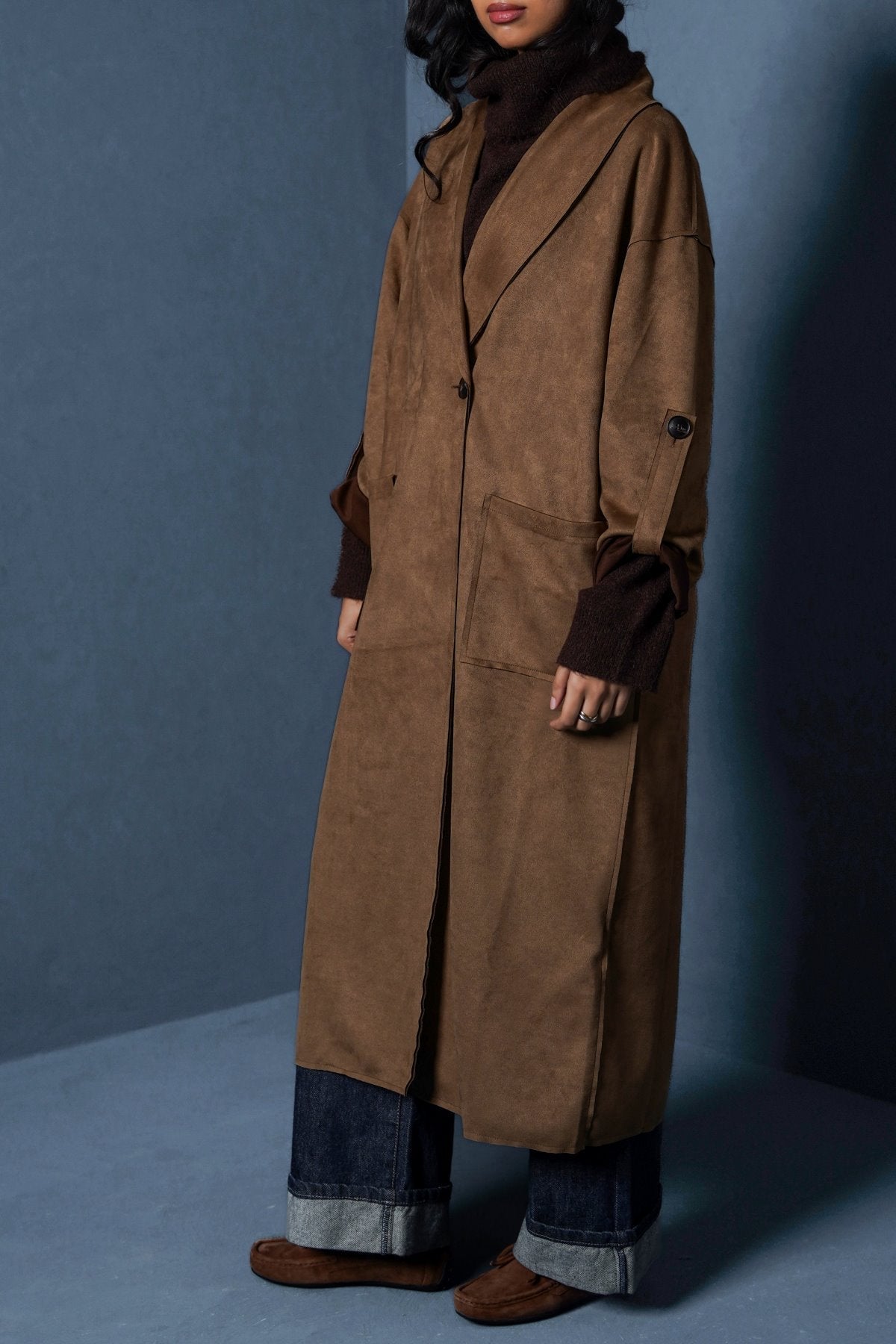 Design details: Long suede coat with shawl collar, patch pockets, turn up sleeves, double-breasted front and back vent.