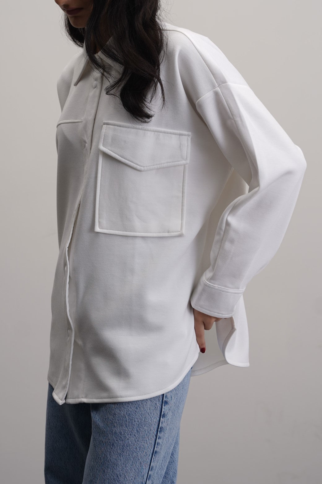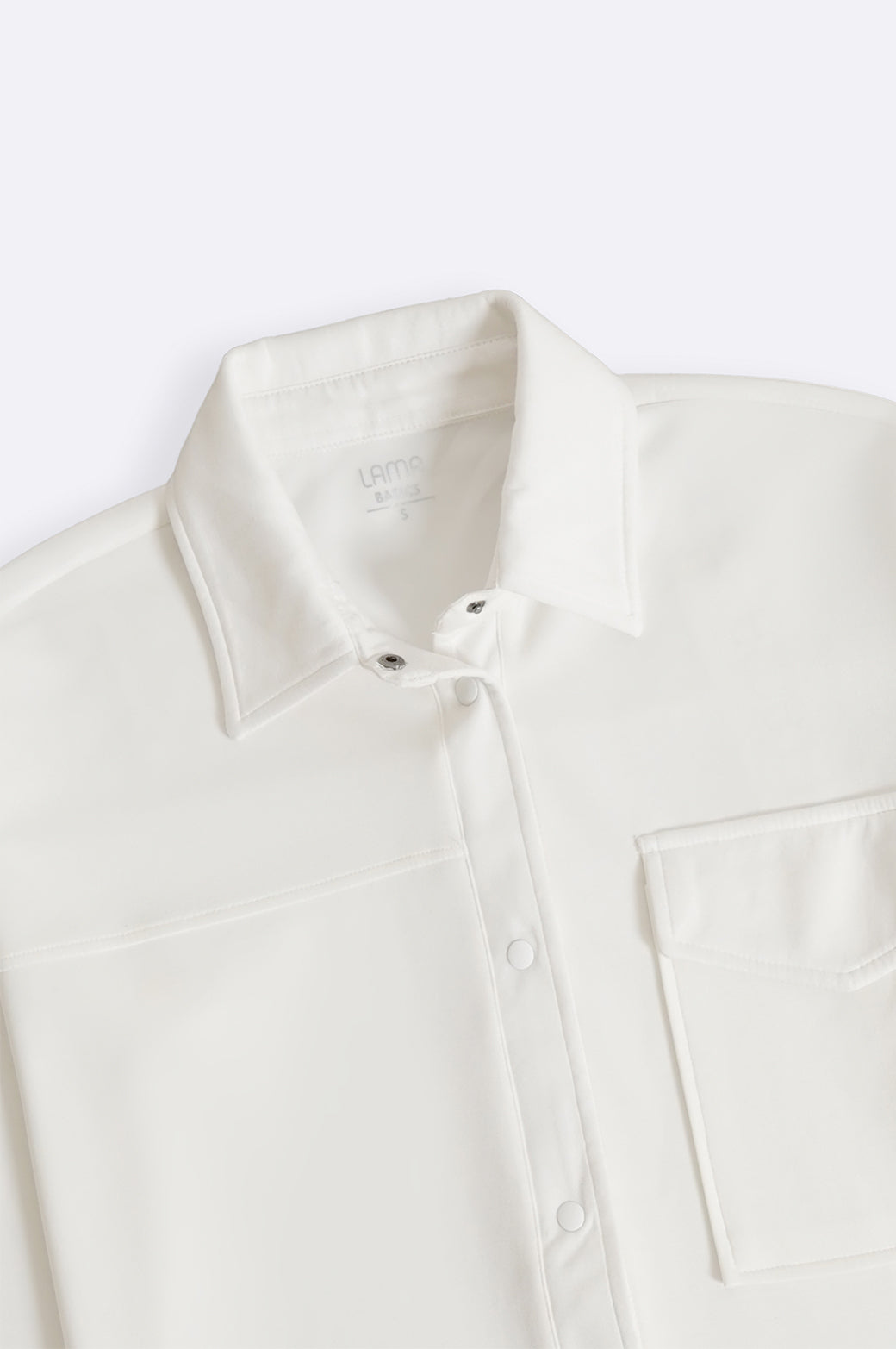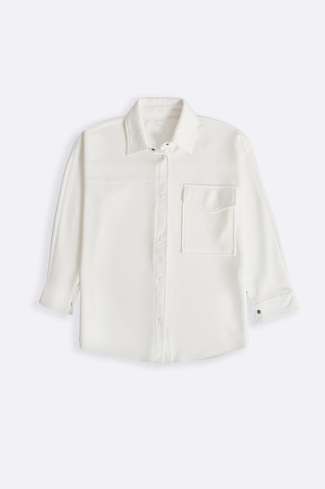 Design detail: Collared shacket with long sleeves. Front patch pockets along with front fastening button featuring side slits
