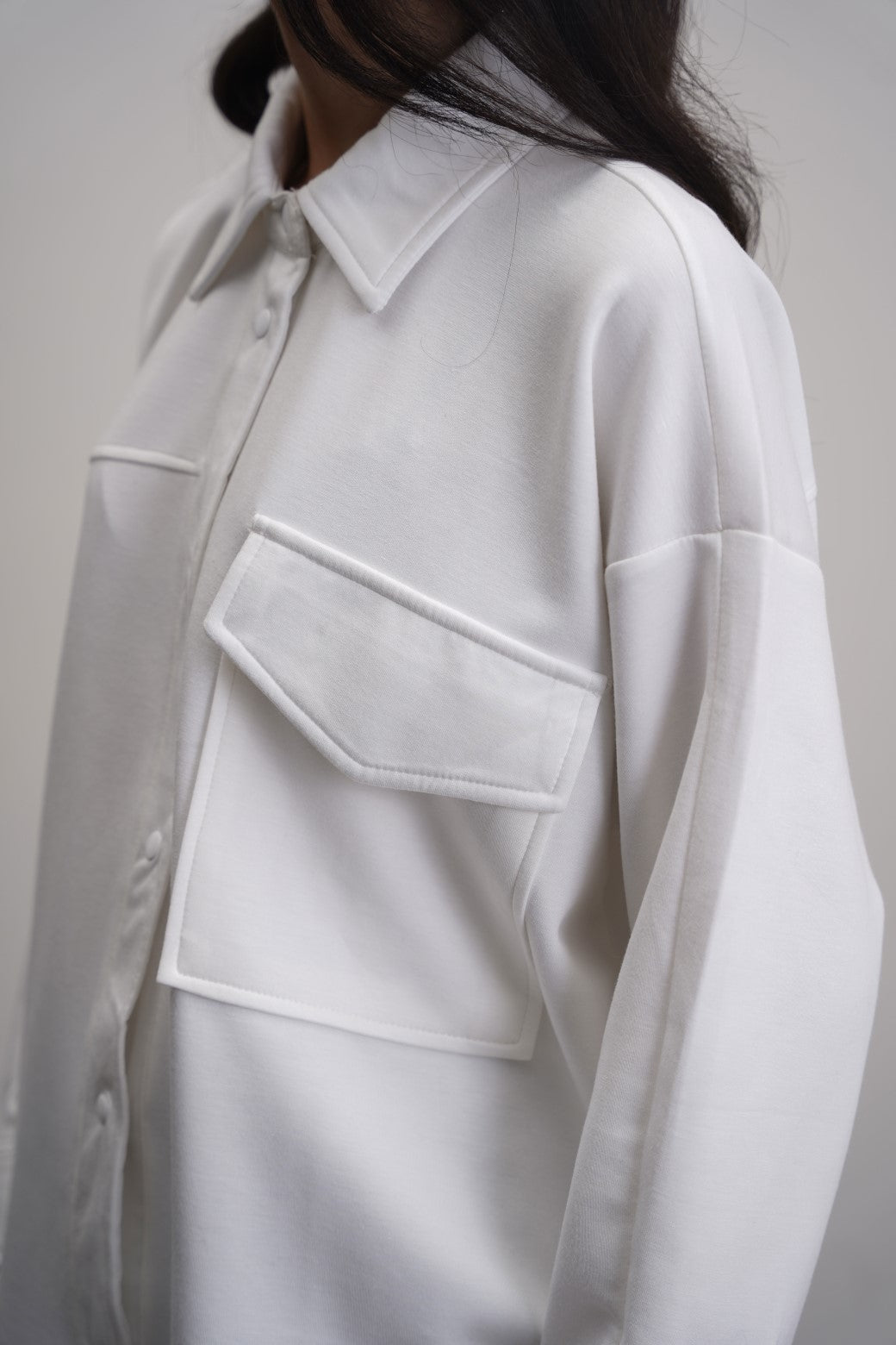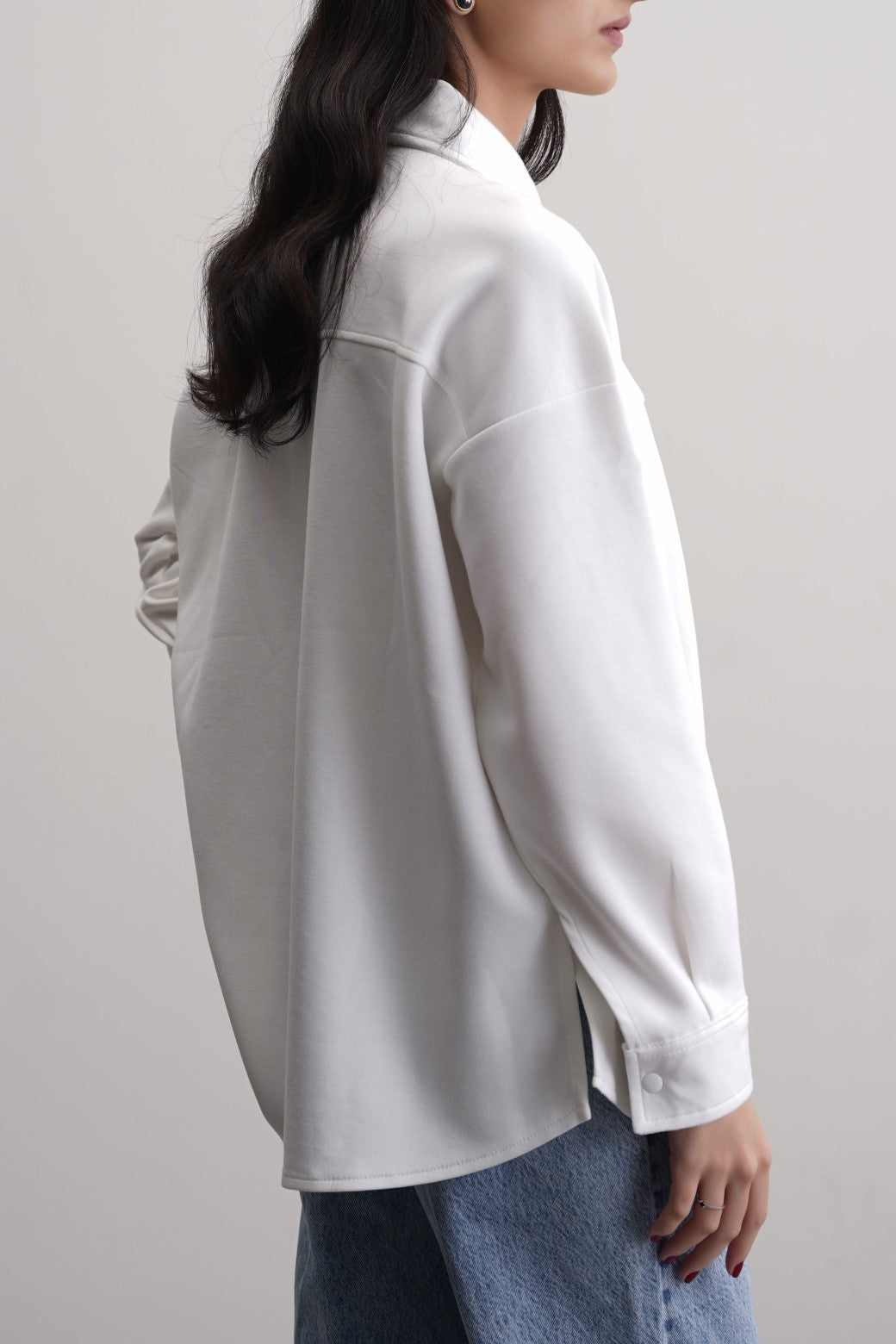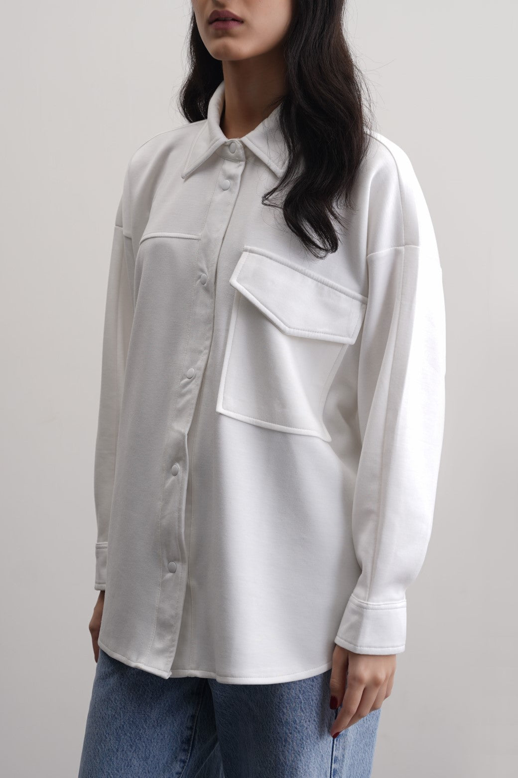 Design detail: Collared shacket with long sleeves. Front patch pockets along with front fastening button featuring side slits