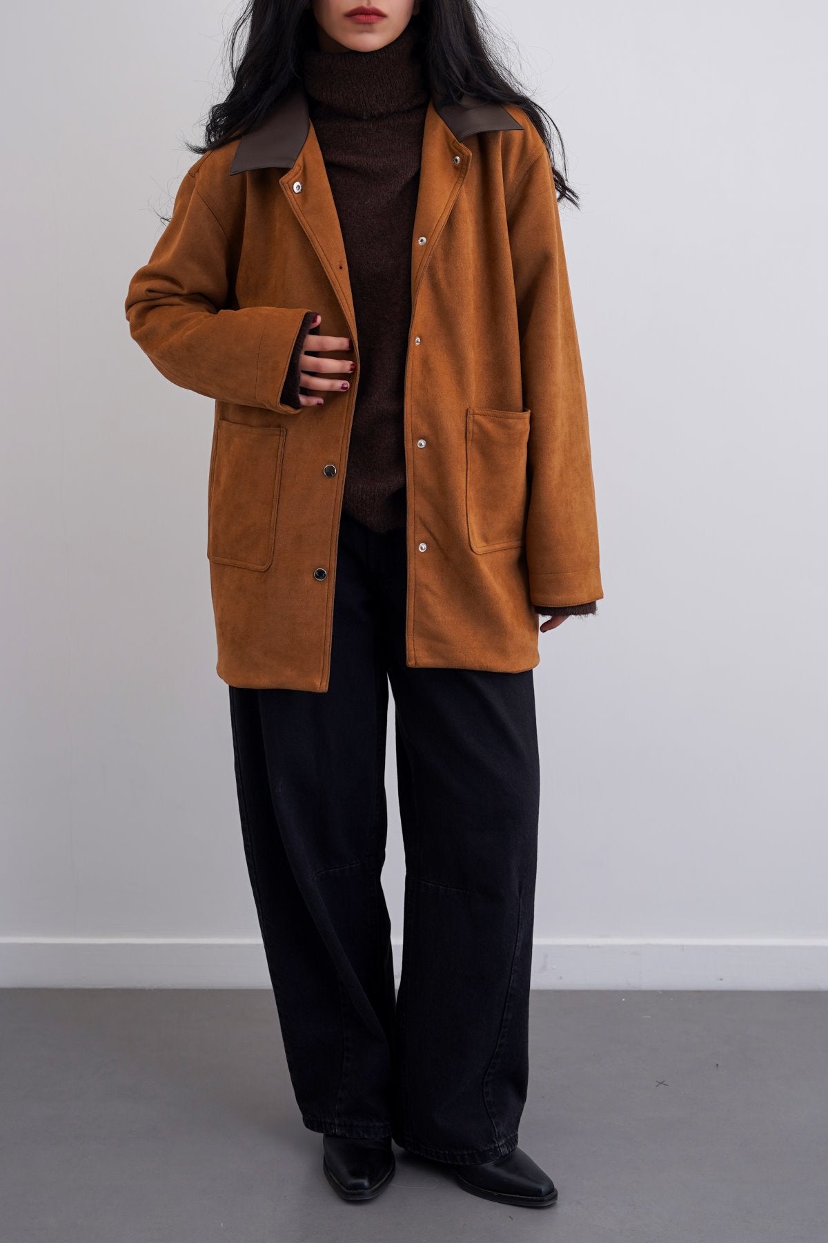 Design details: Suede jacket with PU collar, patch pockets and snap button front.