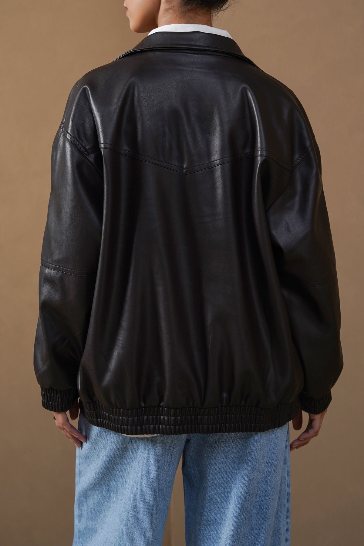 Design details: Faux leather bomber jacket with high neck, elasticated cuffs and hem, welt pockets and concealed zip with snap button placket.