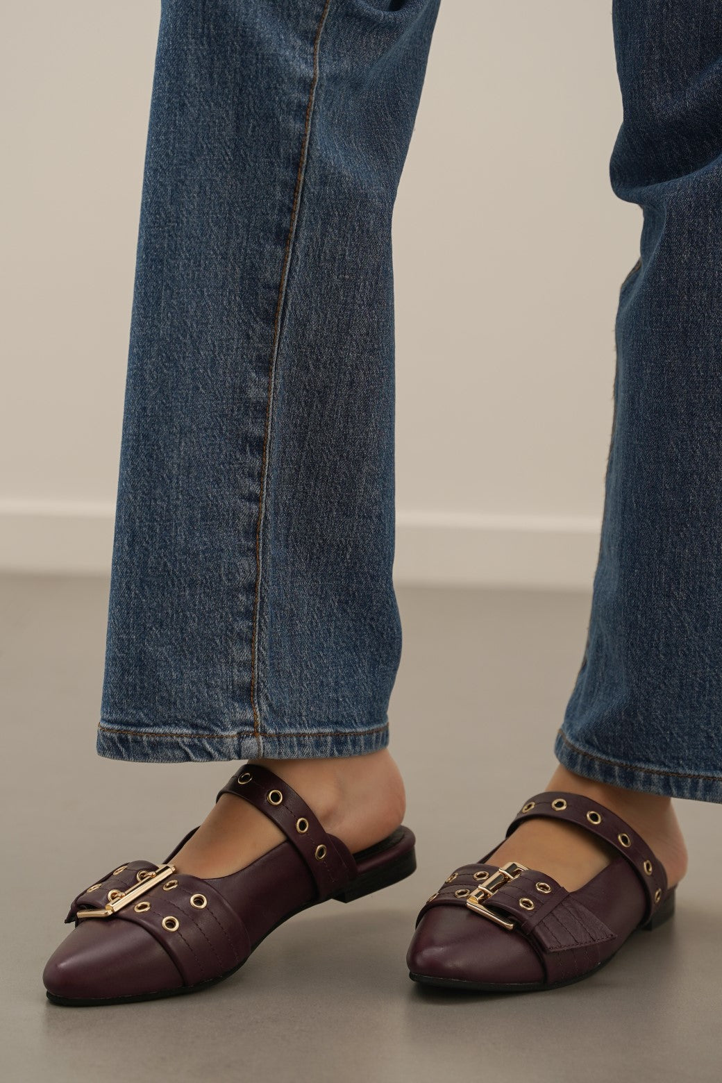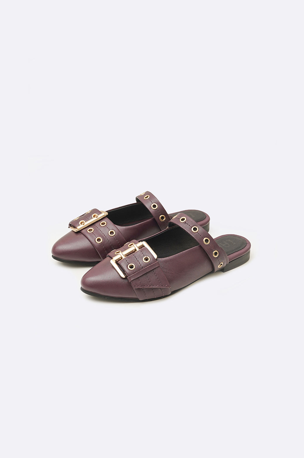 100% genuine leather mules with high quality gold rivets and buckles on the top and a pointed toe.