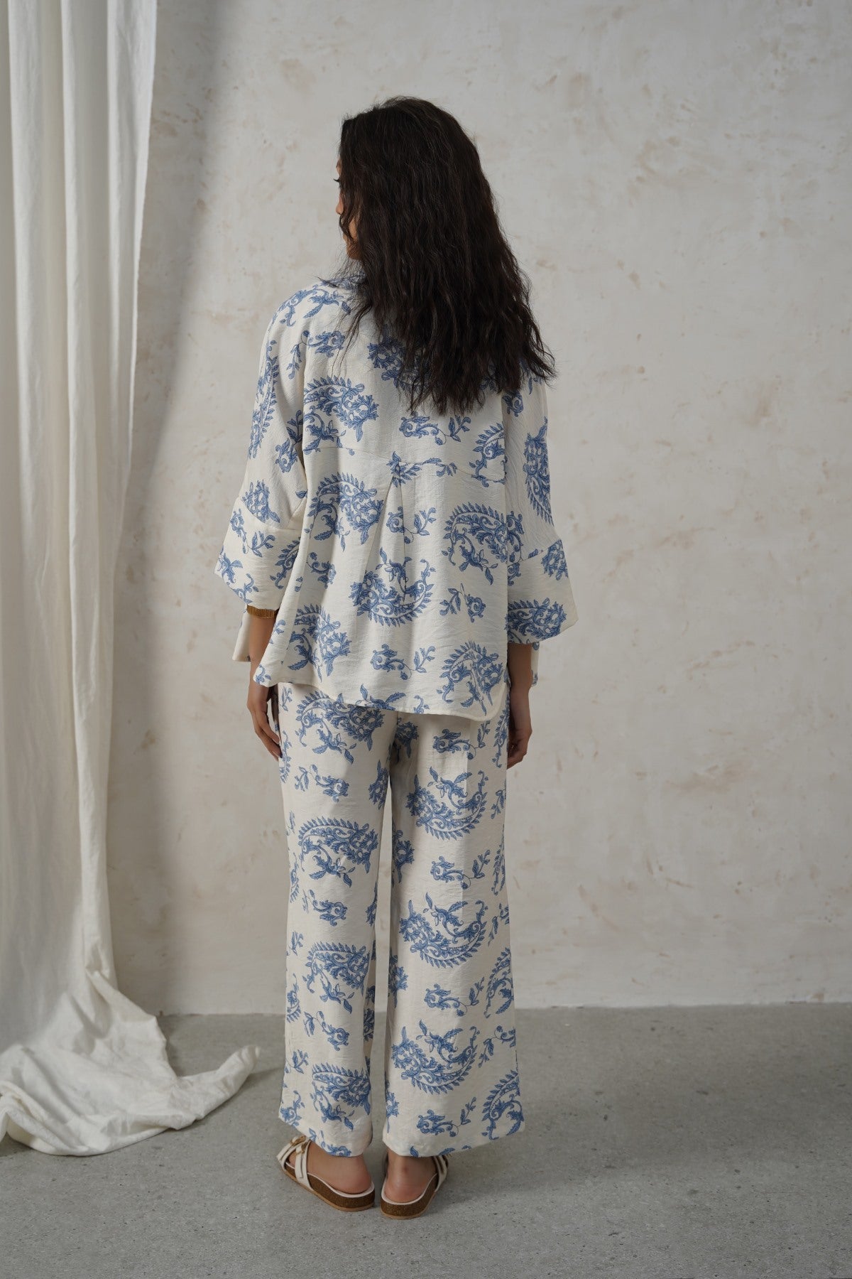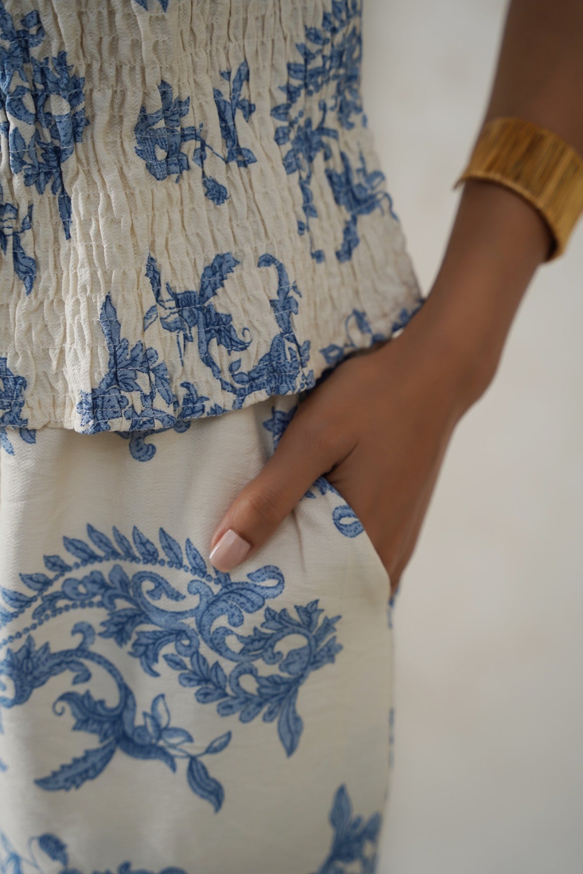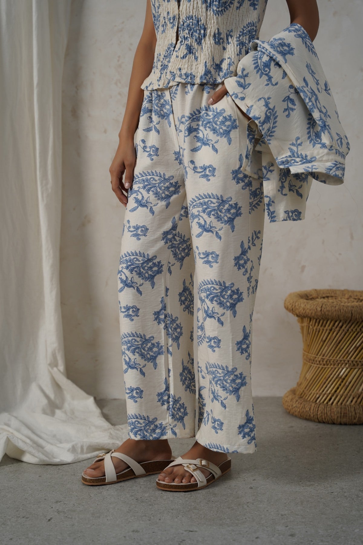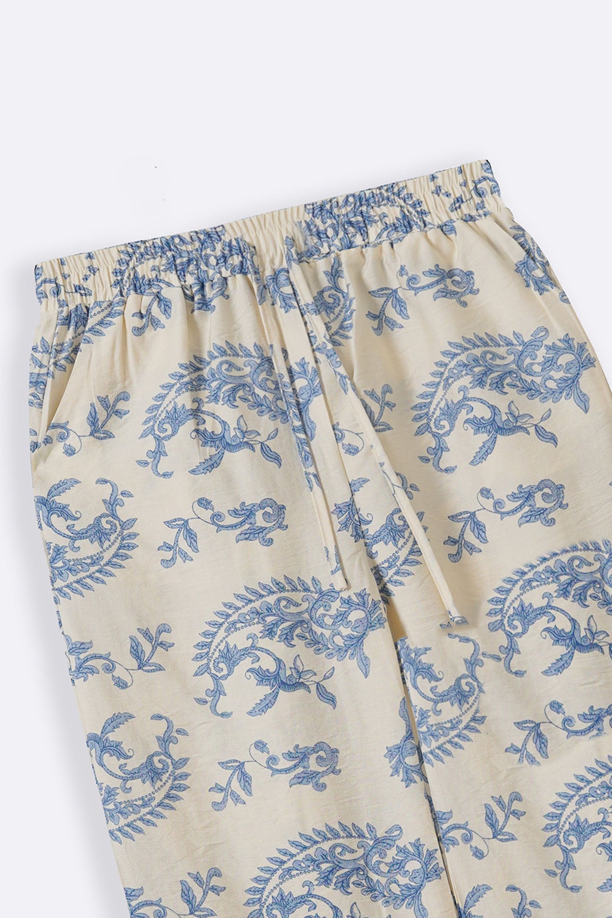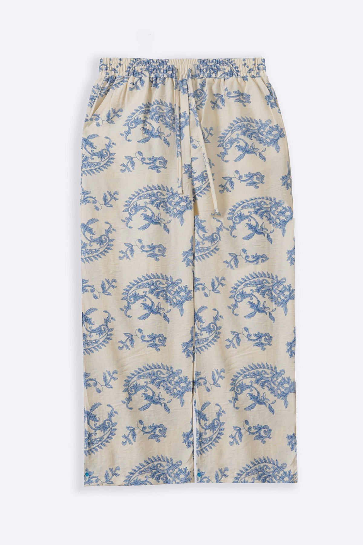 Design details: Printed wide leg pants with front cross pockets and an all around elasticated waistband with drawstring.