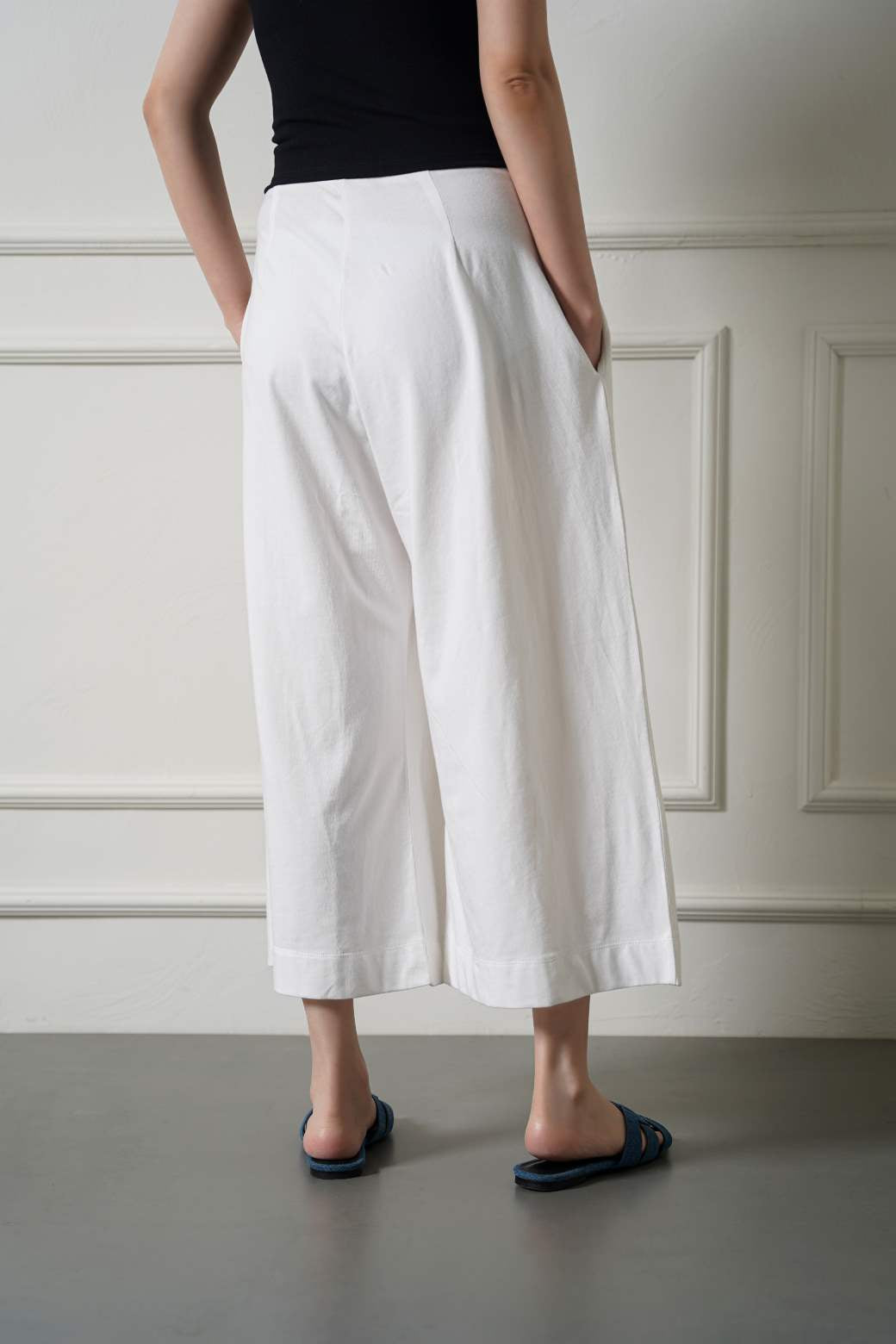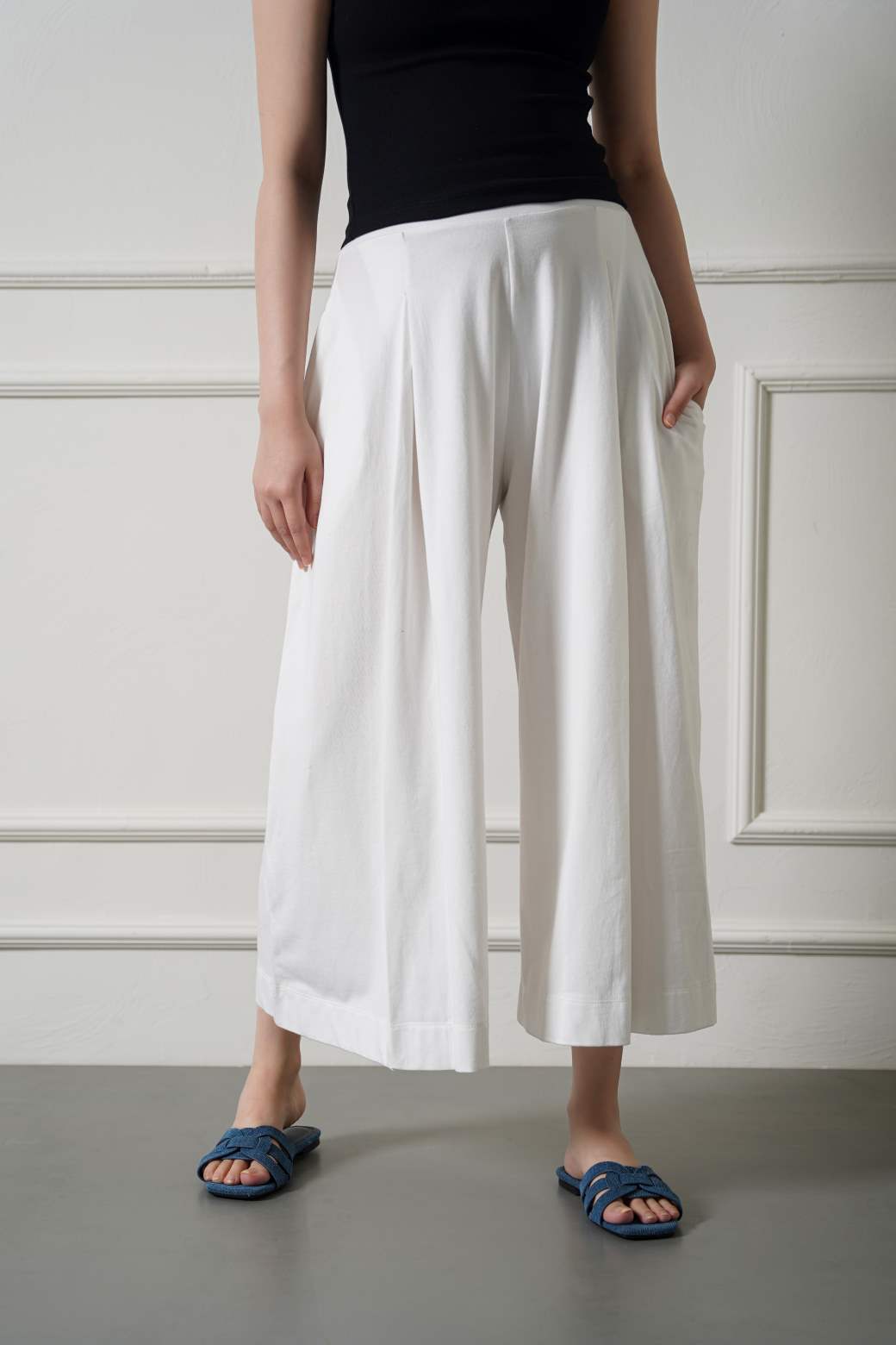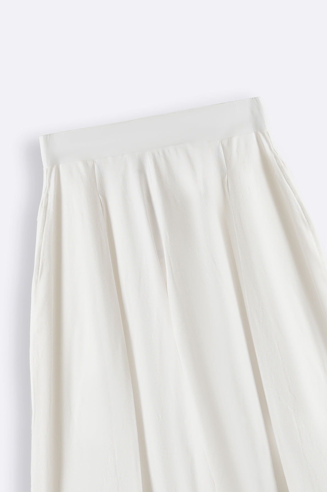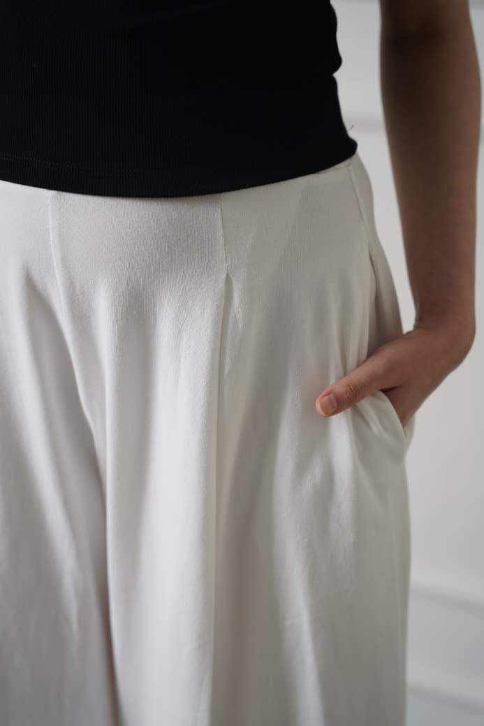 Design detail: Wide Leg trouser with front pleats, elasticated waistband and side pockets