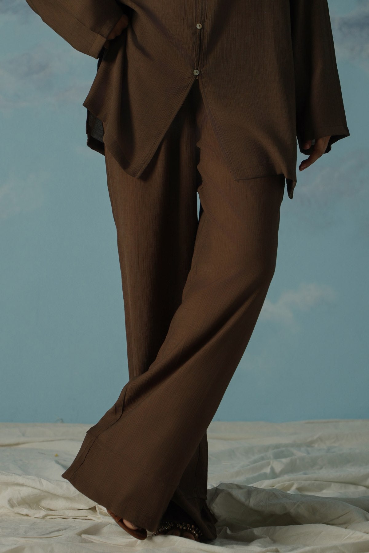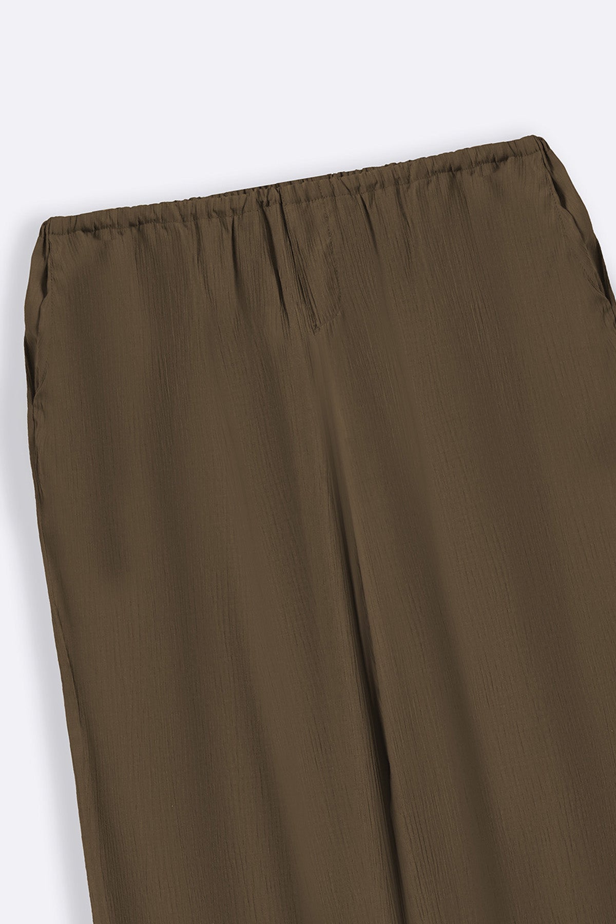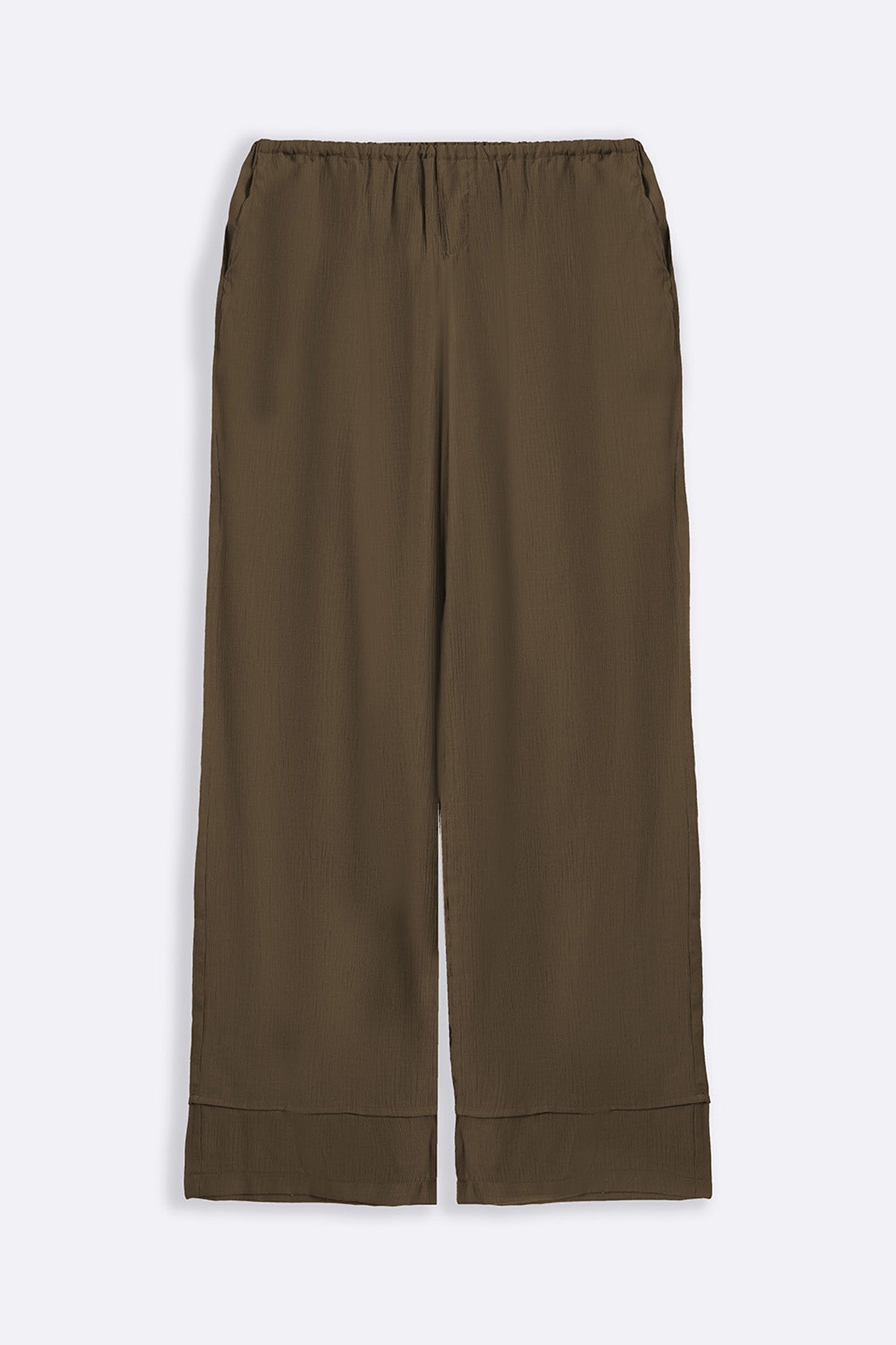 Design details: Relaxed fit pants with front side pockets, creased cut detail at bottom and an all around elasticated wasitband with drawstring.