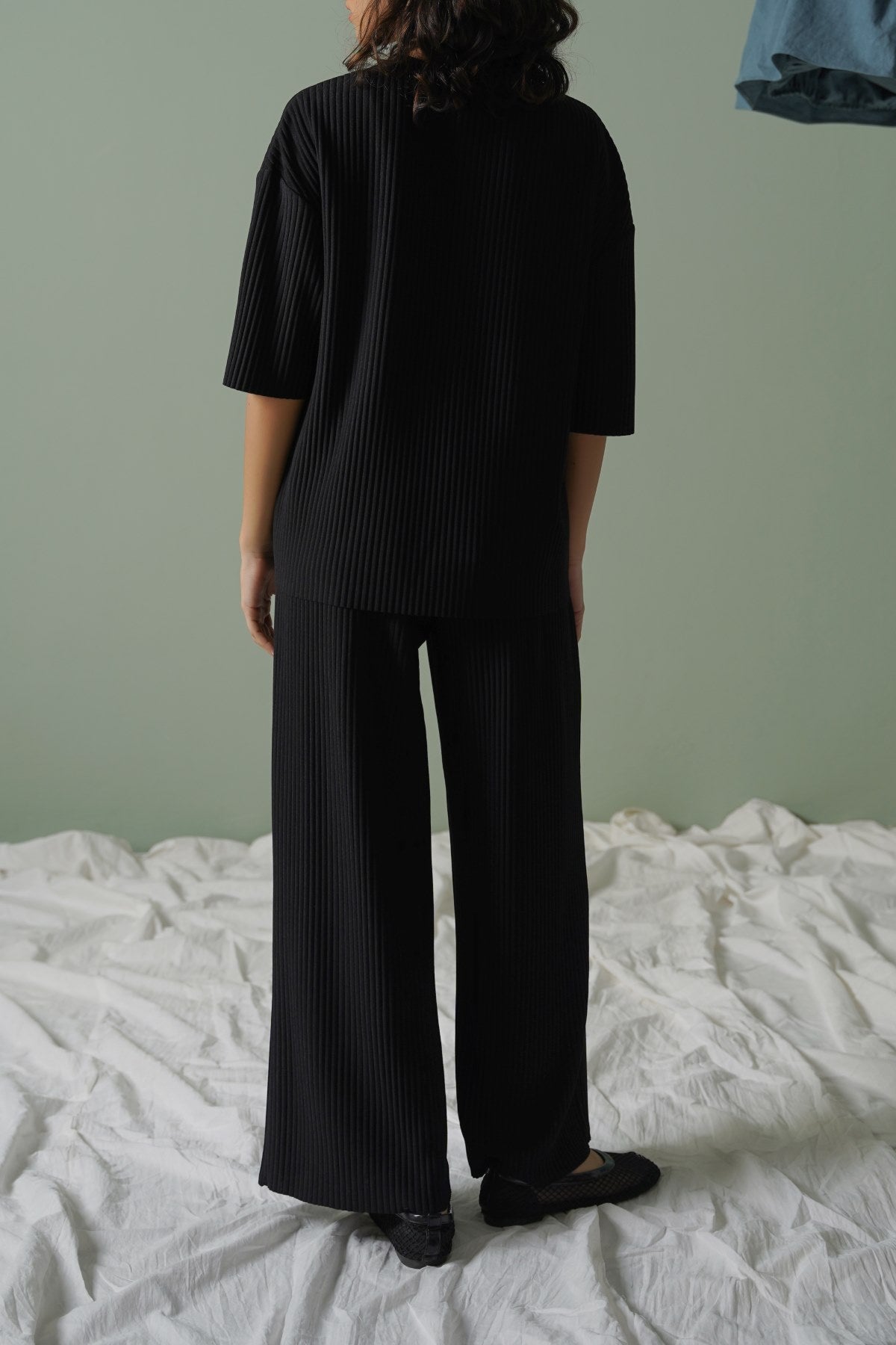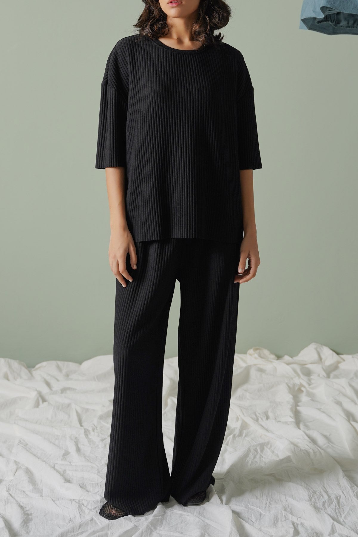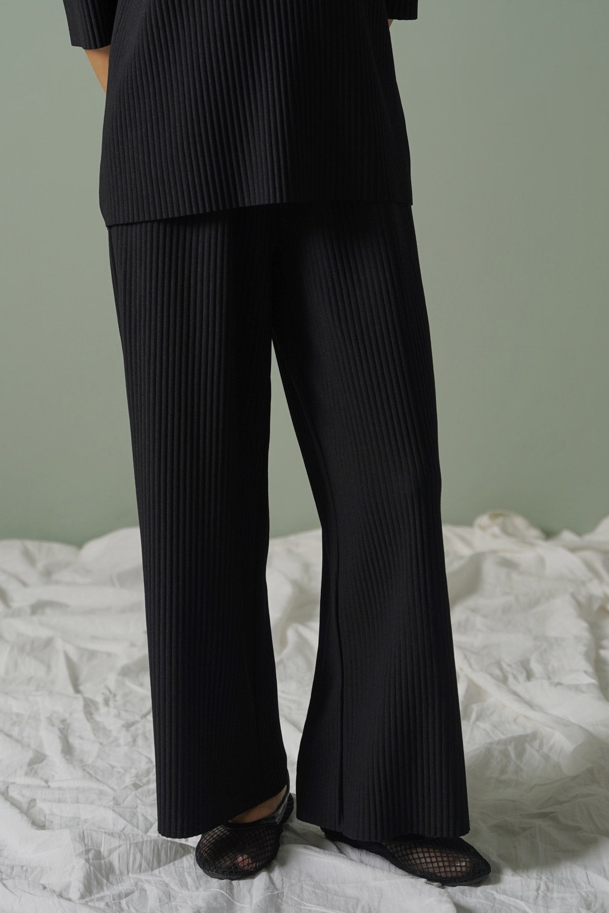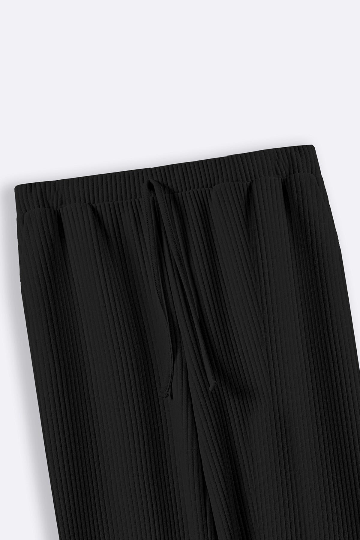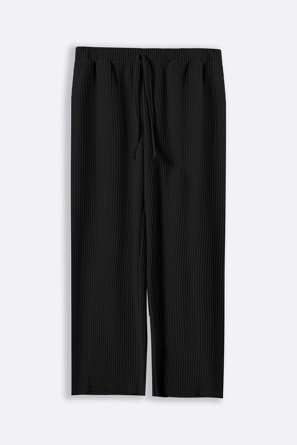Design details: Stretchy waistband trousers featuring drawstrings and side pocket details.