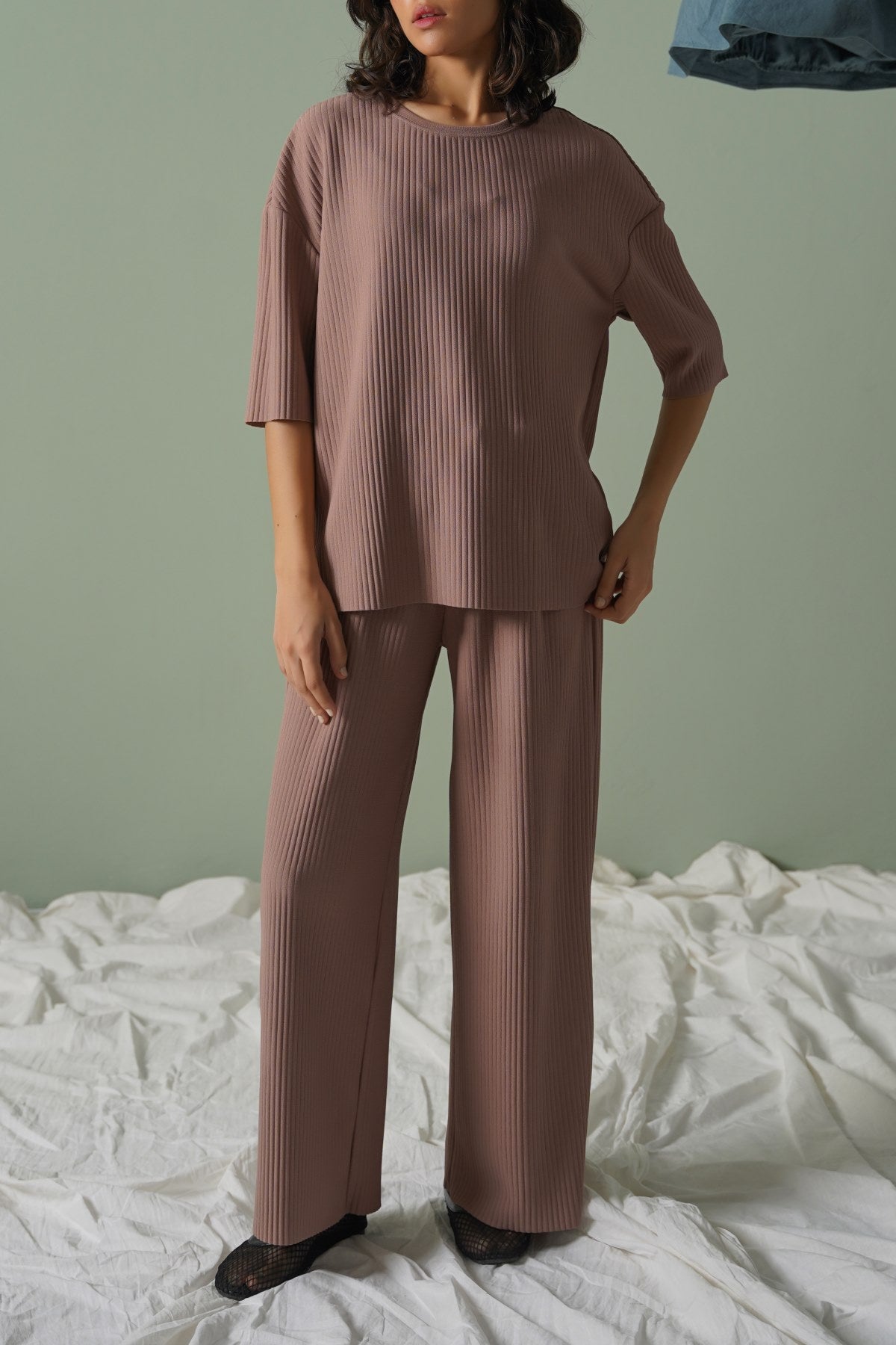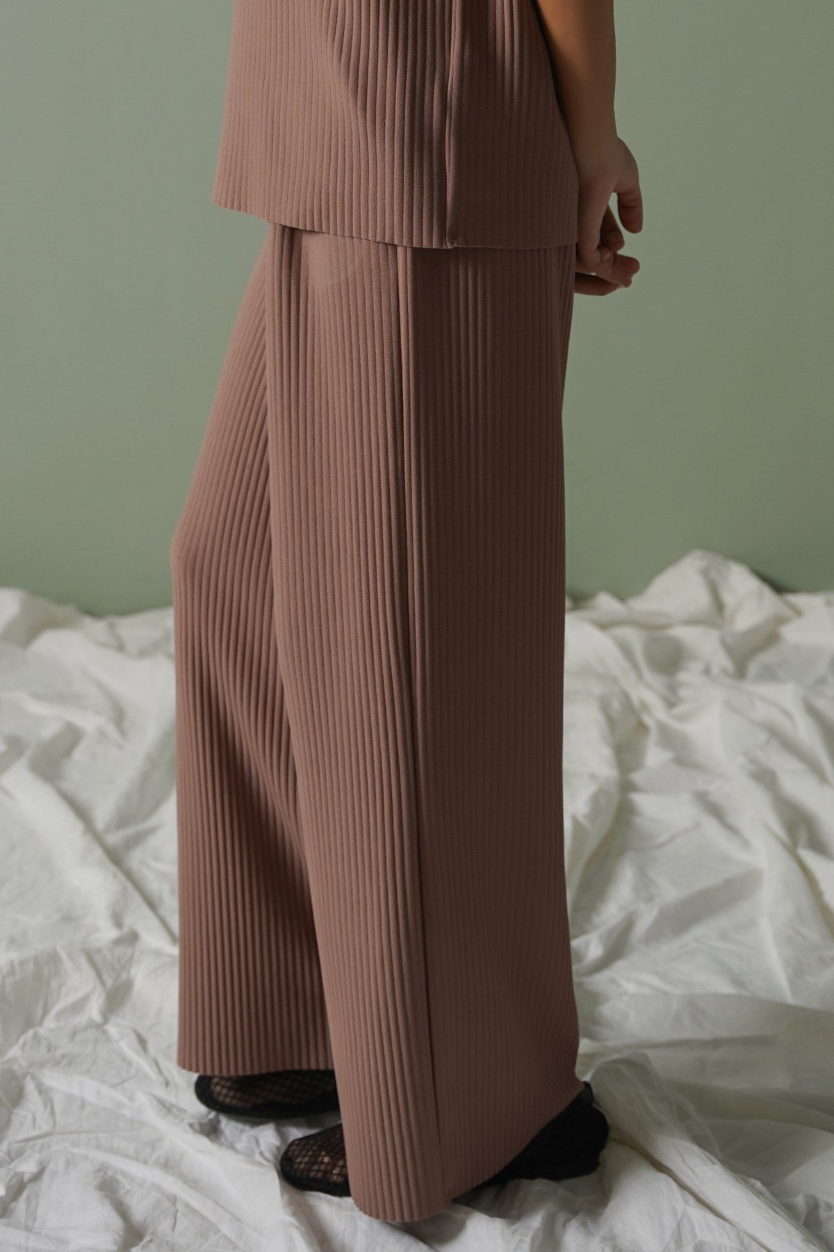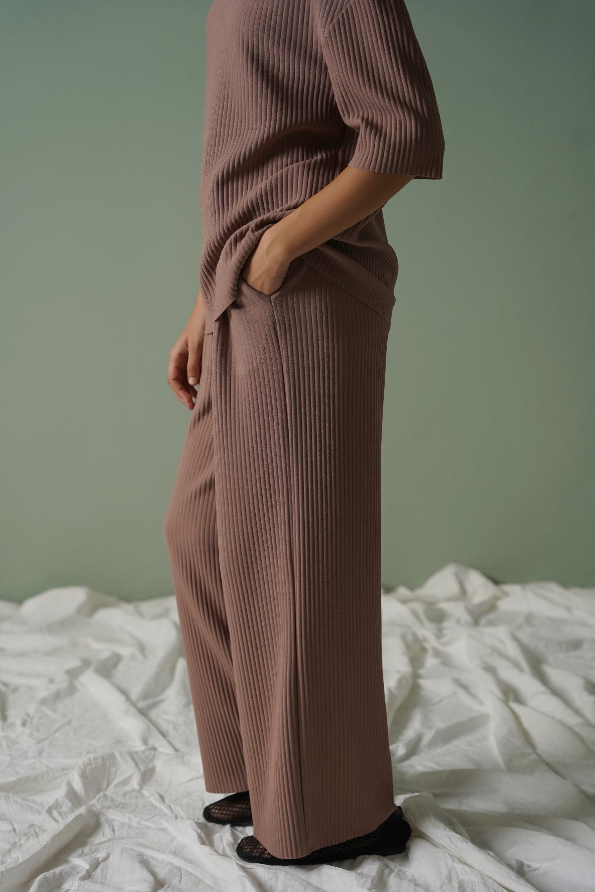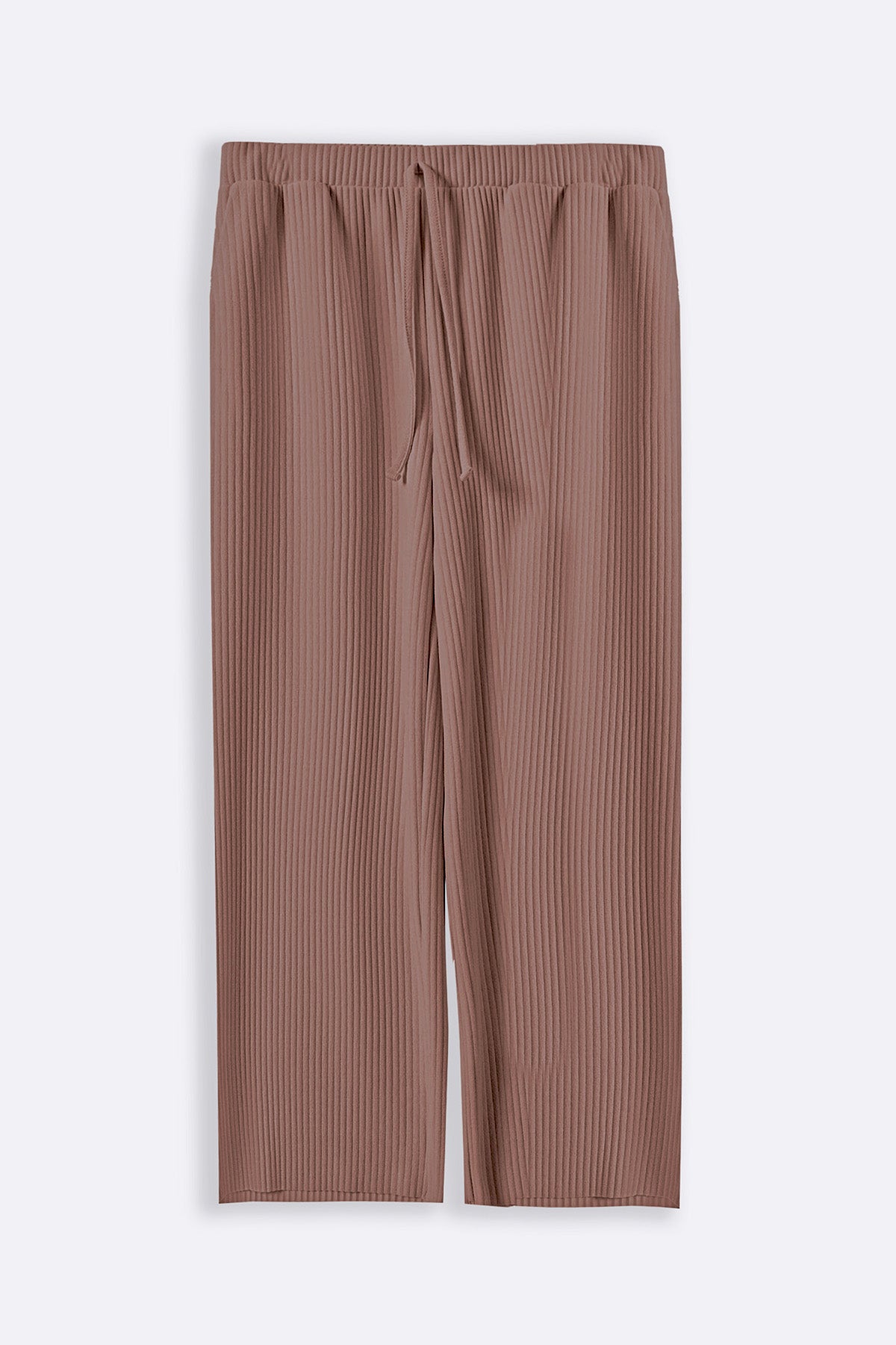 Design details: Stretchy waistband trousers featuring drawstrings and side pocket details.