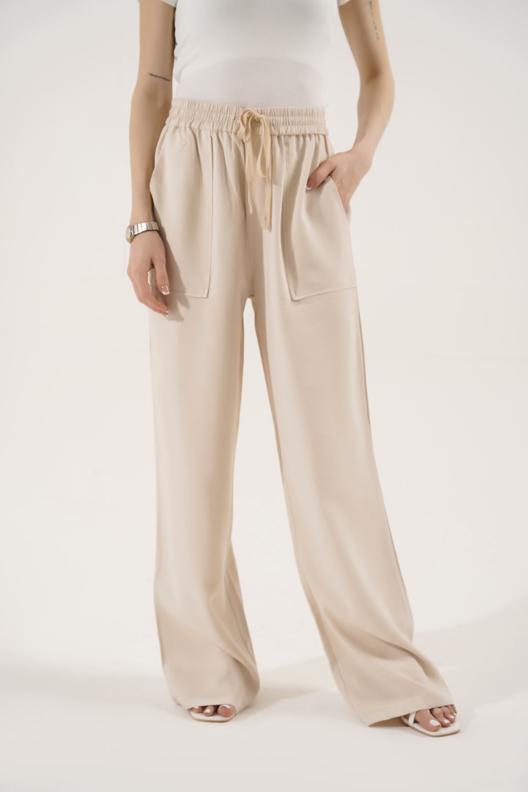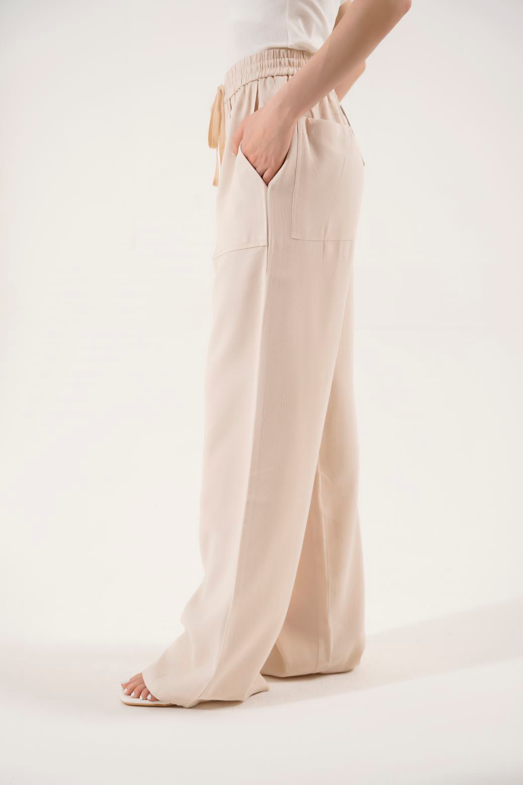 Design details: Wide-leg trouser with exaggerated pockets sits cool and relaxed at the waist. Length runs long