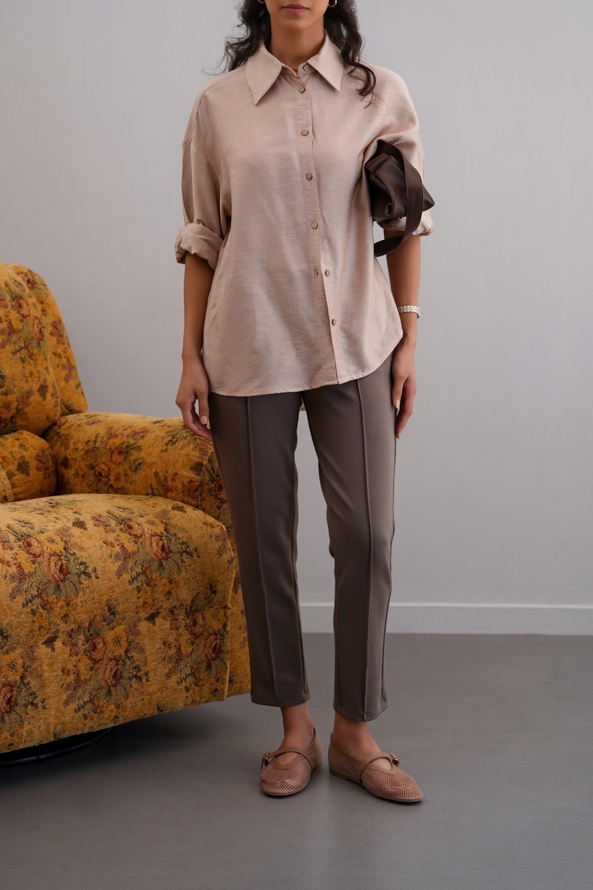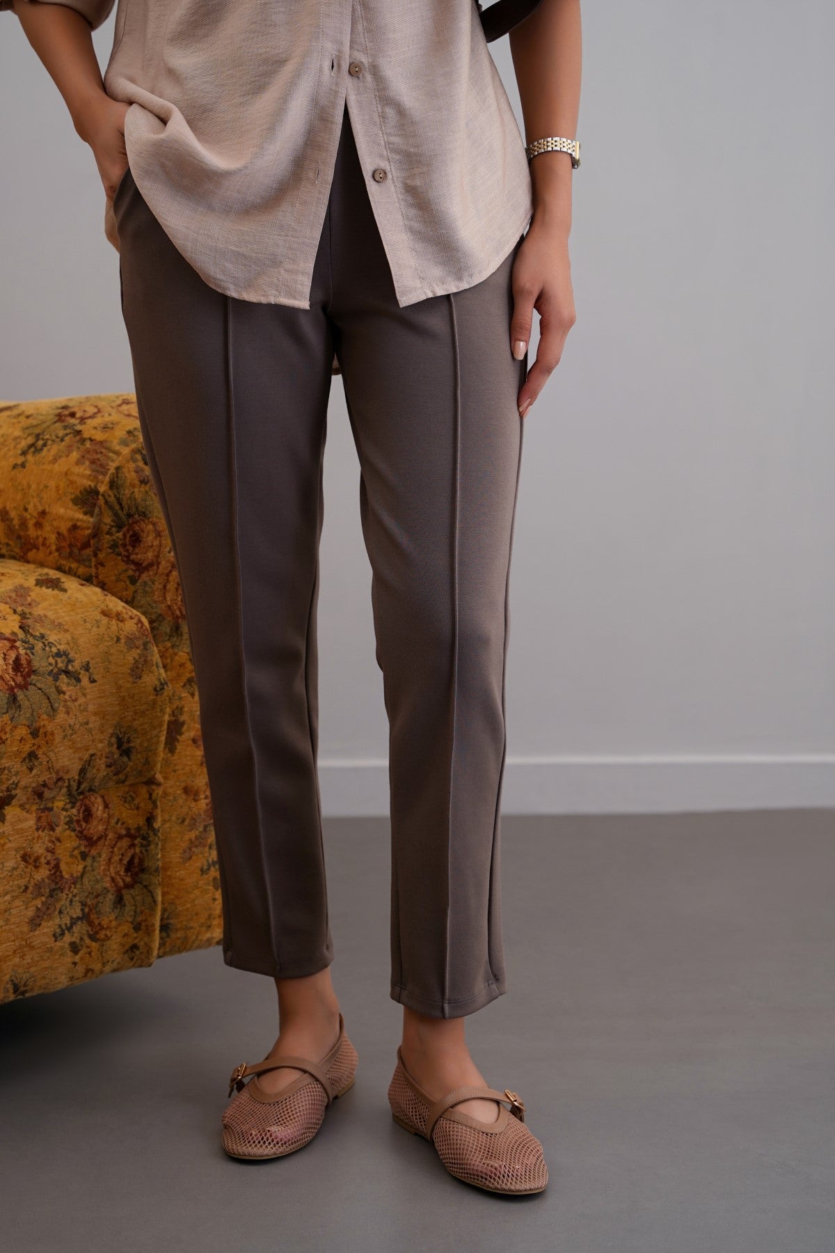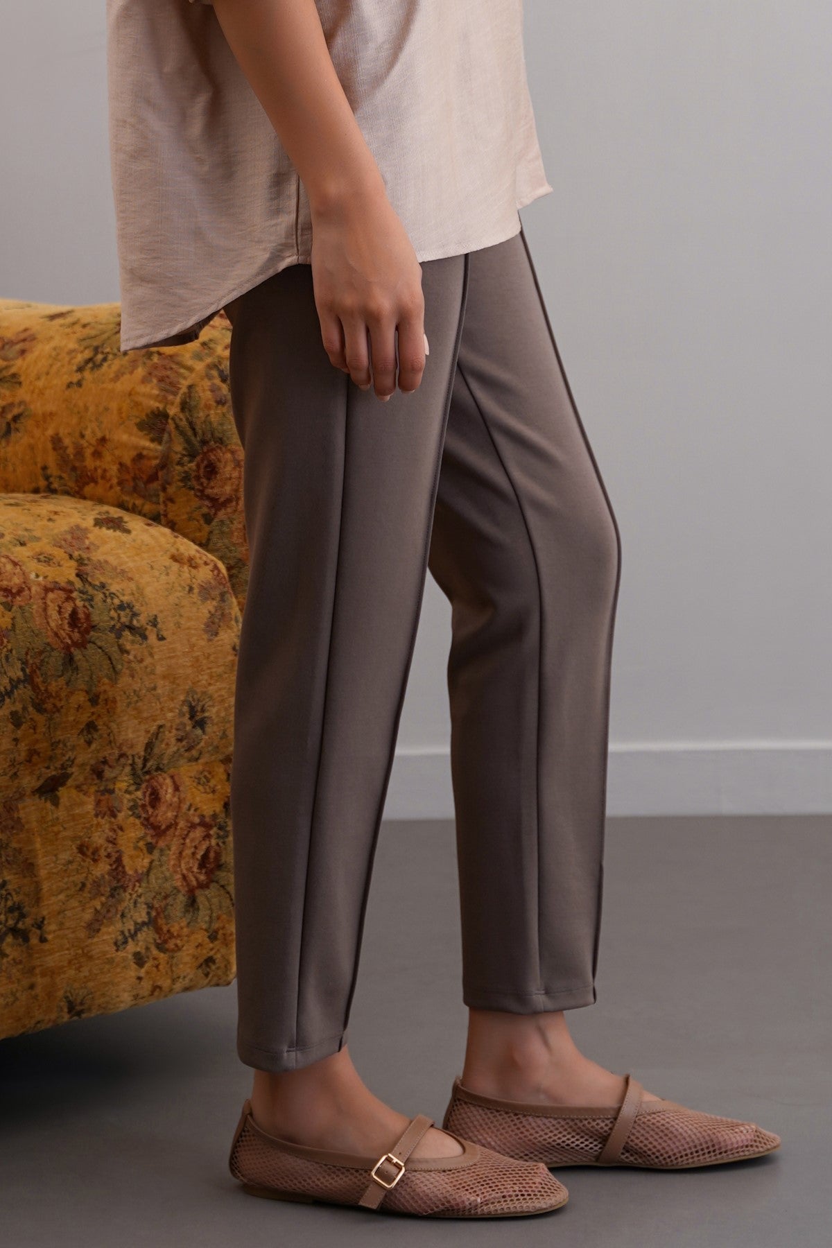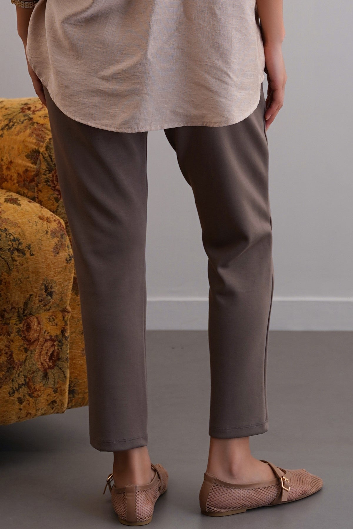 Design details: Tapered trousers with a belted front and elasticized back along with front pleats and side pockets.
