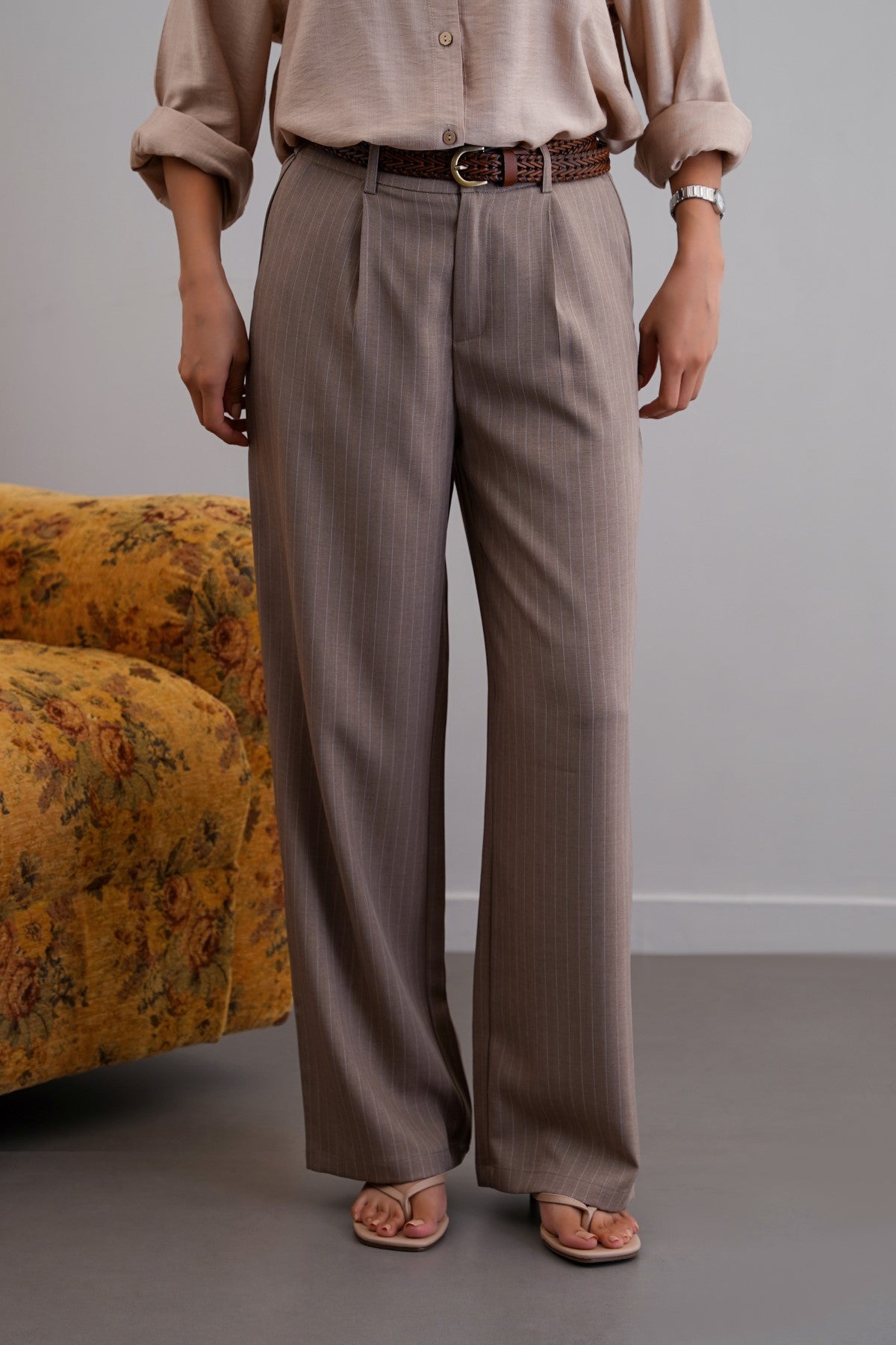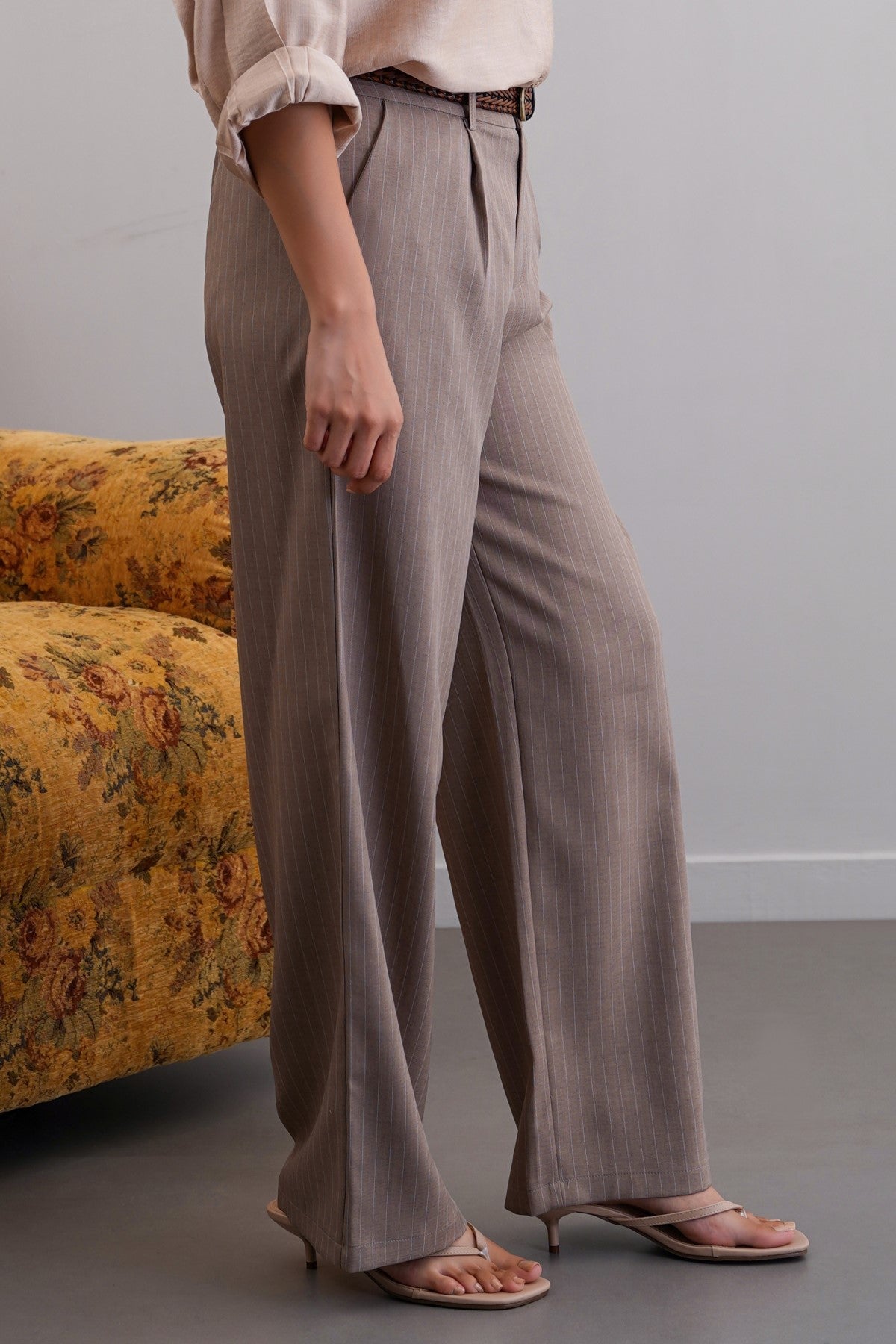 BEIGE TAILORED PINSTRIPE PANTS