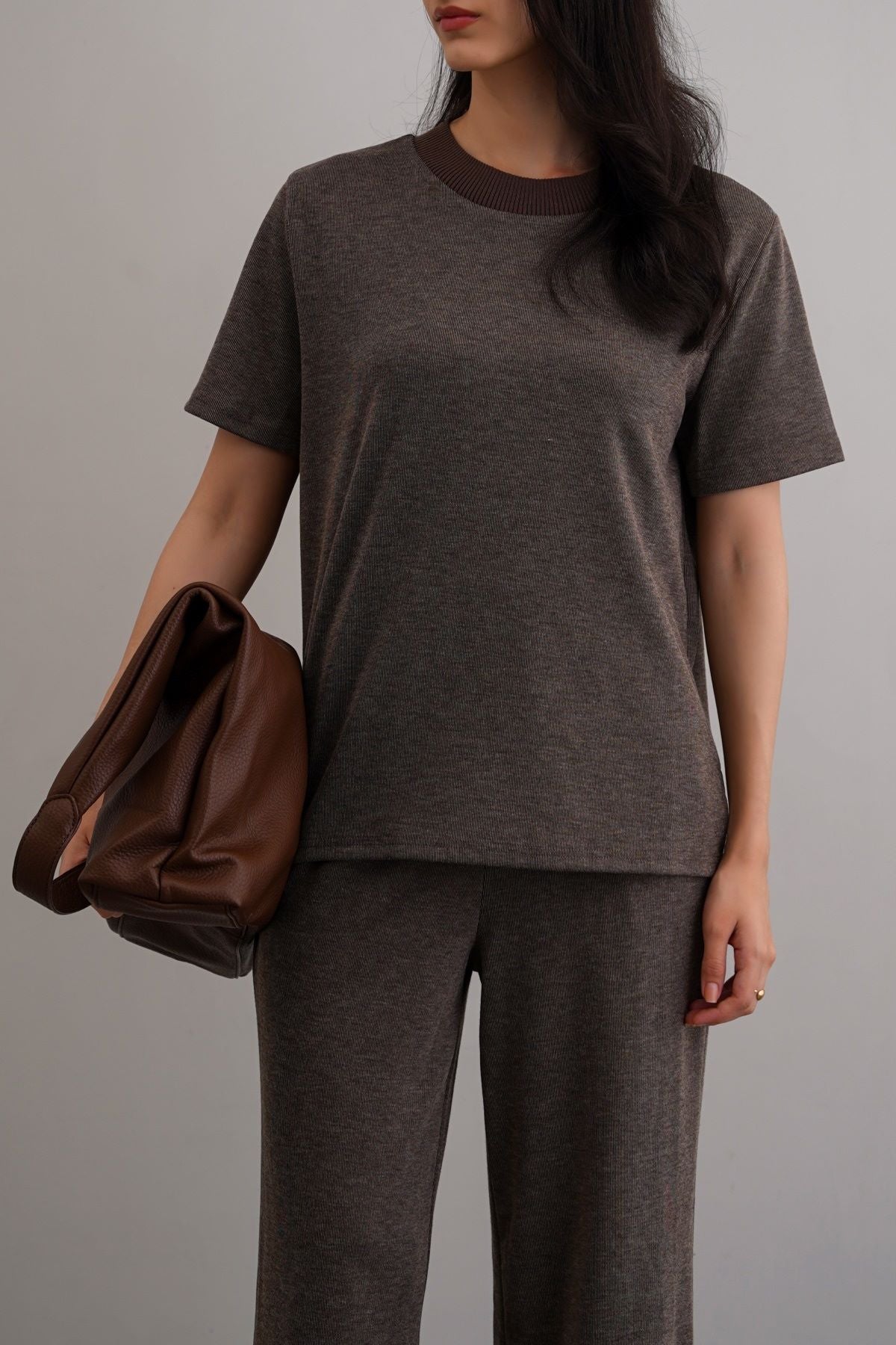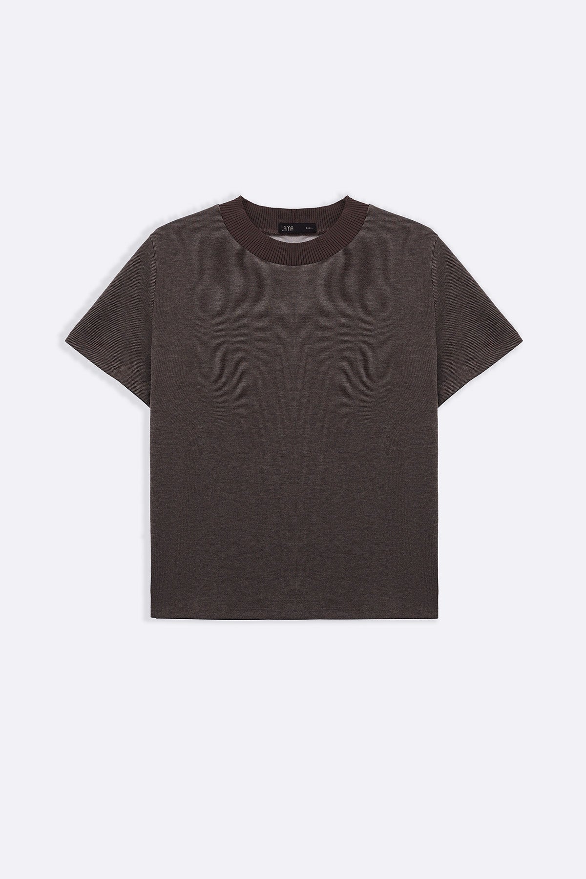 Design Details: Ribbed tee with short sleeves, side vents, and a thick ribbed neckline trim.