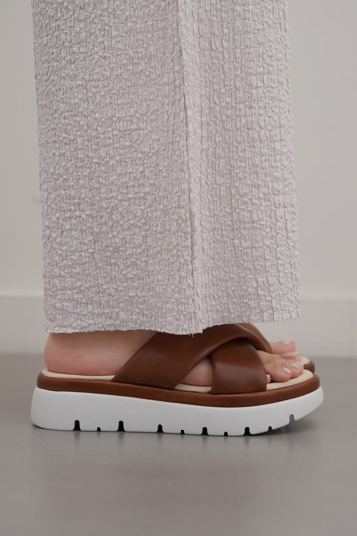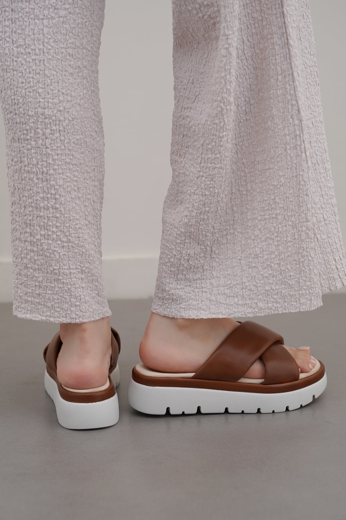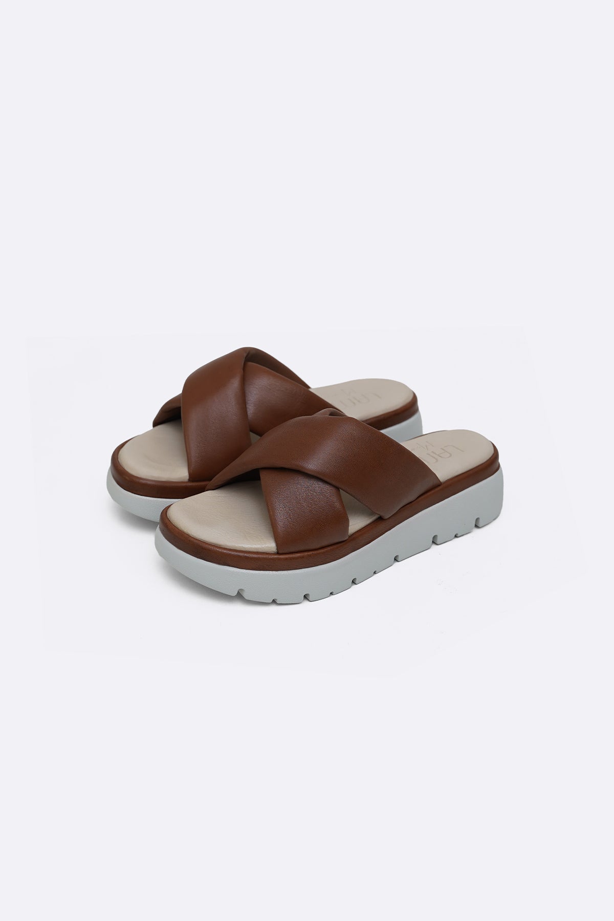 Genuine Leather marshmallow soft mama criss cross slides with memory foam insole.