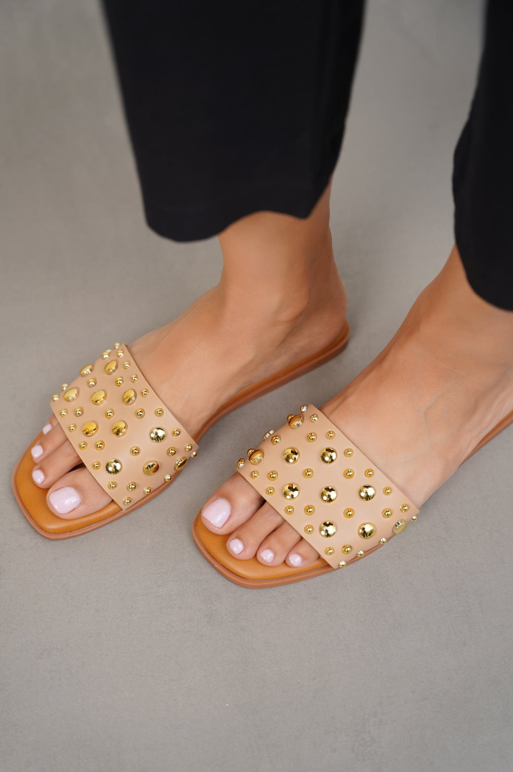 Design detail: Wide strap slides with gold studs, comfortable insole and anti-slip outsole.