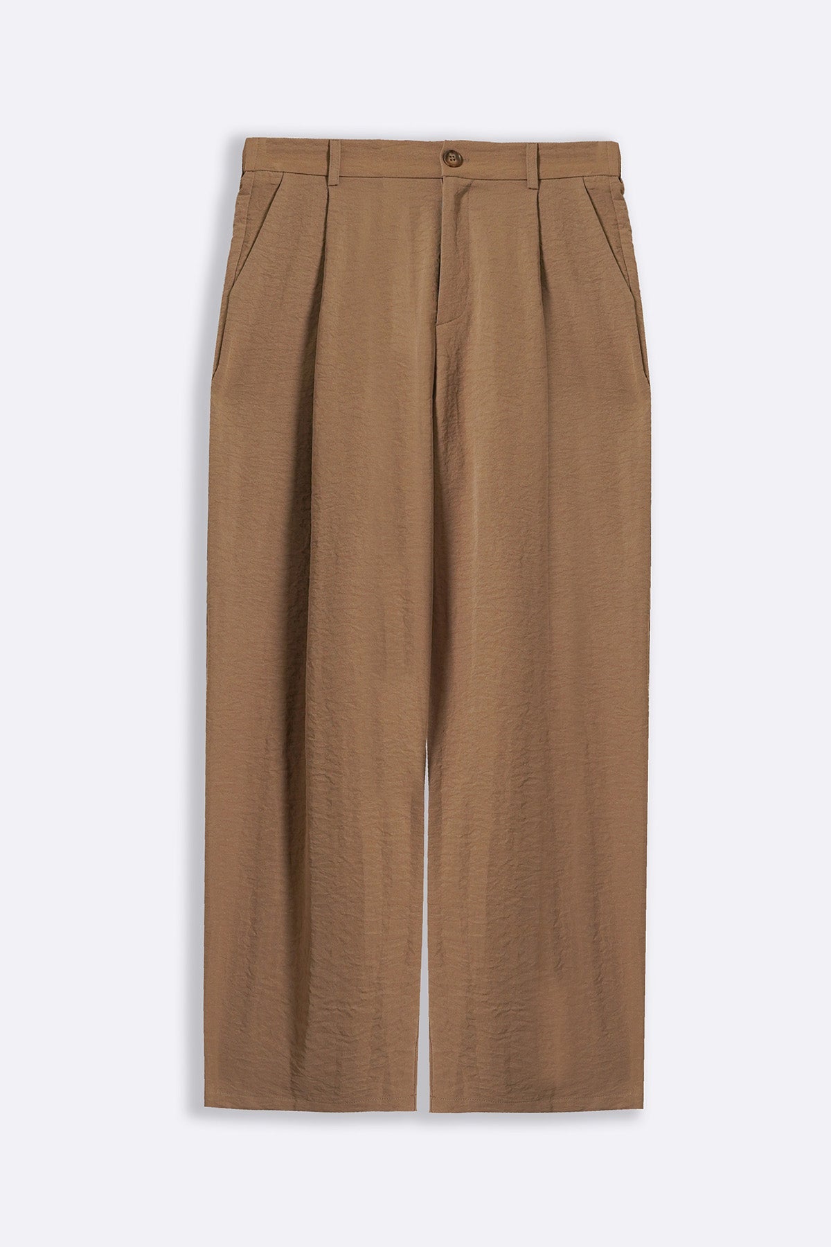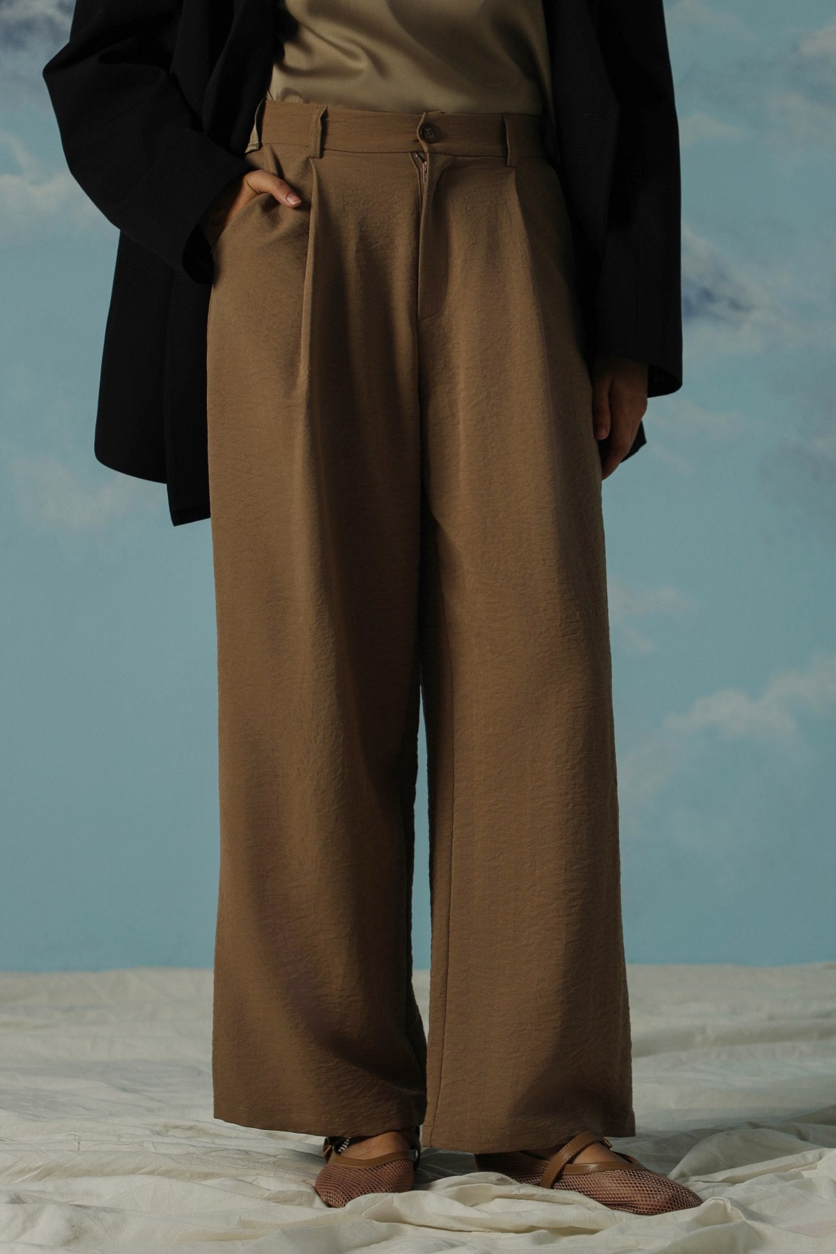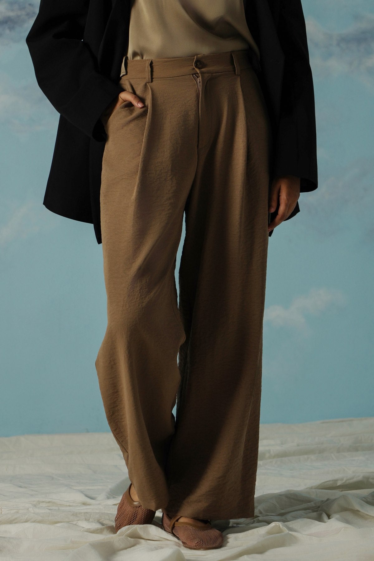 Design details: Pleated wide leg pants with side pockets, front button closure and an elasticated back.