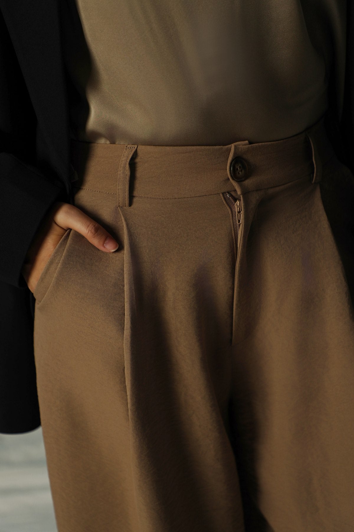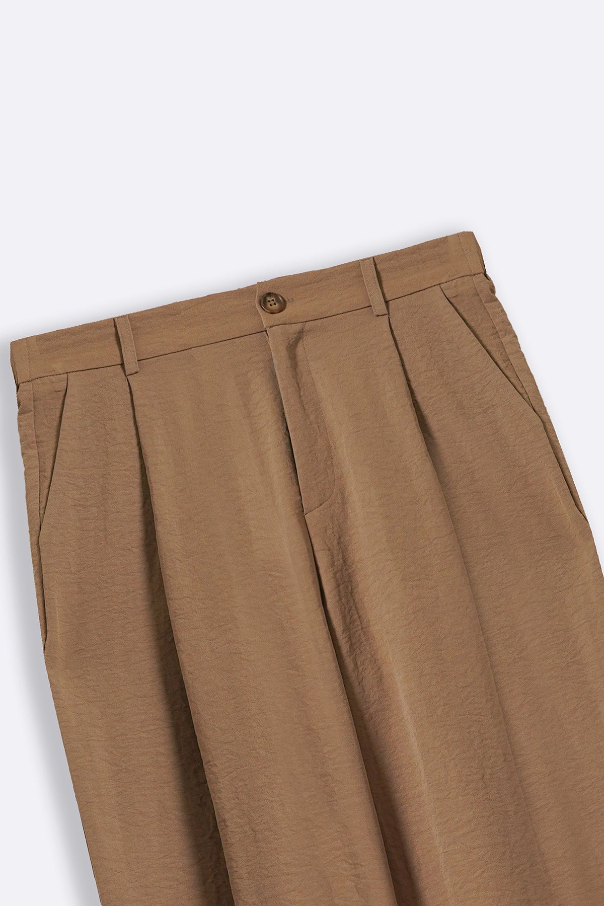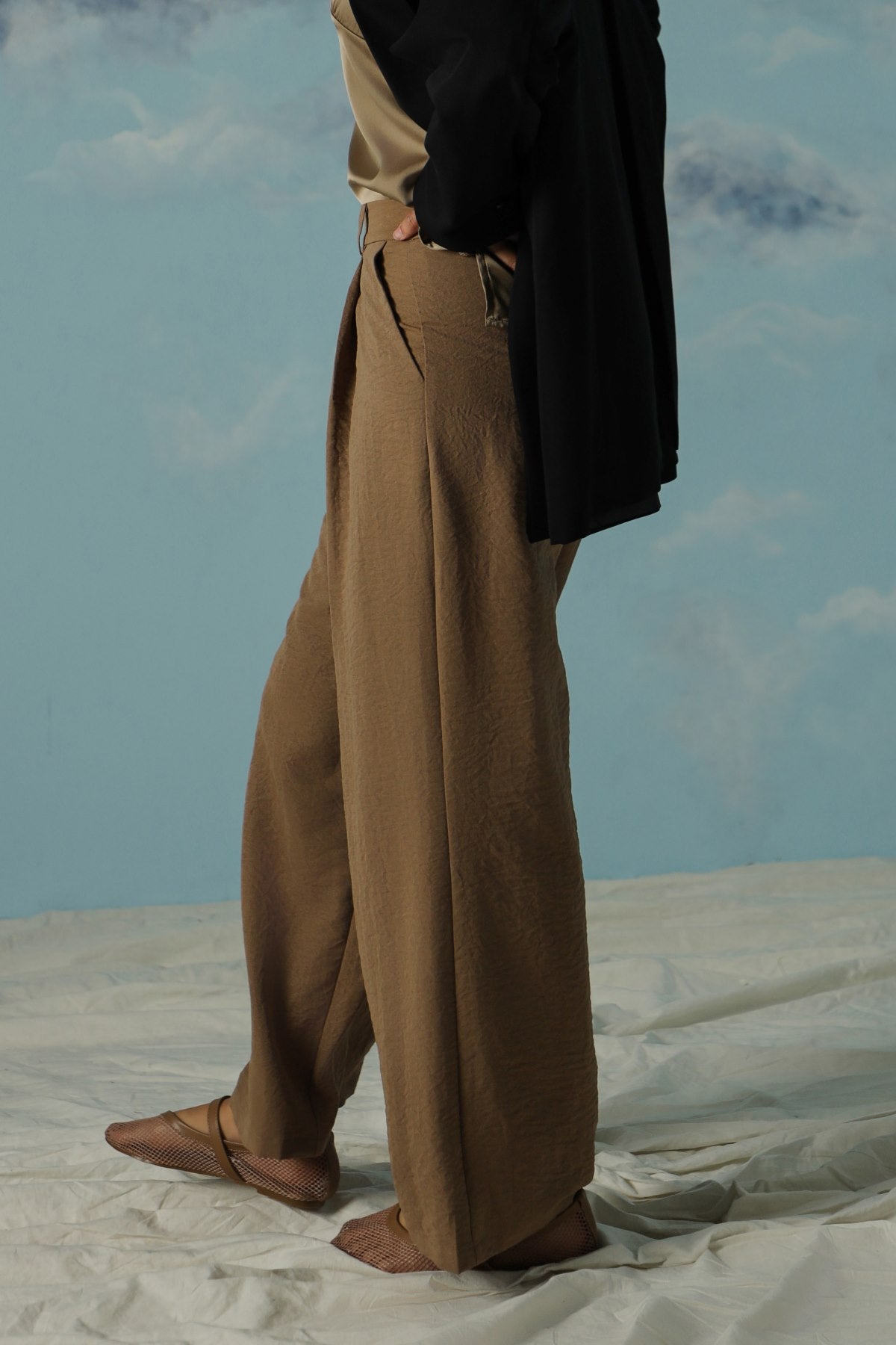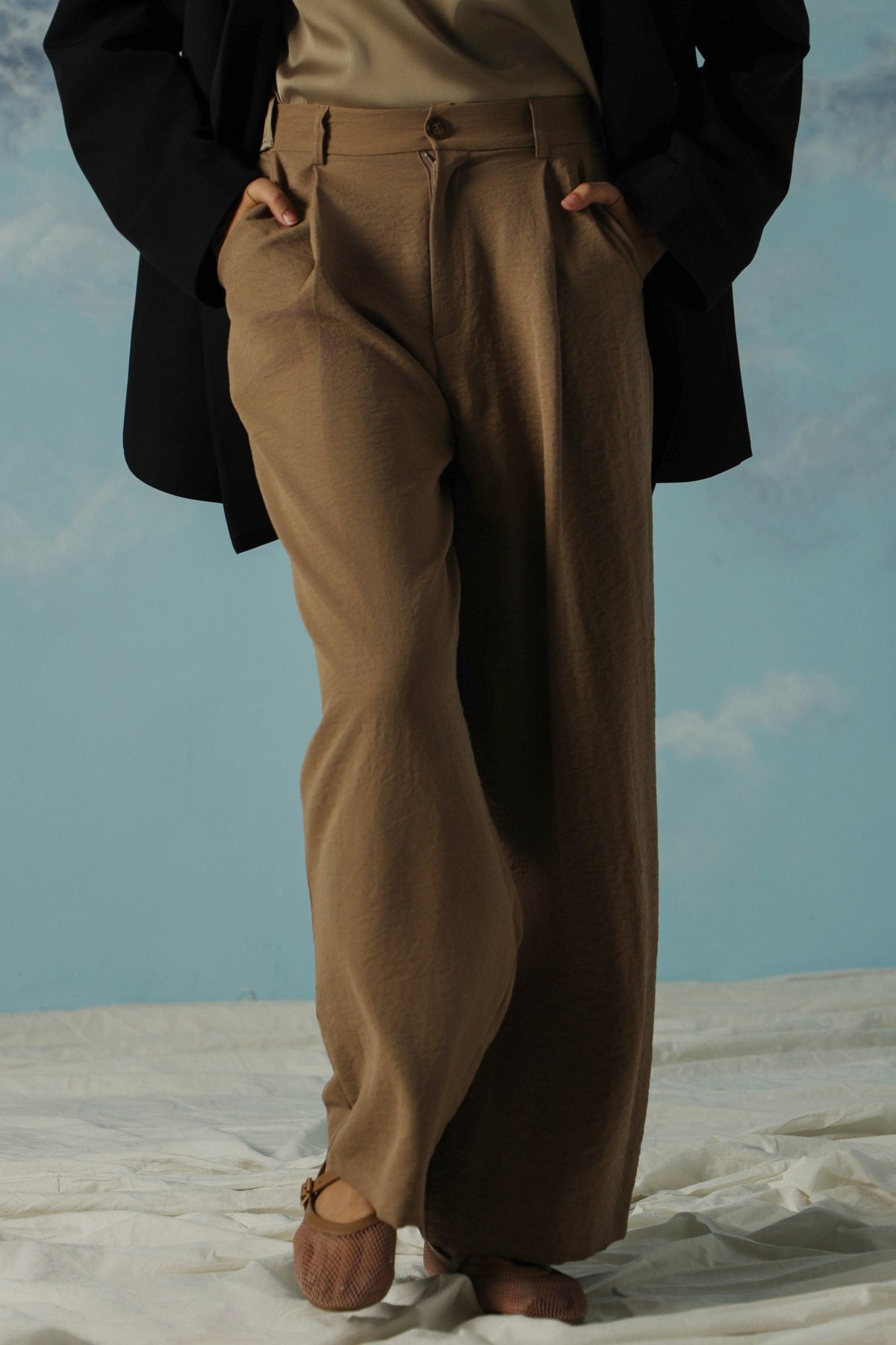 Design details: Pleated wide leg pants with side pockets, front button closure and an elasticated back.