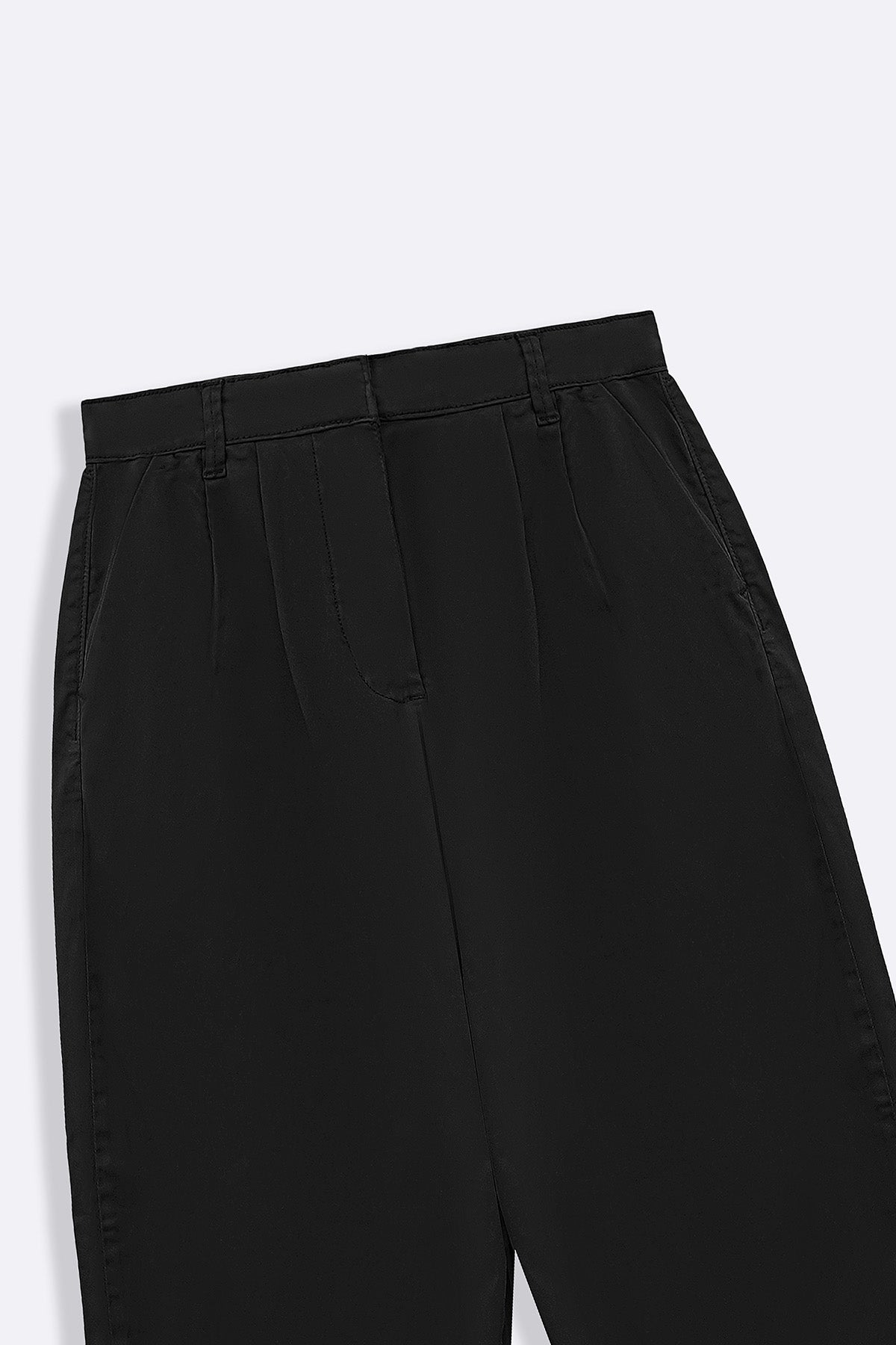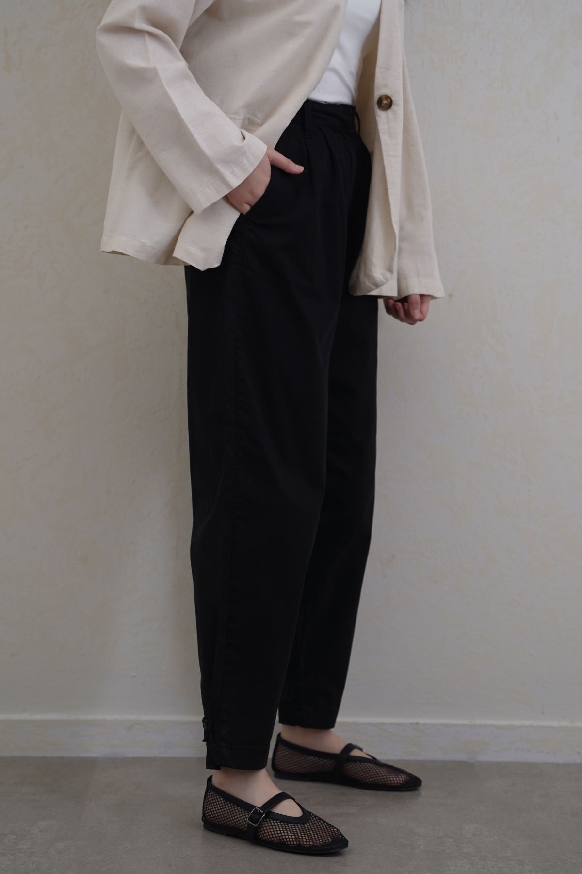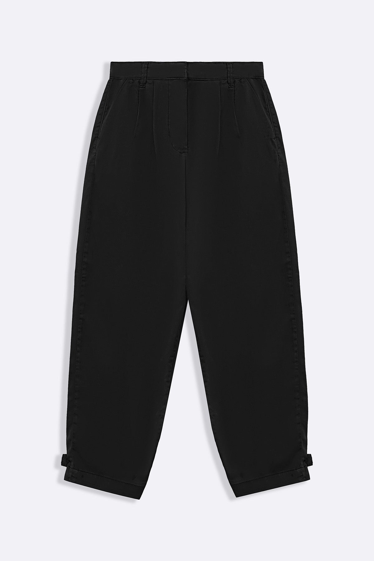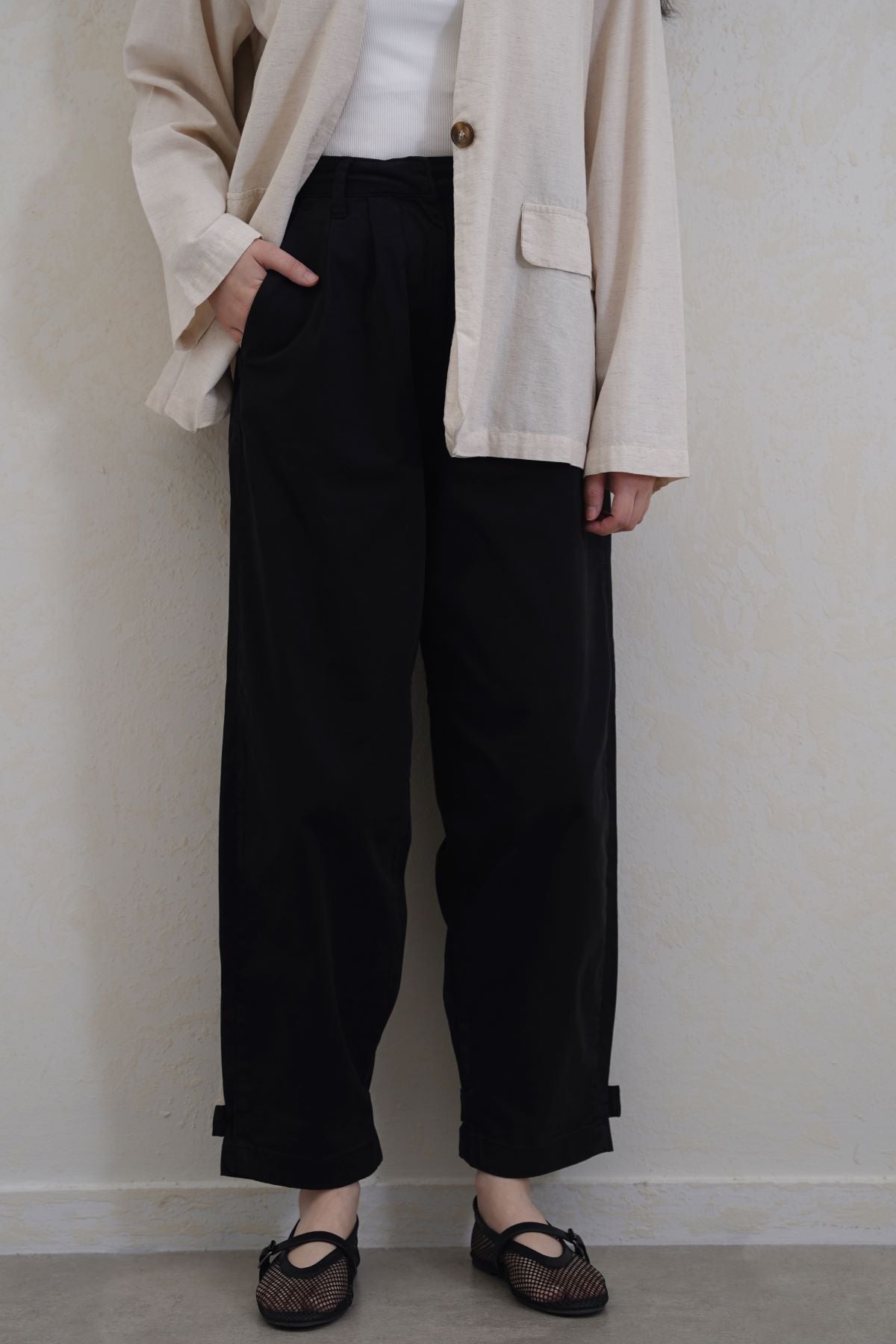 Design details: High-waisted mom-fit pants featuring front pleats and an adjustable button strap at the hem. It has front cross pockets, back bone pockets, and a zip fly closure.