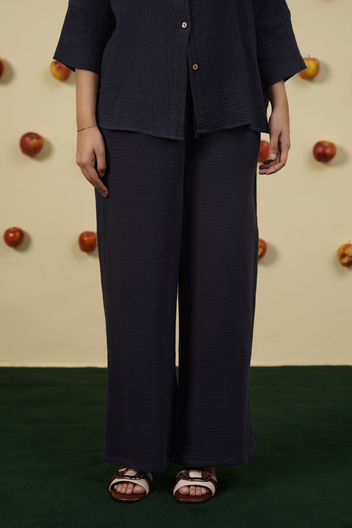 Design details: Muslin wide leg pants with side pockets and an all around elasticated waistband with drawstrings.