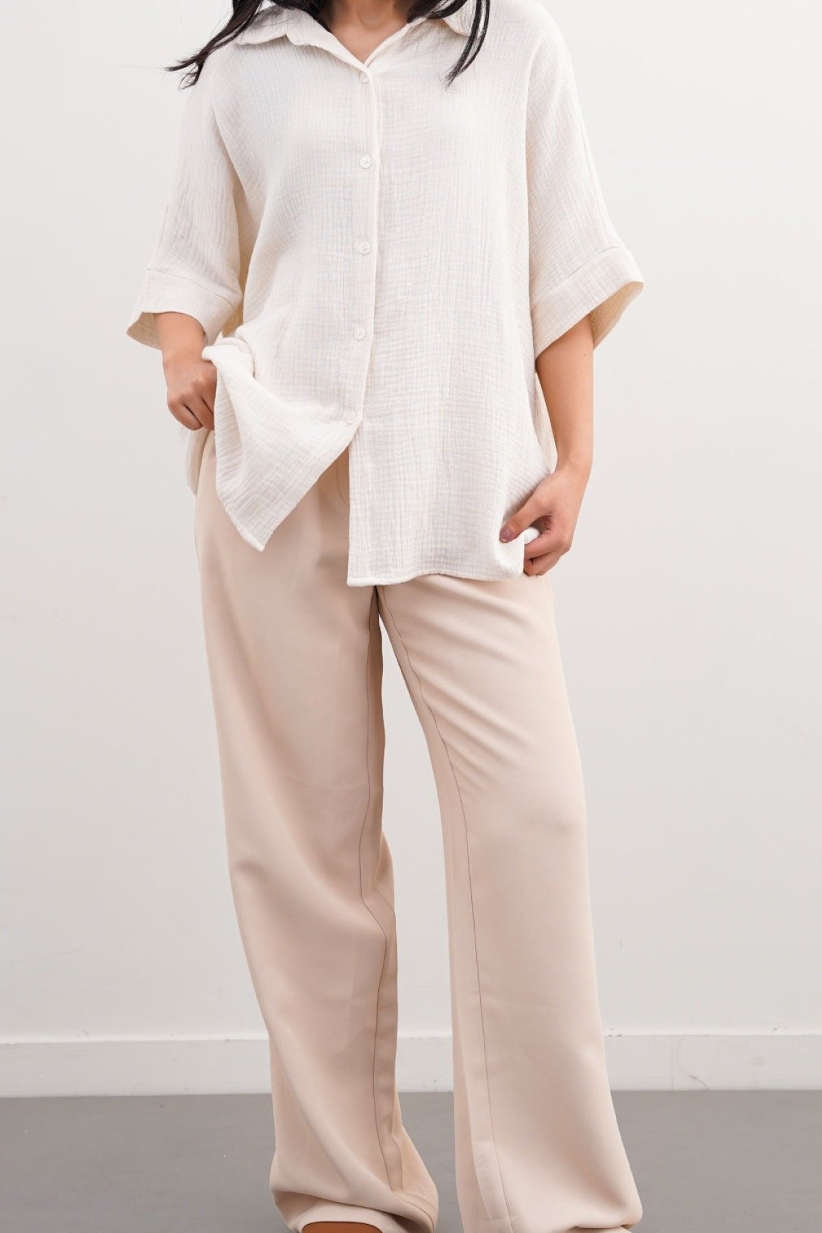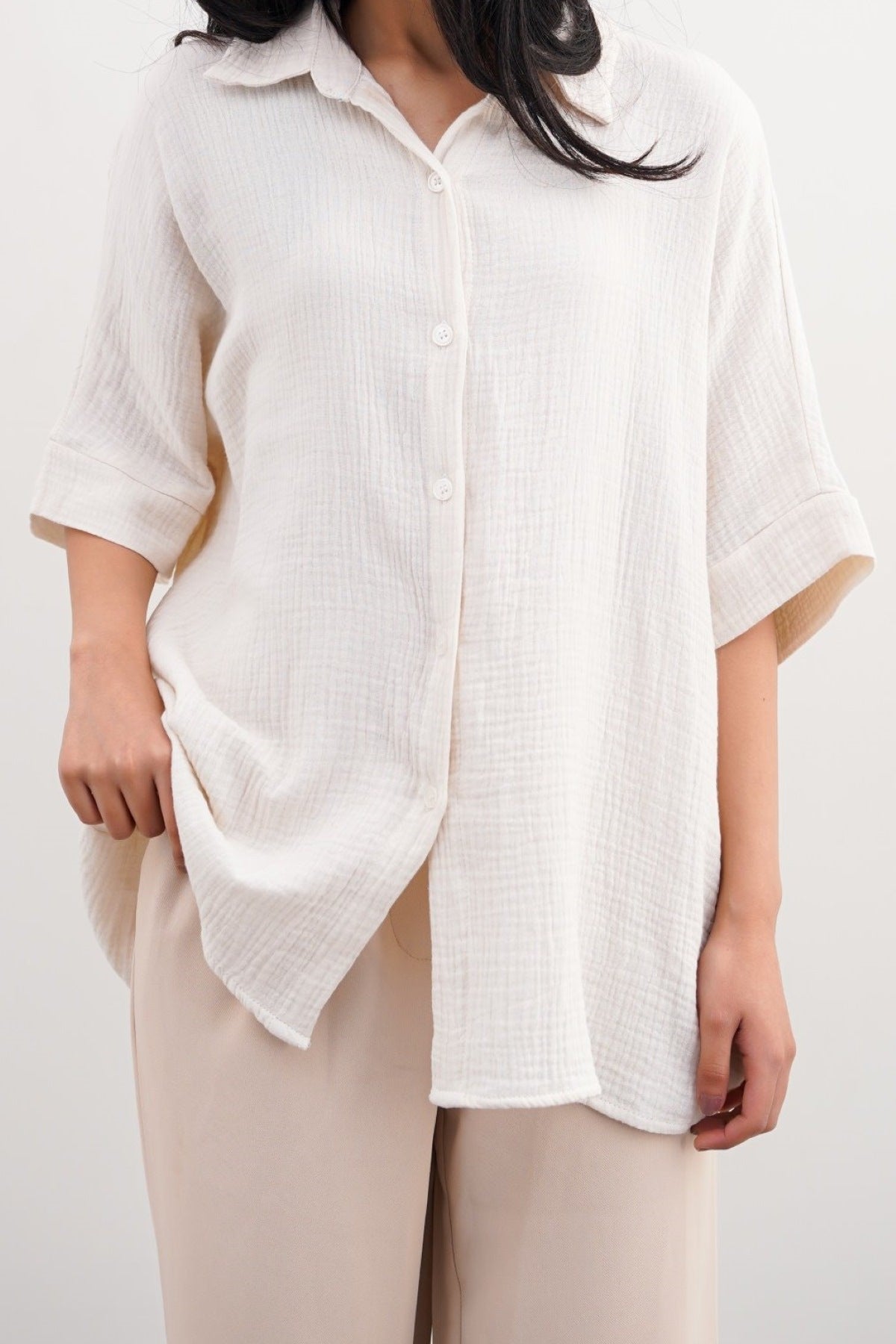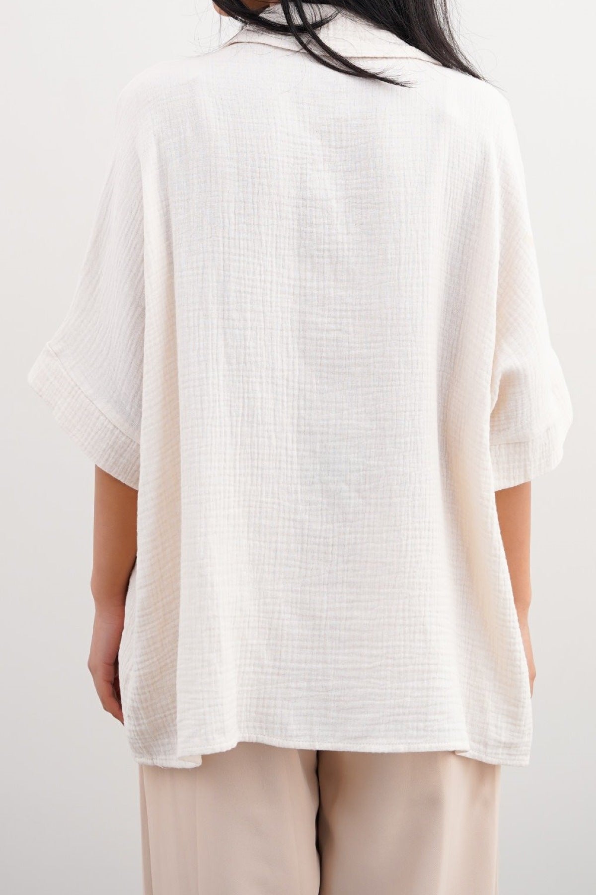 Design details: Solid muslin collared button down blouse with short sleeves. One piece batwing cutline without an armhole.