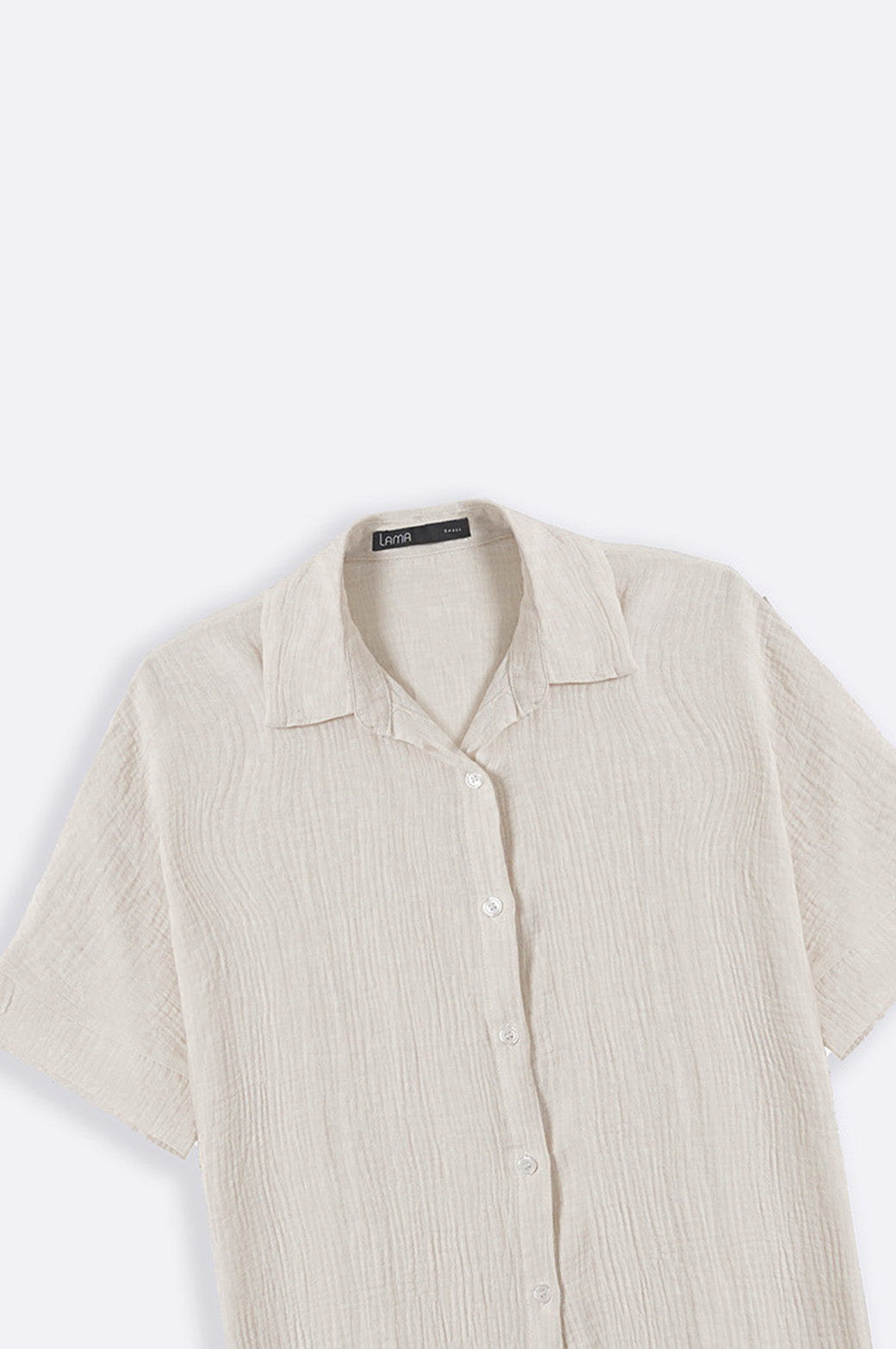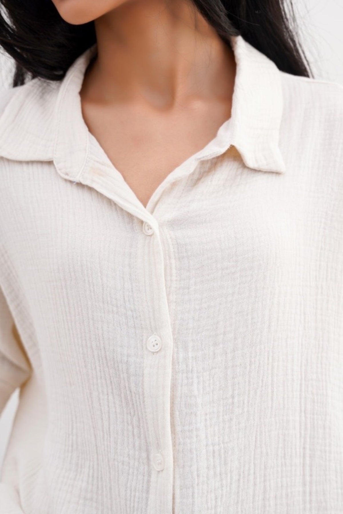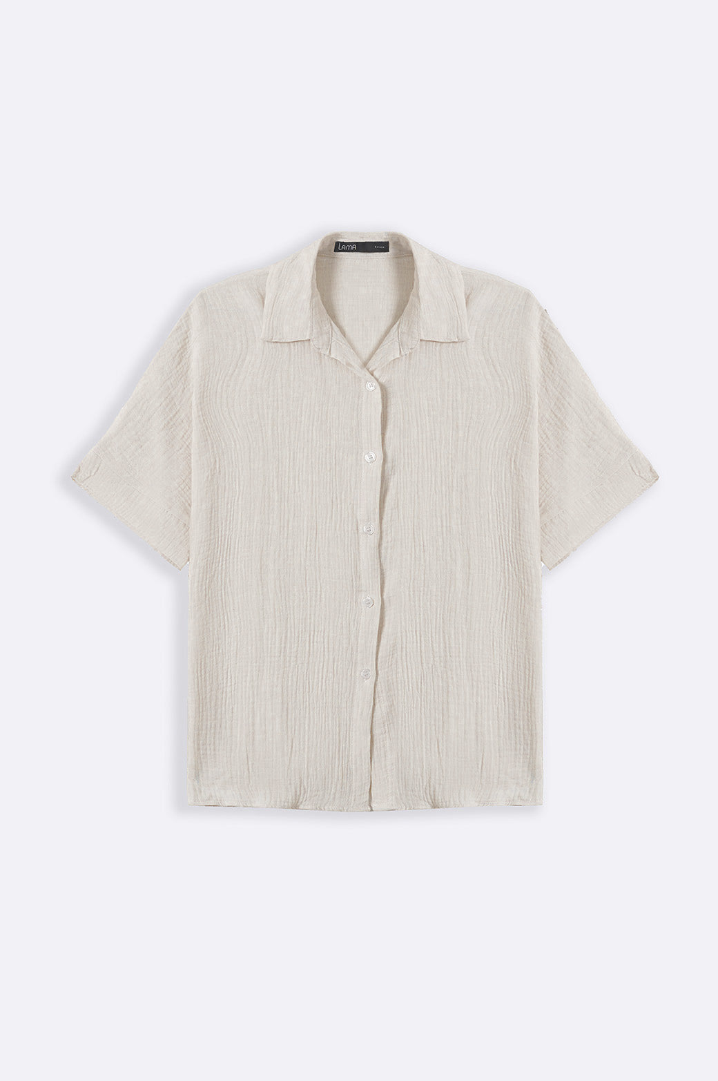 Design details: Solid muslin collared button down blouse with short sleeves. One piece batwing cutline without an armhole.