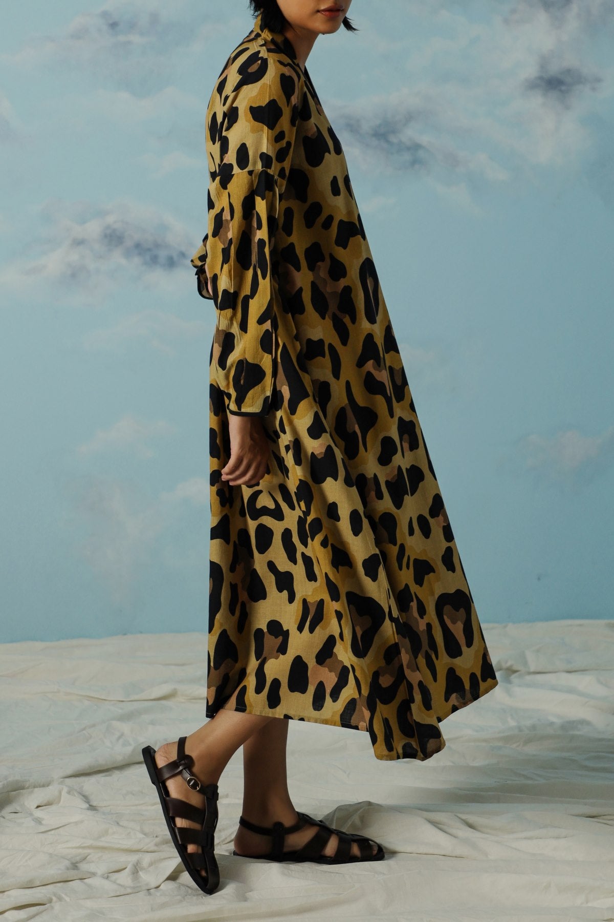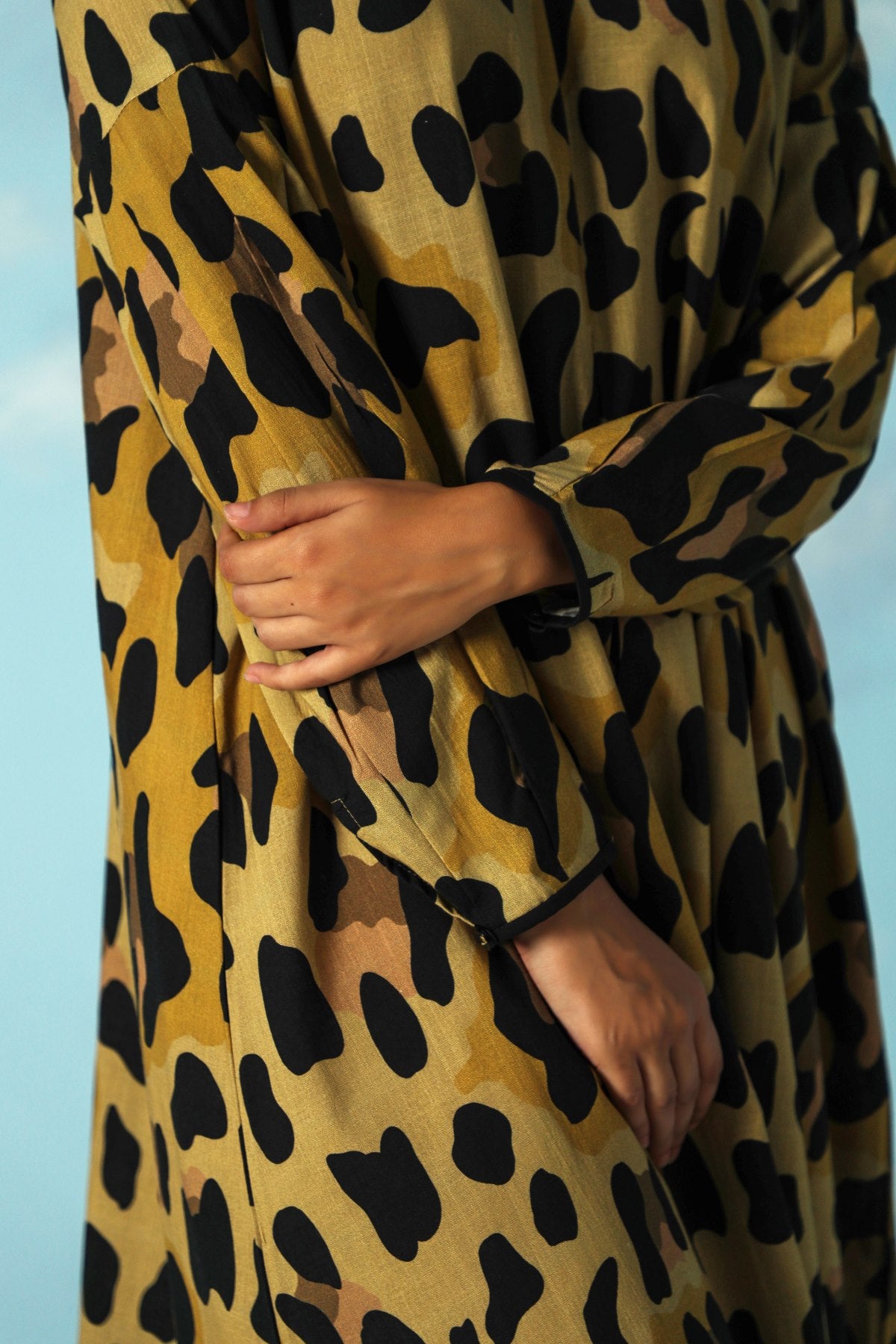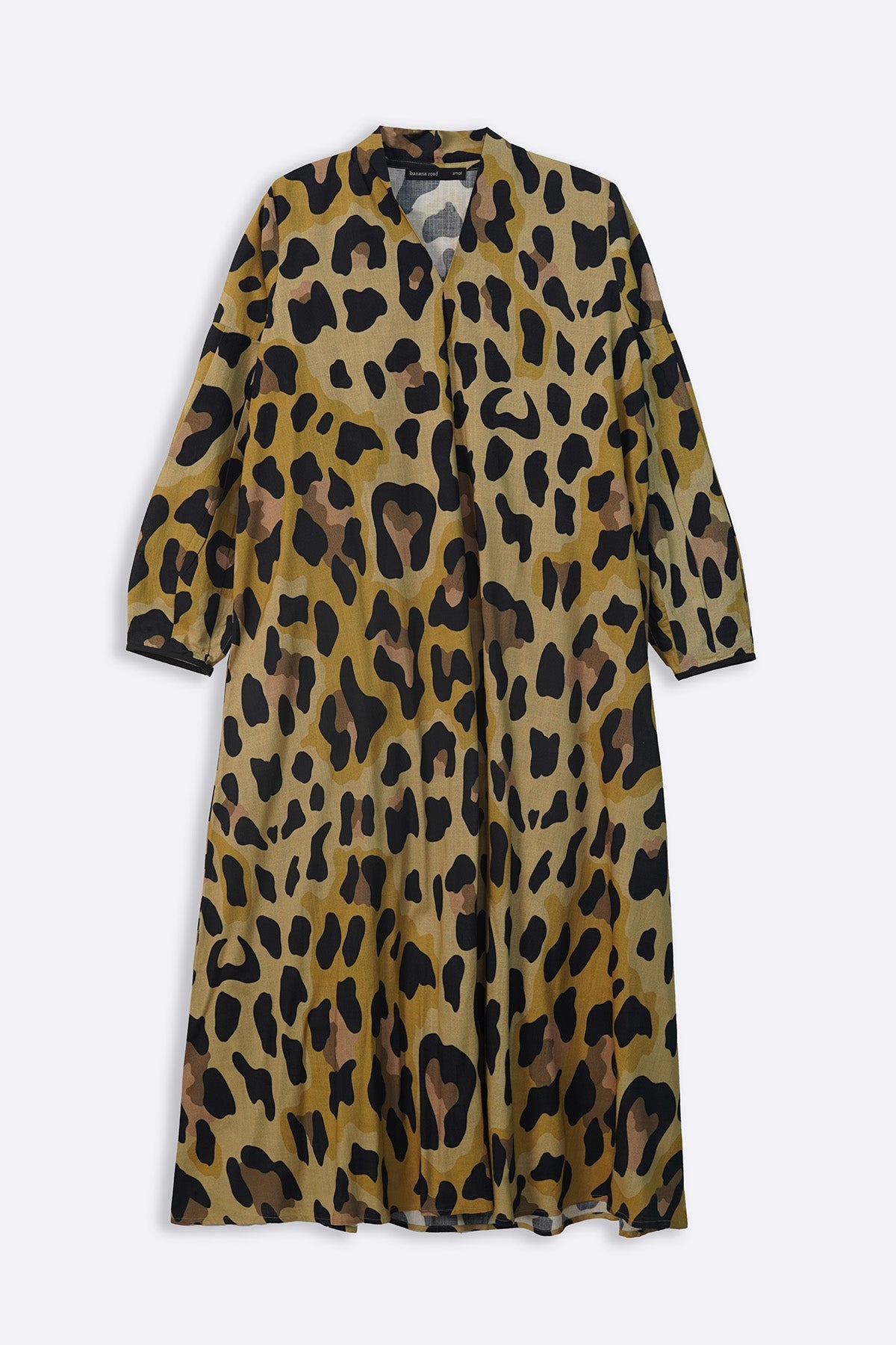 Design details: Long printed V-neck dress with front box pleat, lantern sleeves and side pockets.