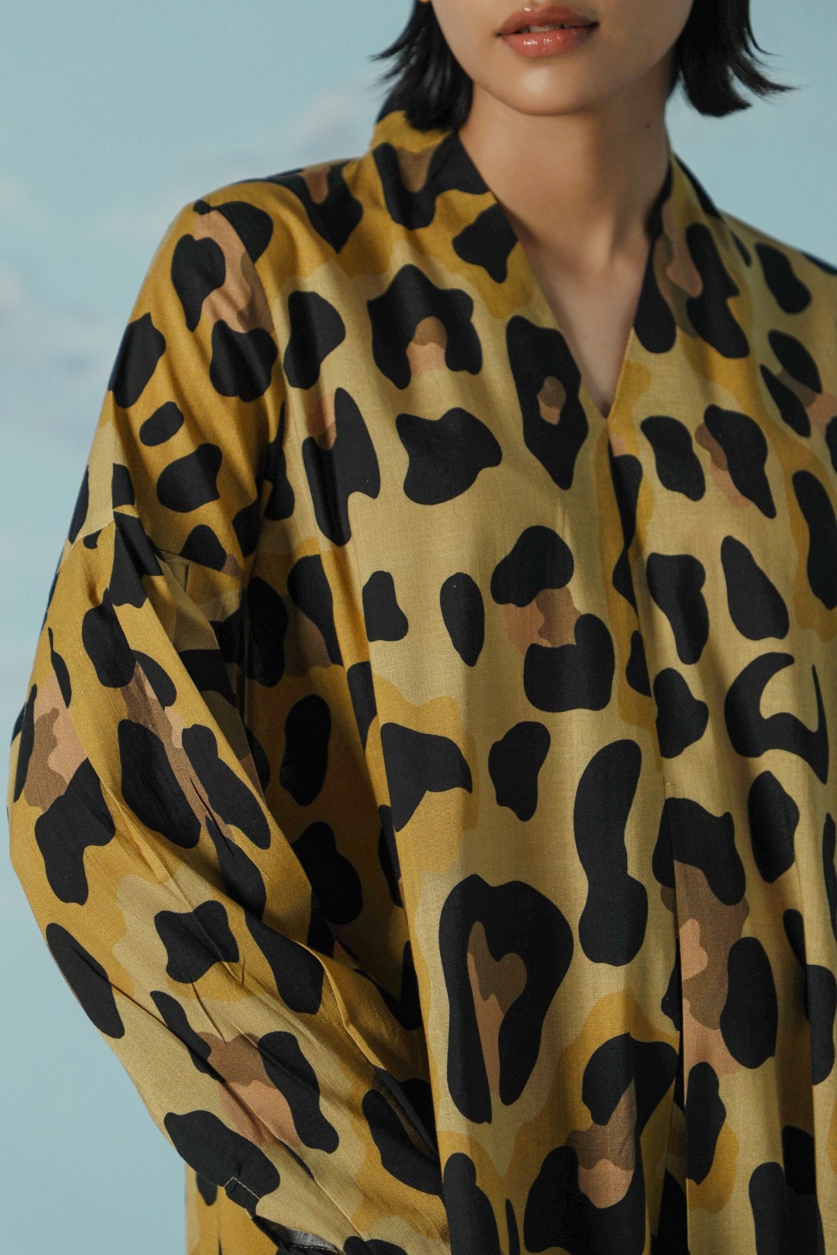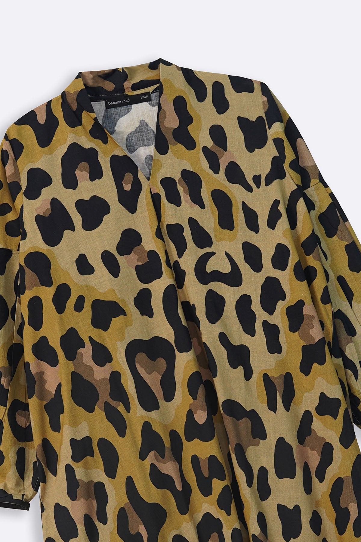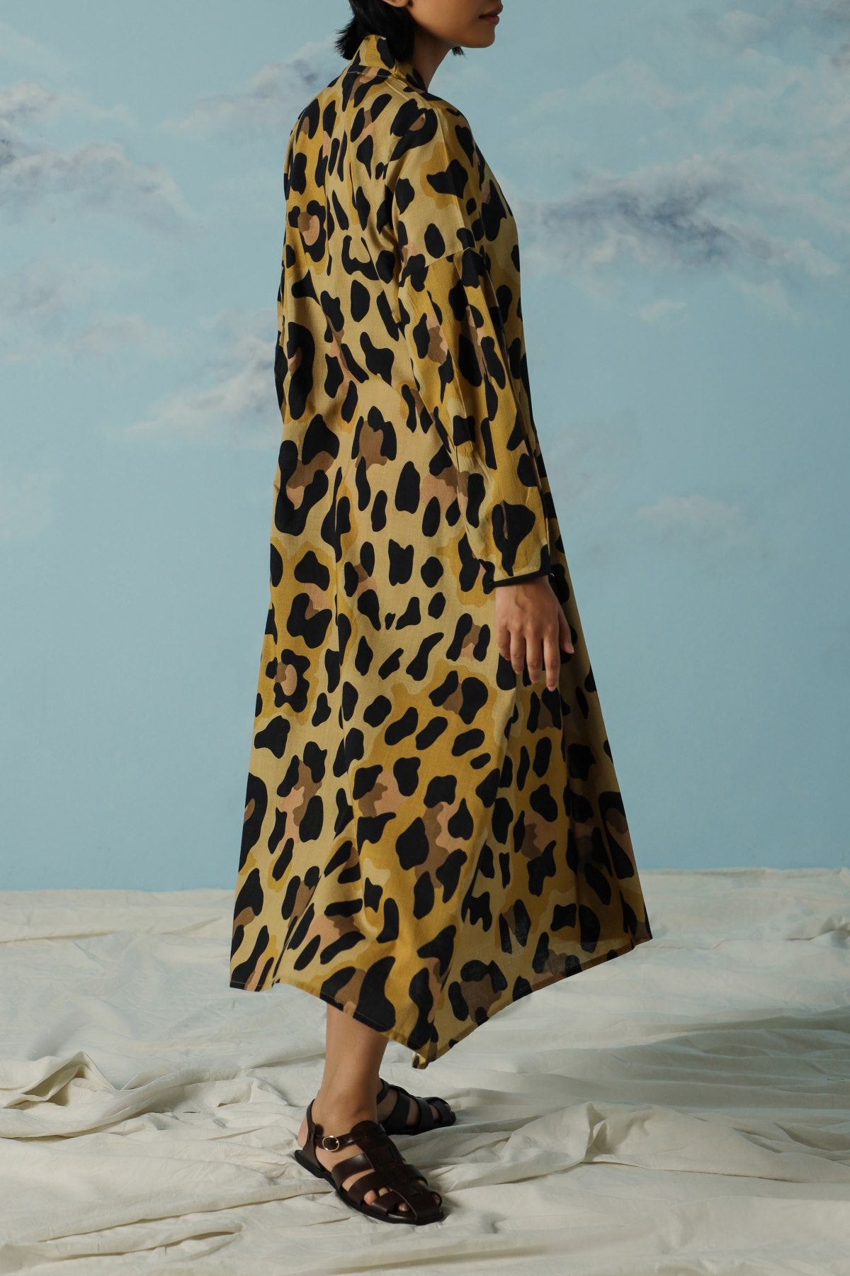 Design details: Long printed V-neck dress with front box pleat, lantern sleeves and side pockets.