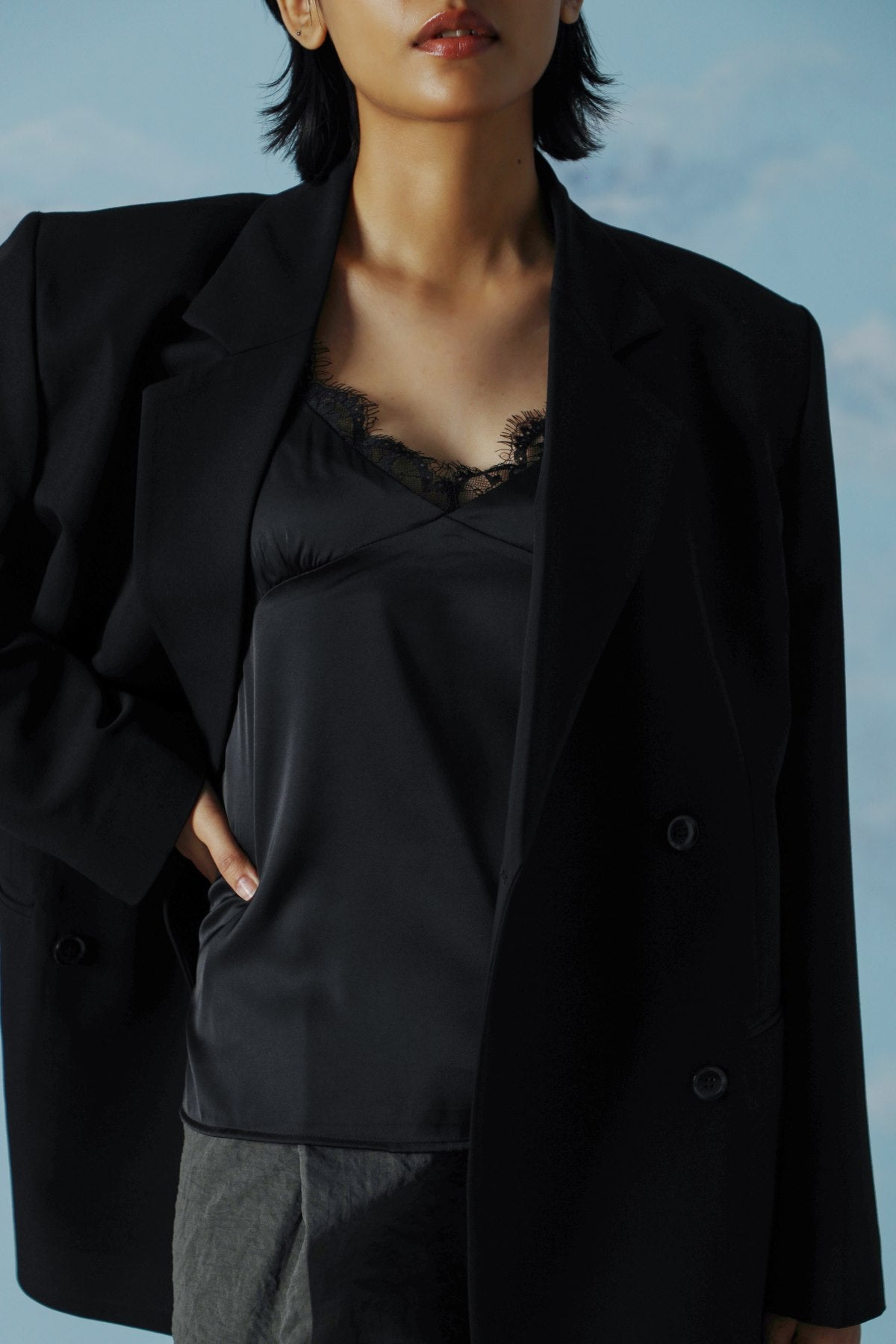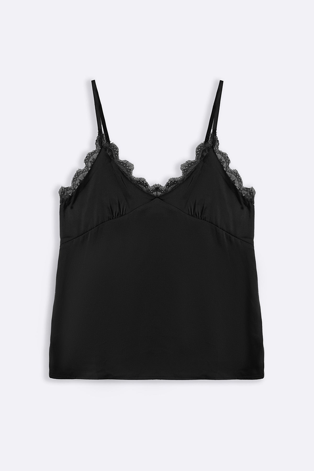 Design details: Silk camisole top with lace trim at the neckline, side slits, and adjustable straps.