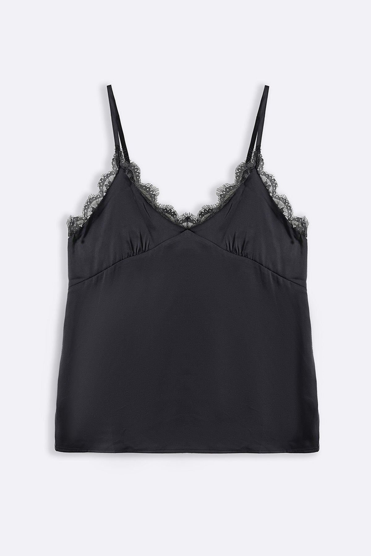 Design details: Silk camisole top with lace trim at the neckline, side slits, and adjustable straps.