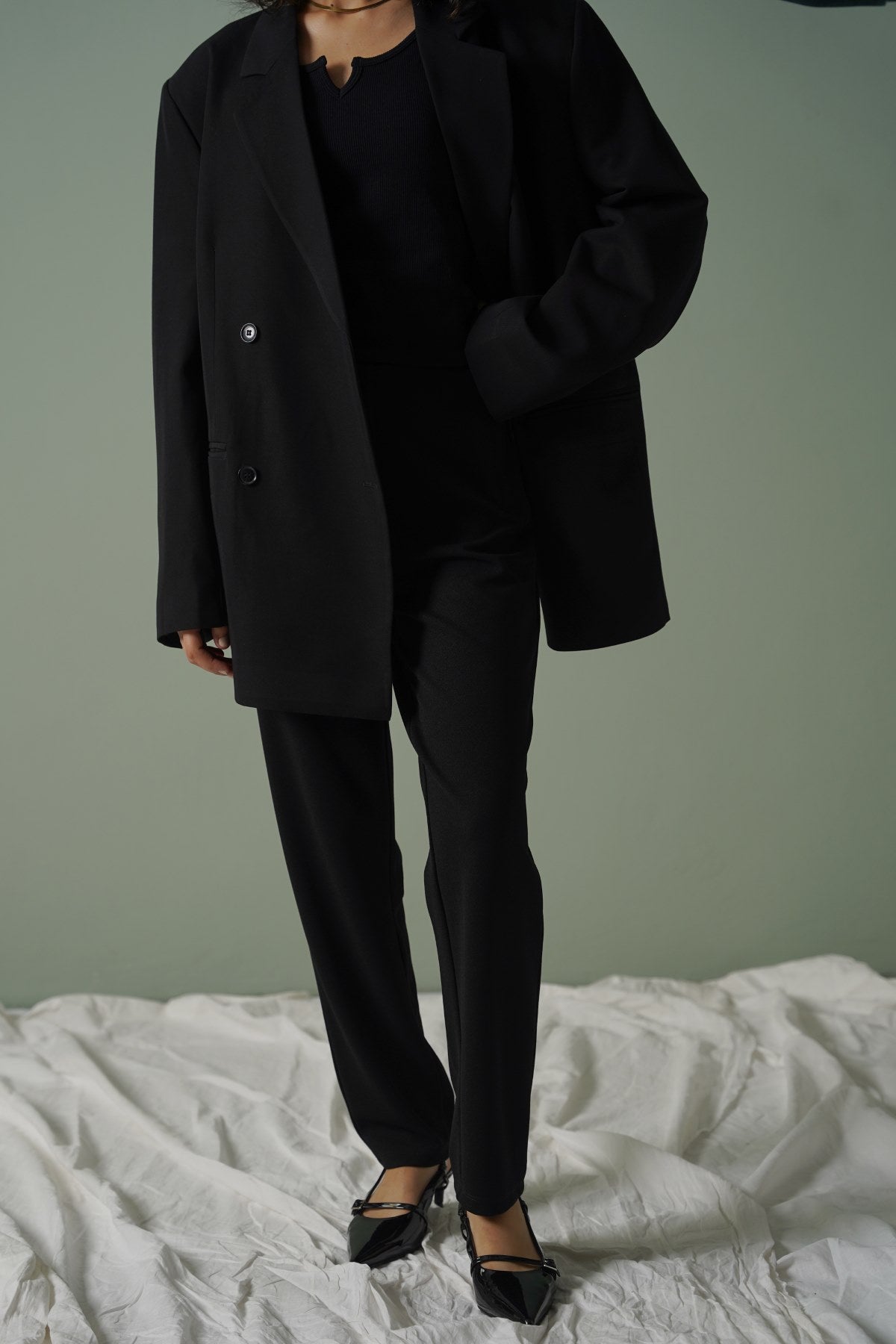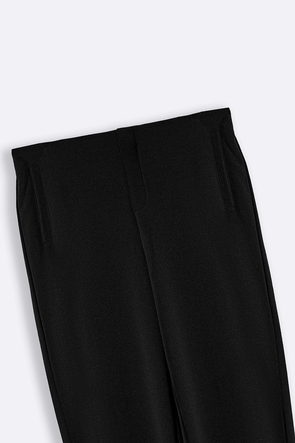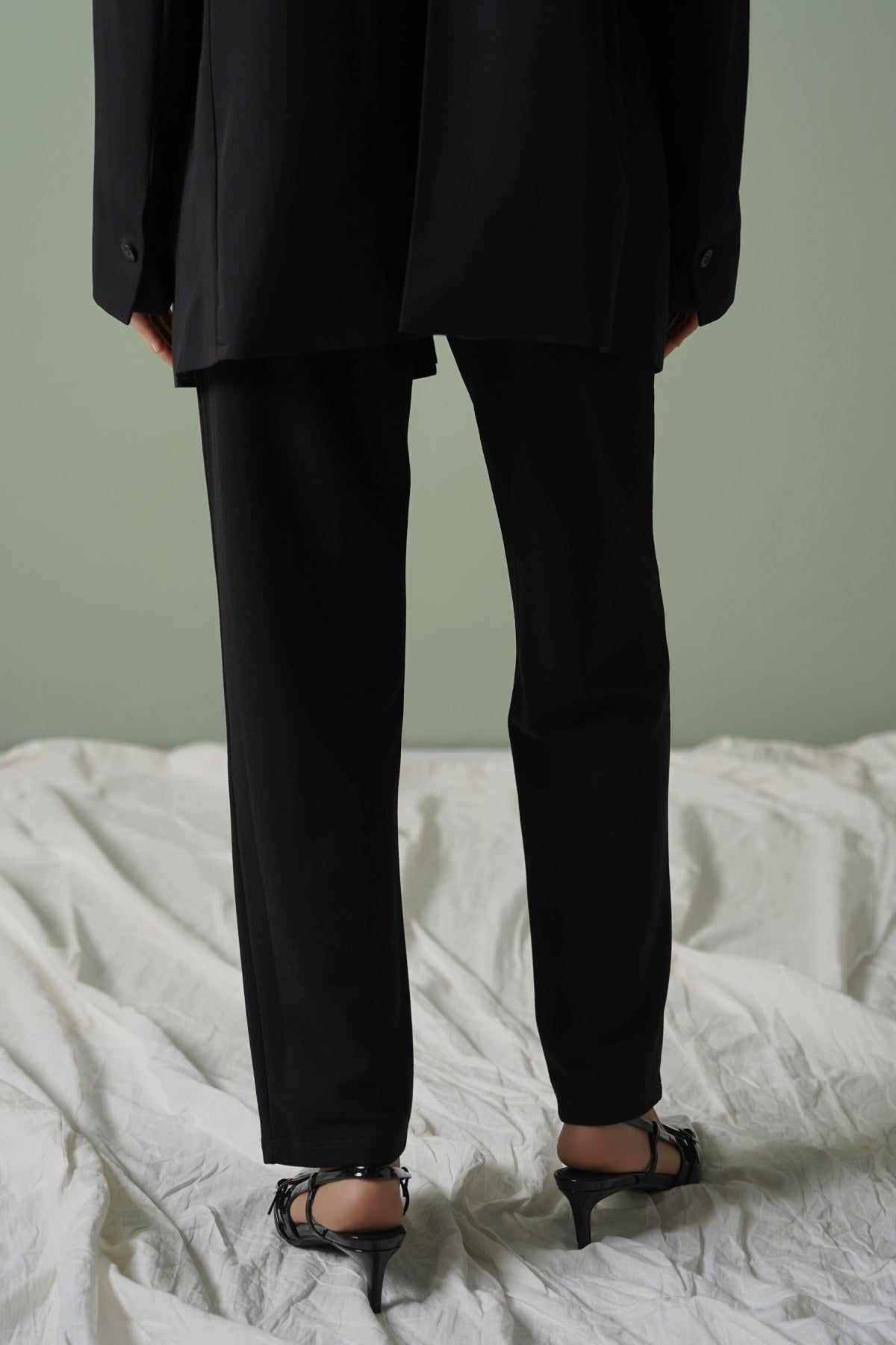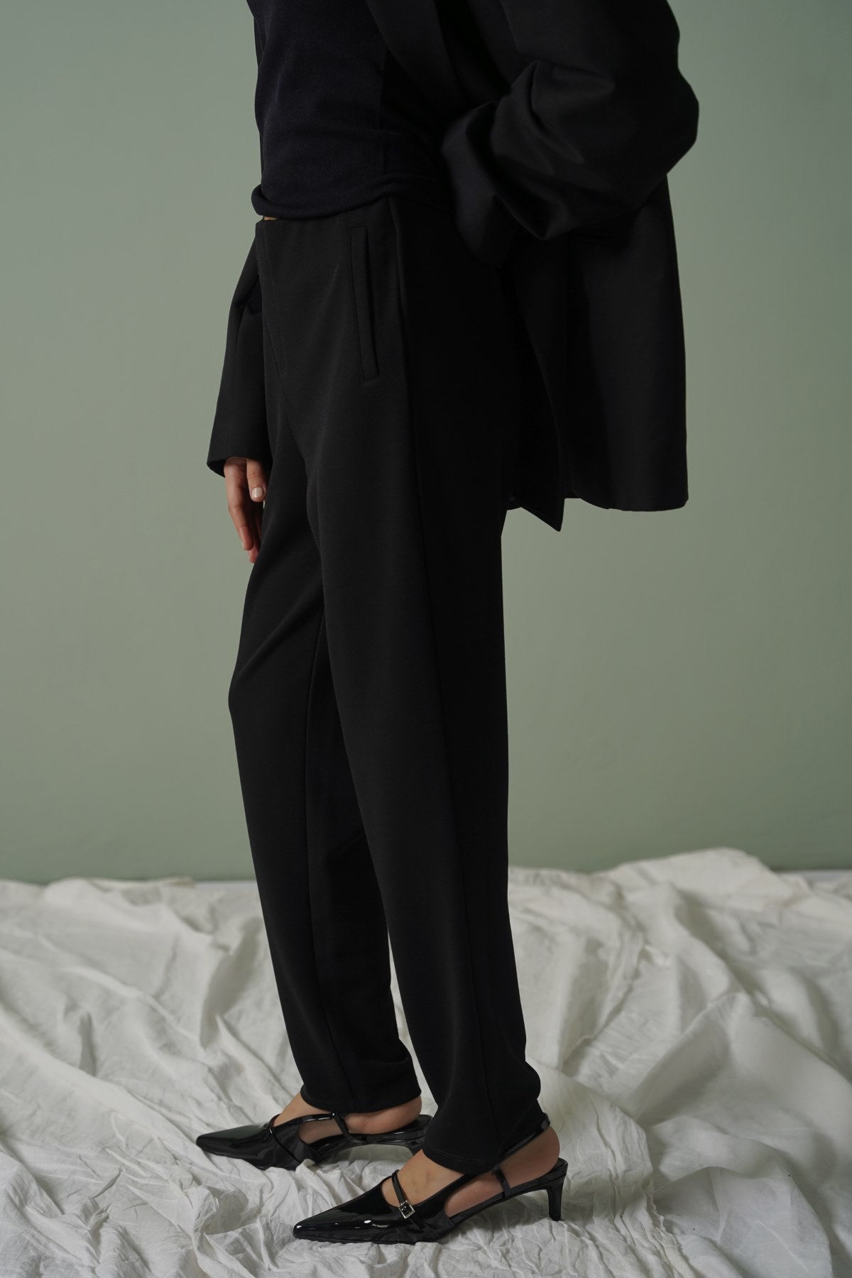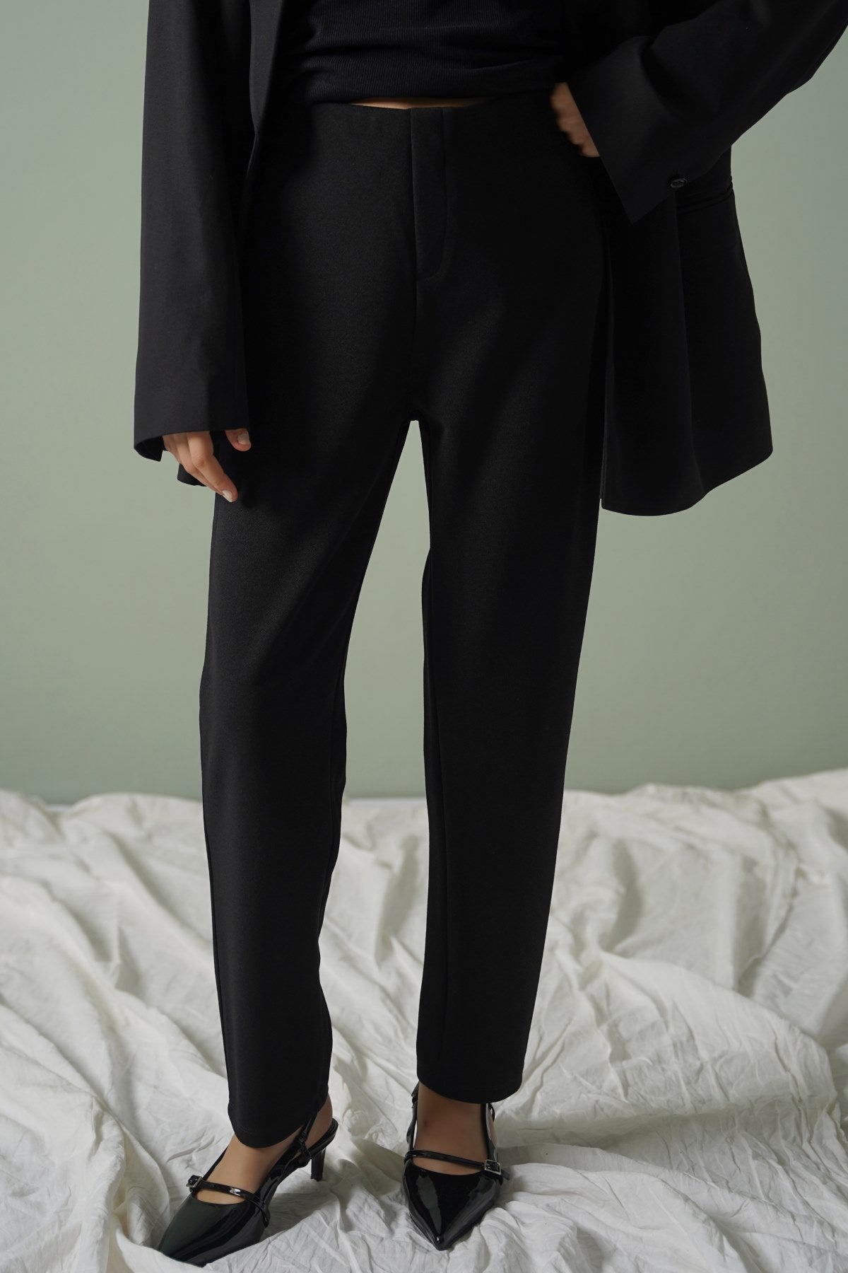 Design details: Slim tapered stretch trousers with mock fly and faux side pockets for a sleek, pull-on look.