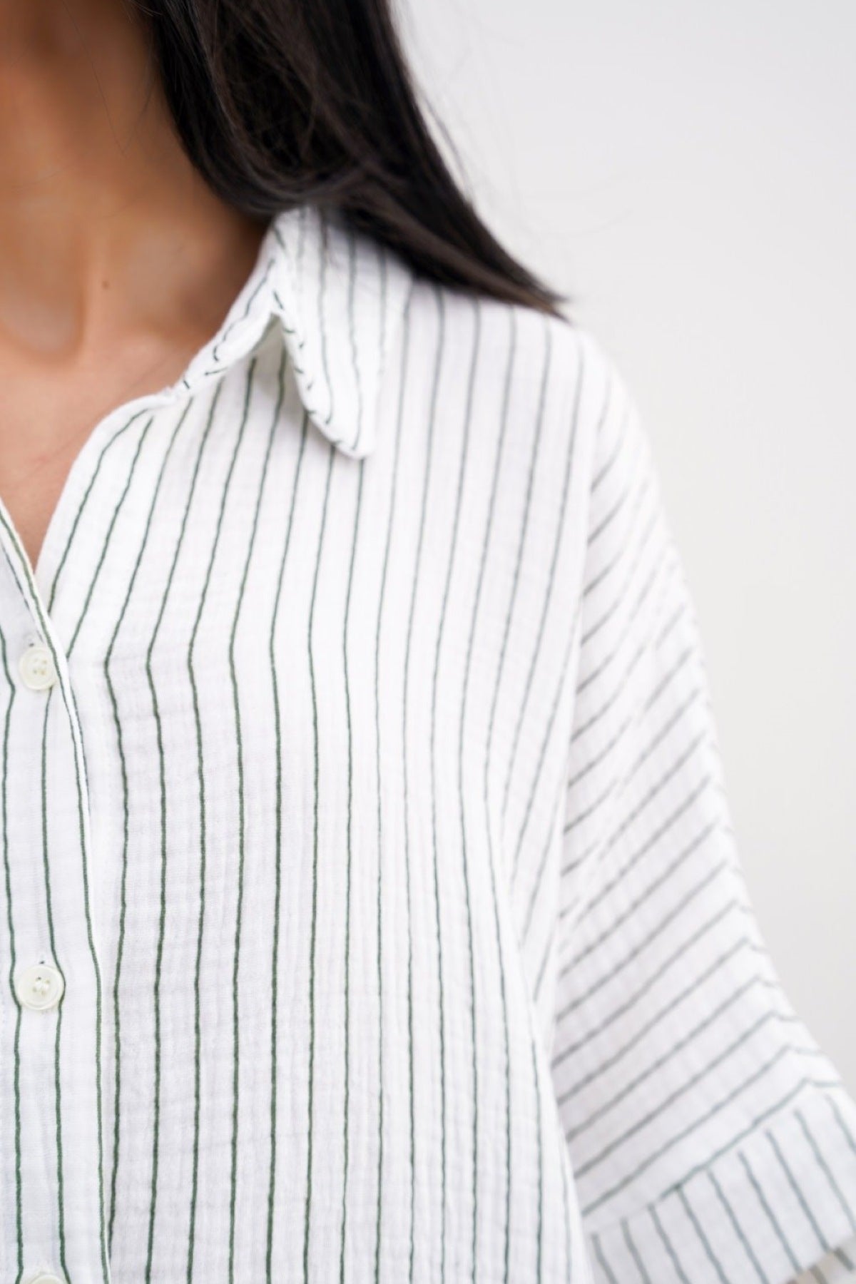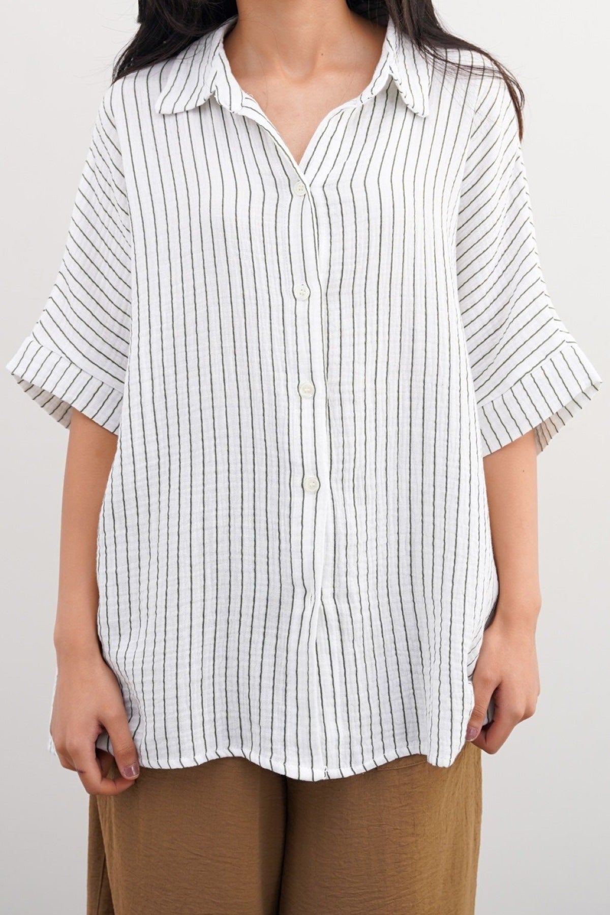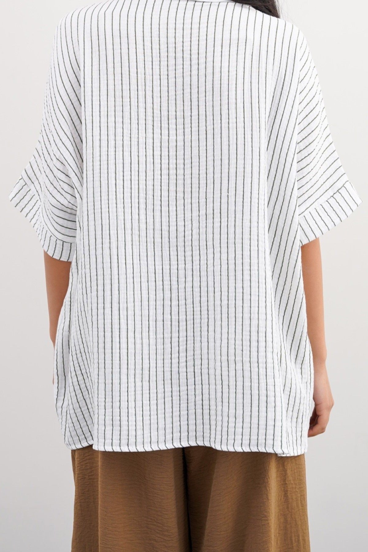 Design details: Striped muslin collared button down blouse with short sleeves. One piece batwing cutline without an armhole.
