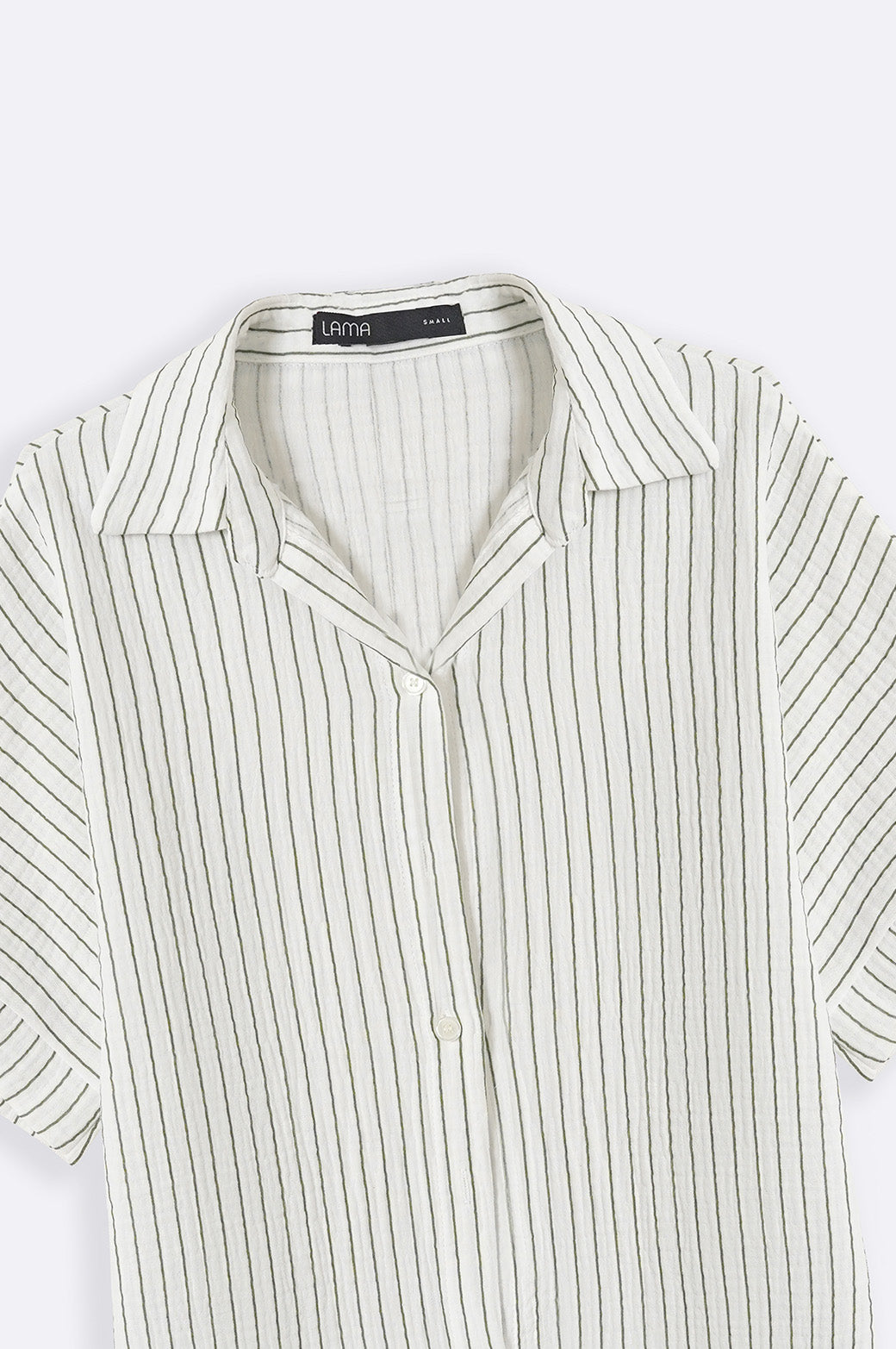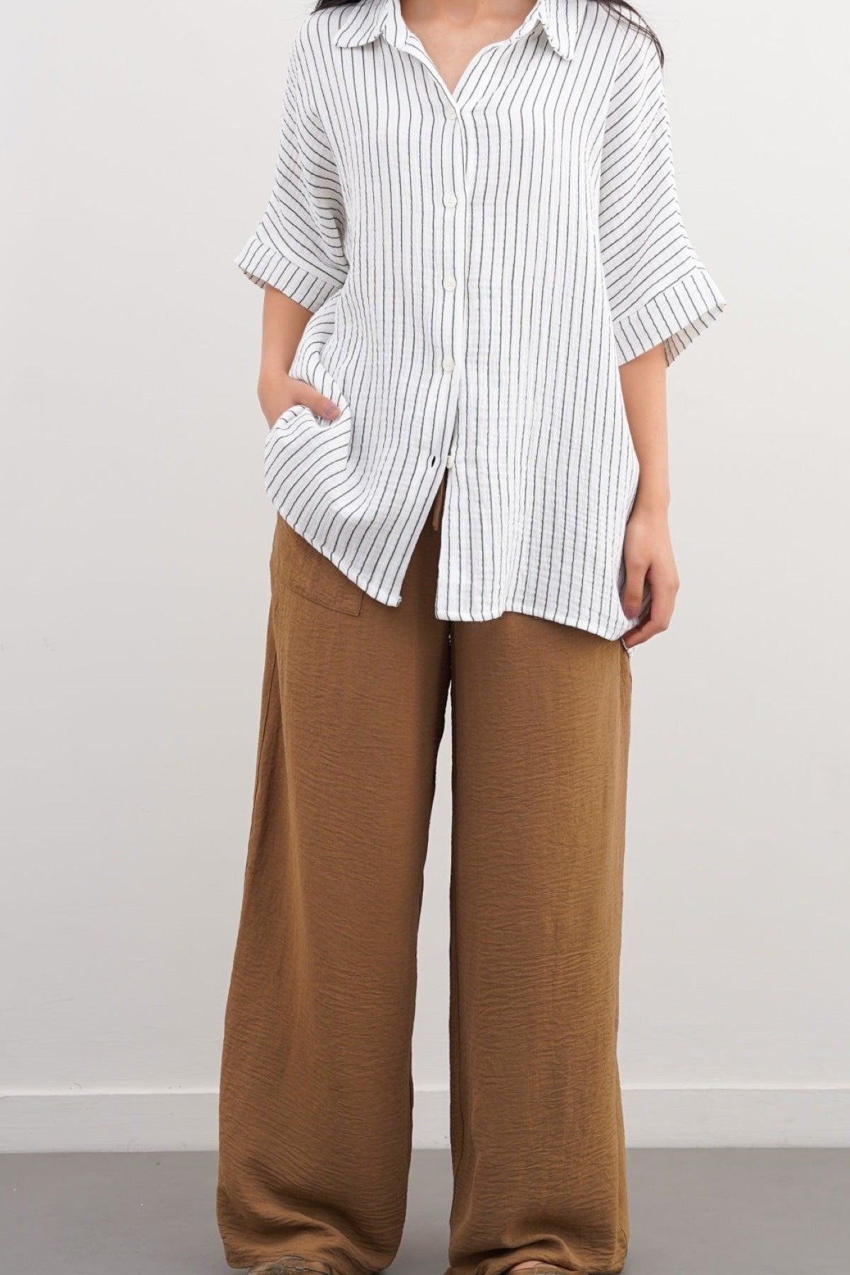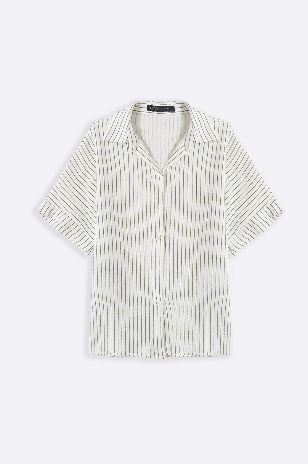 Design details: Striped muslin collared button down blouse with short sleeves. One piece batwing cutline without an armhole.