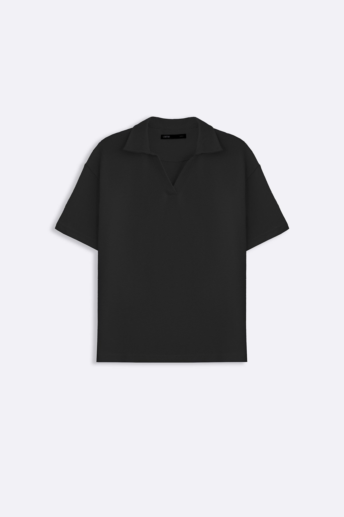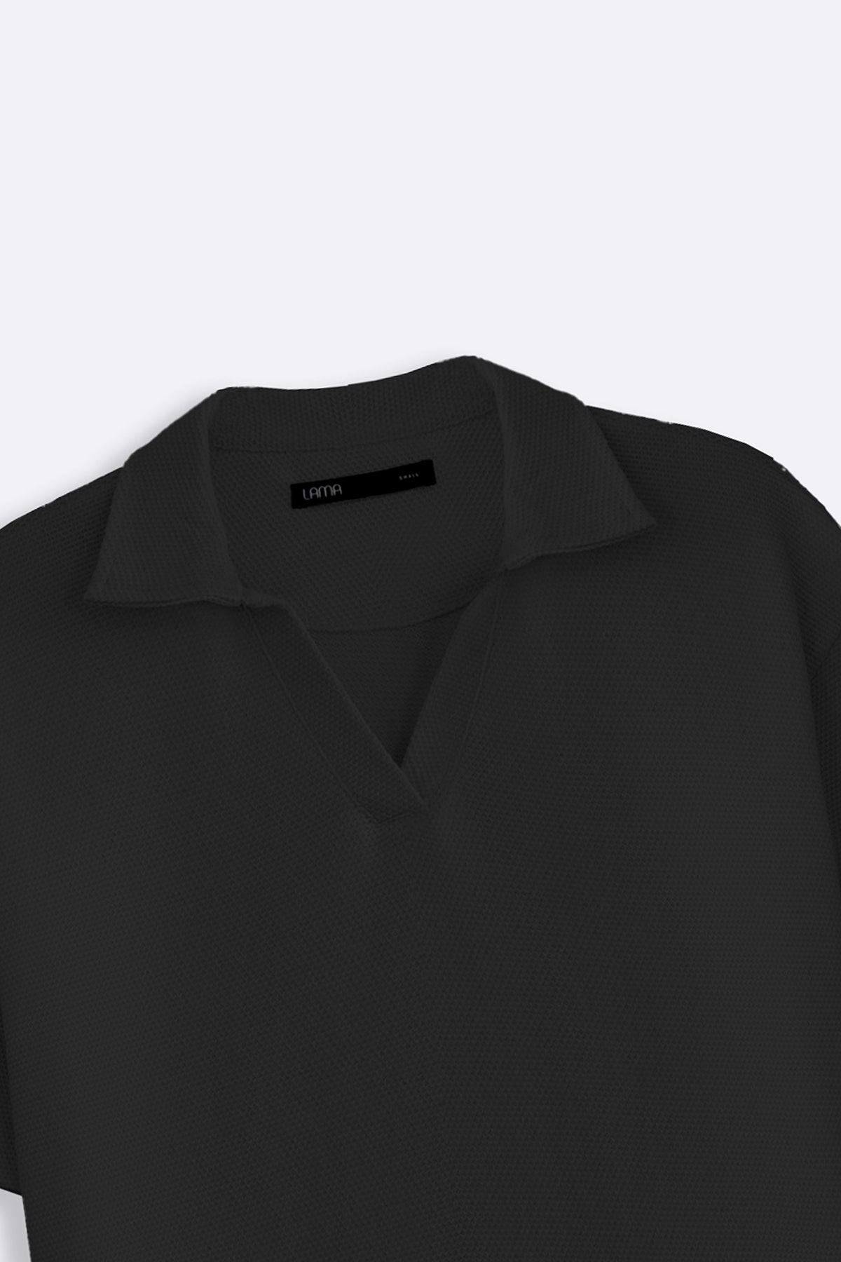 Design details: V-neck jacquard collared polo with short sleeves and side slits.