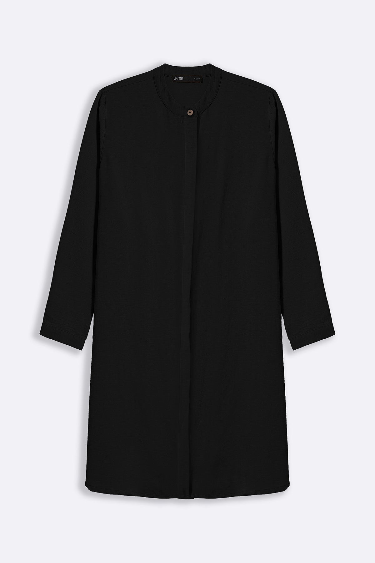 Design details: Tunic with band collar, cuffed long sleeves, and a hidden placket button closure.
