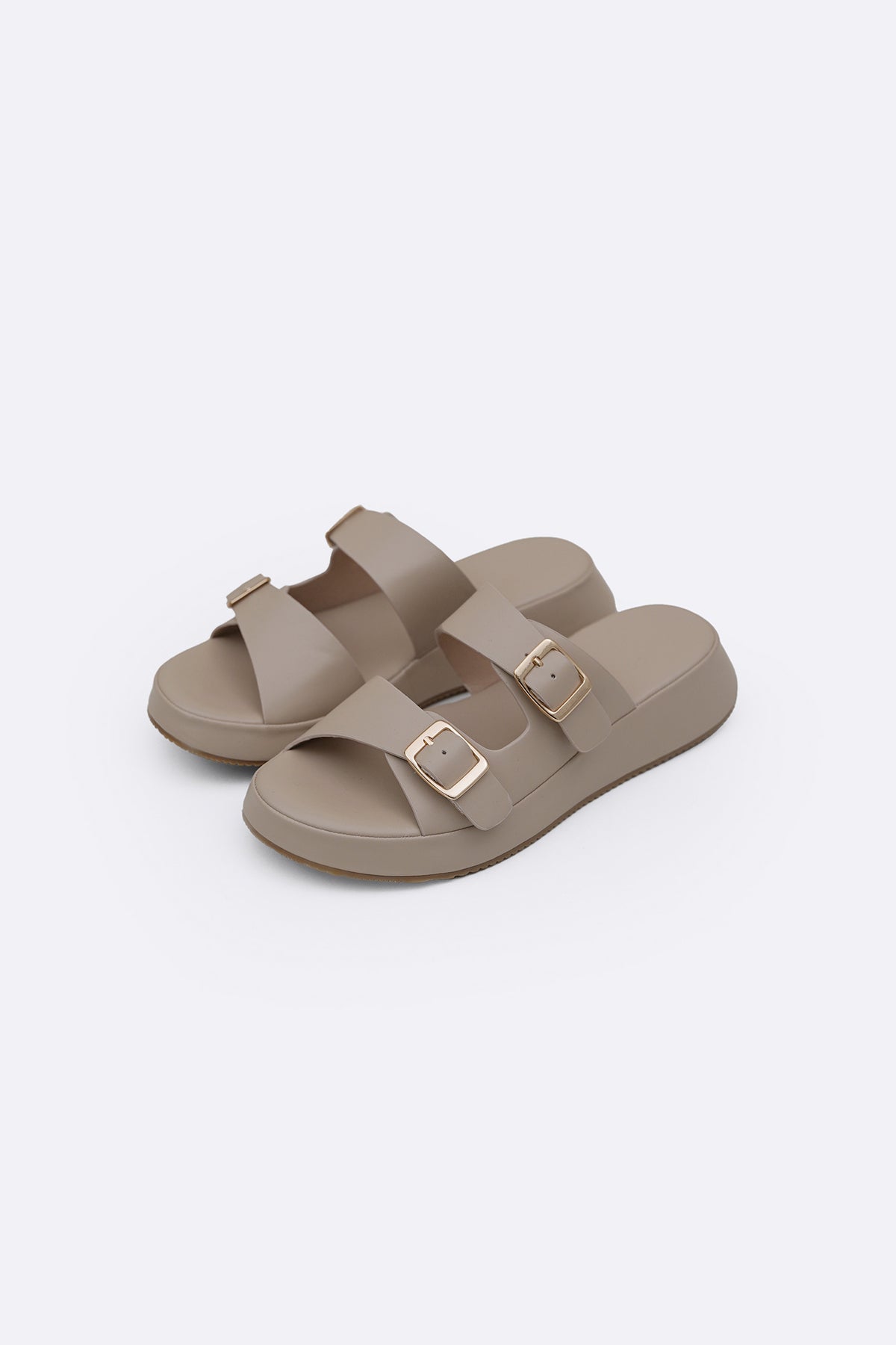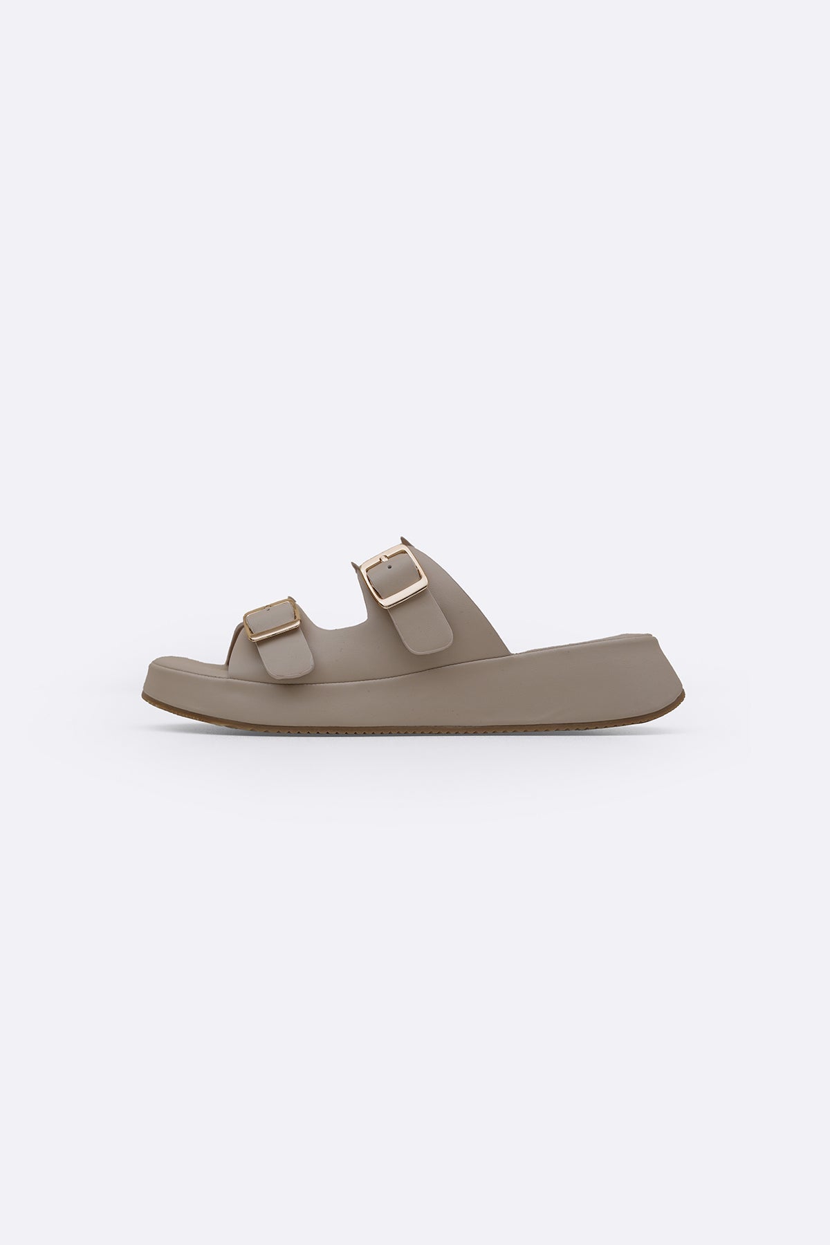 Design details: Comfortable cushioned monotone slides with gold buckles and lightweight anti-slip outsole.