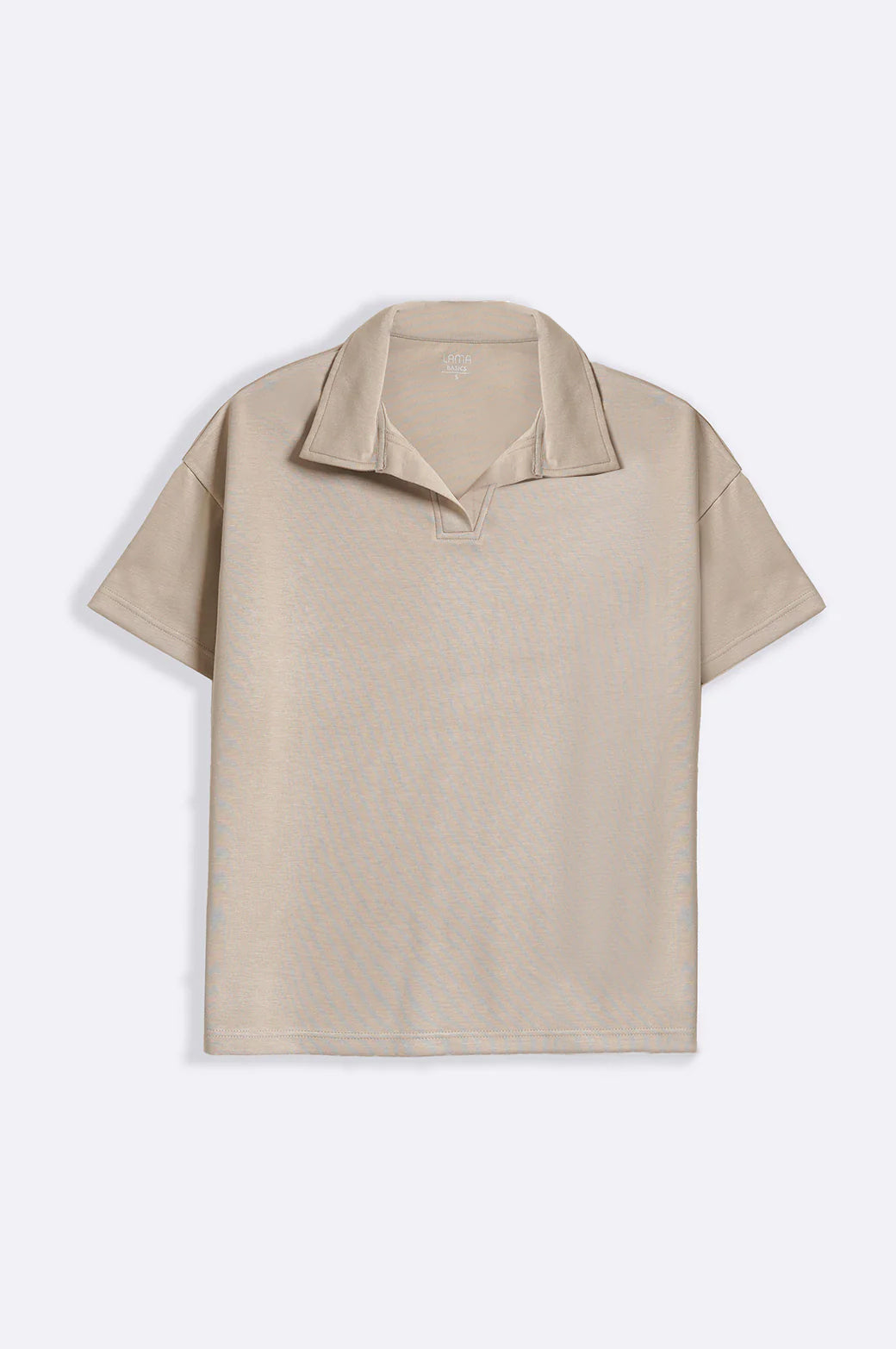Design details: Johnny collar polo made of neoprene fabric with short sleeves featuring side slits