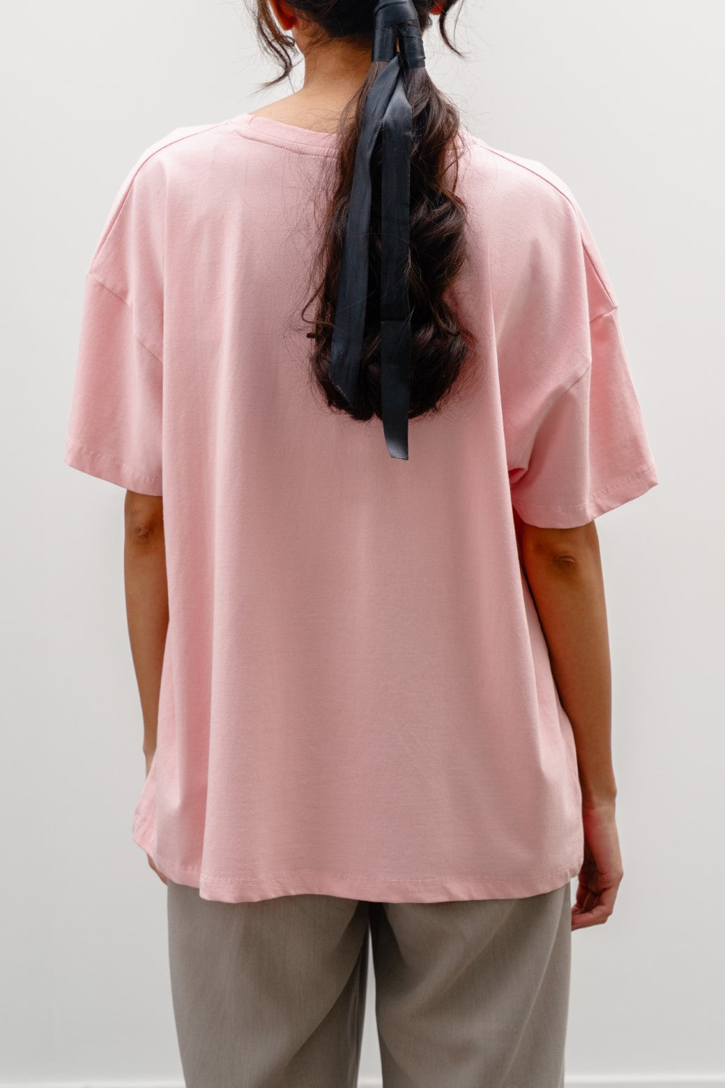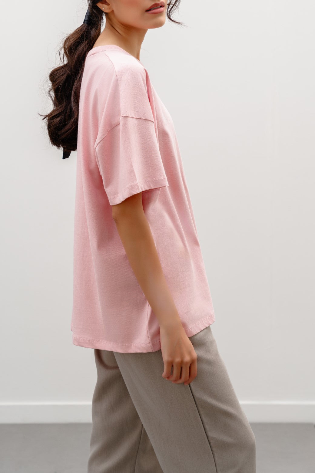 Design details: Printed crew neck, drop shoulder, short sleeves.